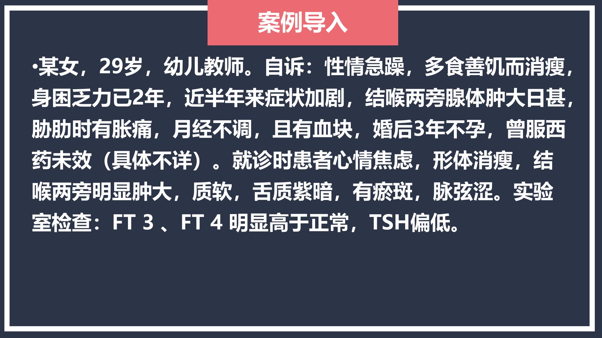 29岁女性幼儿教师性情急躁、多食善饥、消瘦乏力2年近半年症状加剧腺体肿大月经不调且不孕曾服西药未效。就诊时见心情焦虑、形体消瘦、腺体肿大质软、舌质紫暗有瘀斑、脉弦涩实验室检查示FT3、FT4高、TSH低确诊为瘿病(又称“瘿气”俗称“大脖子病”)。瘿病多见于高原地带及山区以中青年女性多见分为气瘿、肉瘿、血瘿、筋瘿和石瘿等。病因与摄碘、药物、化学物质、自身免疫有关基本病机为气、痰、瘀互结经络阻塞病位在颈前喉结两侧与肝、心、脾、胃、肾相关。治疗以理气活血化痰散结为主取任脉、手足阳明经及局部穴如瘿肿局部、天突、膻中等配穴依证型加减。其他疗法包括皮肤针、耳针、电针等。针灸治疗同时需补充碘、调养情志甲状腺明显肿大出现压迫症状或甲亢危象时需考虑手术或综合抢救。