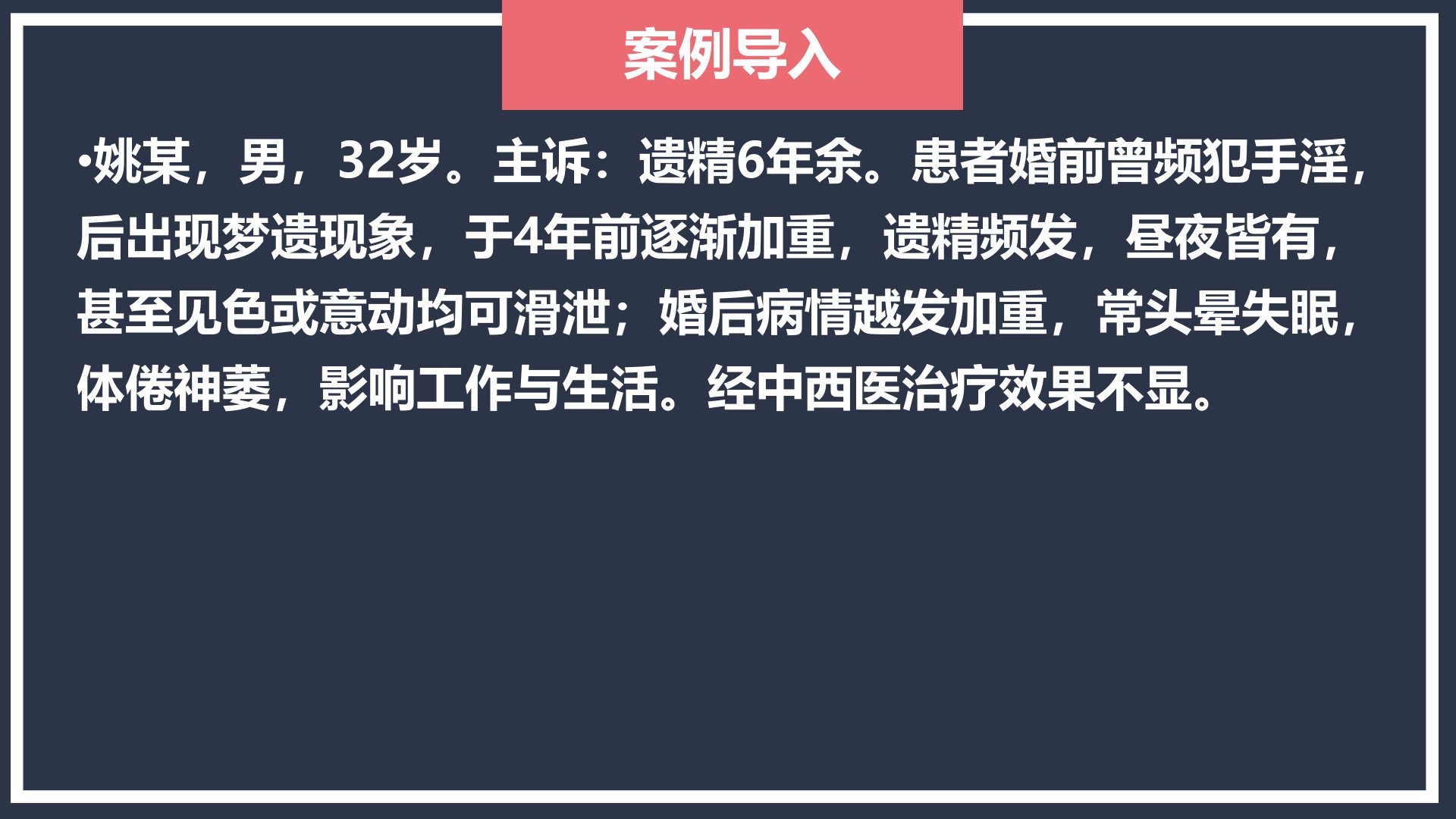 姚某32岁男性主诉遗精6年余病情逐渐加重昼夜皆有见色或意动即可滑泄严重影响工作生活中西医治疗均不显效。诊见患者神疲肢冷面色无华形体瘦削舌淡苔白脉沉细无力。遗精指不因性生活而精液频繁遗泄的病证多见于男子性功能障碍、前列腺炎等疾病。其发生与情欲过度、劳倦太过等因素有关基本病机为肾失封藏、精关不固病位在肾与心、脾、肝关系密切。辨证要点包括频繁遗精以及阴虚火旺、湿热下注、心脾两虚、肾虚不固等不同证型的表现。治疗以调肾固精为主取任脉、足三阴经穴如关元、志室、肾俞等。配穴根据证型选择如阴虚火旺配太溪、太冲等。其他治疗包括耳针法、穴位注射法、皮肤针法。针灸治疗遗精疗效较好但需同时治疗原发病并做好心理疏导坚持体育锻炼。