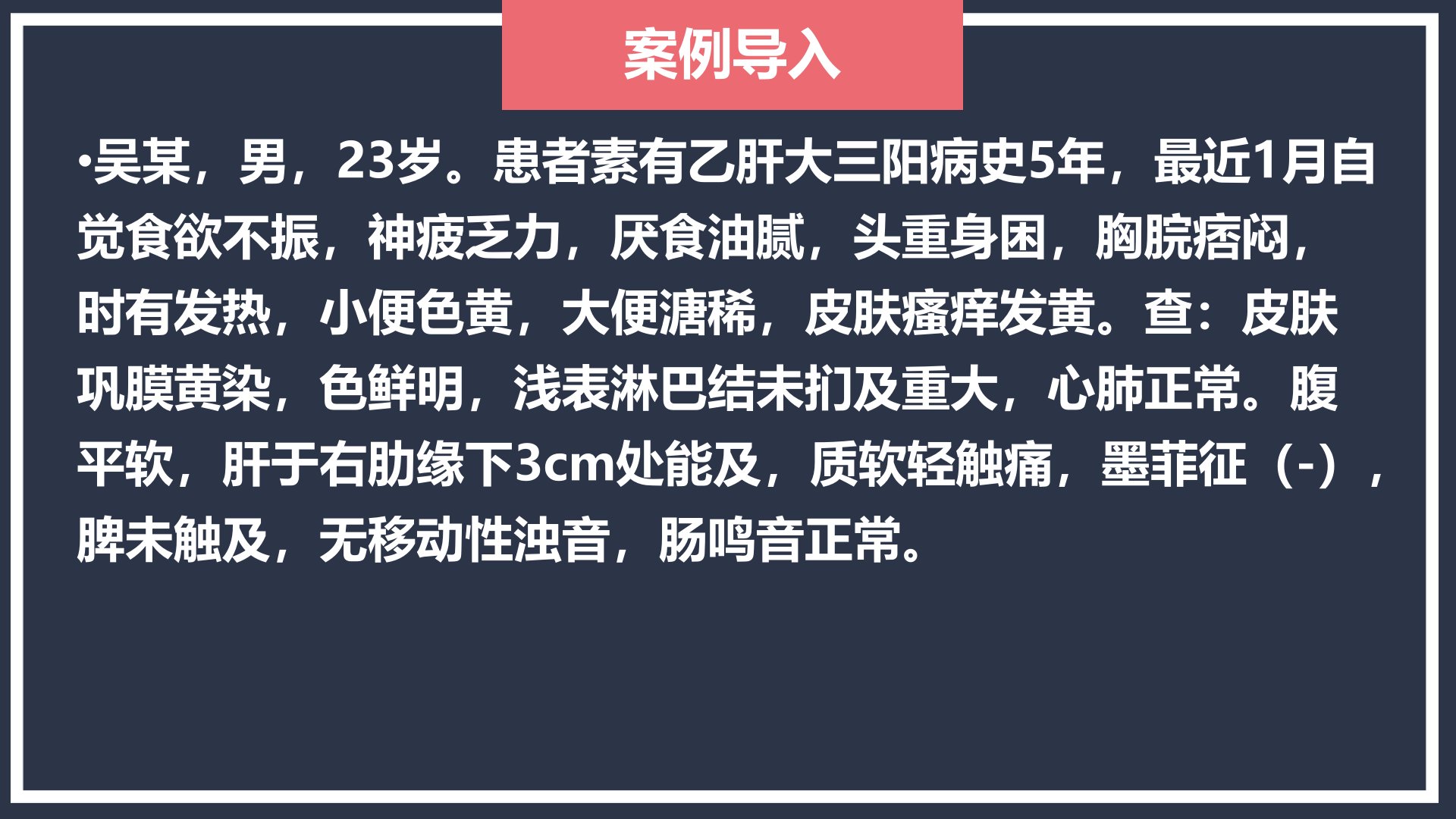 吴某23岁男性有5年乙肝大三阳病史近期出现食欲不振、神疲乏力、厌食油腻、头重身困等症状伴有发热、小便色黄、大便溏稀、皮肤瘙痒发黄。查体示皮肤巩膜黄染色鲜明肝于右肋缘下3cm处能及质软有轻触痛墨菲征阳性。肝功能检查显示TBILI、DBIL、ALT、AST等指标均异常。腹部B超提示肝肿大。此为典型黄疸病例黄疸以目黄、身黄、小便黄为主症多见于肝细胞性、阻塞性、溶血性黄疸等疾病。黄疸发生与感受外邪、饮食不节、脾胃虚弱等因素有关分为阳黄和阴黄两大类基本病机是湿浊阻滞胆汁不循常道而上泛于目。治疗以清热化湿、利胆退黄为主取胆的背俞穴、下合穴为主穴如胆俞、阳陵泉等配穴根据辨证结果选择。其他治疗包括耳针法、穴位注射法。针灸治疗急性肝炎导致的黄疸效果较好但需严格隔离。饮食宜清淡新鲜忌肥甘厚腻、甘甜、饮酒和辛辣刺激食物。