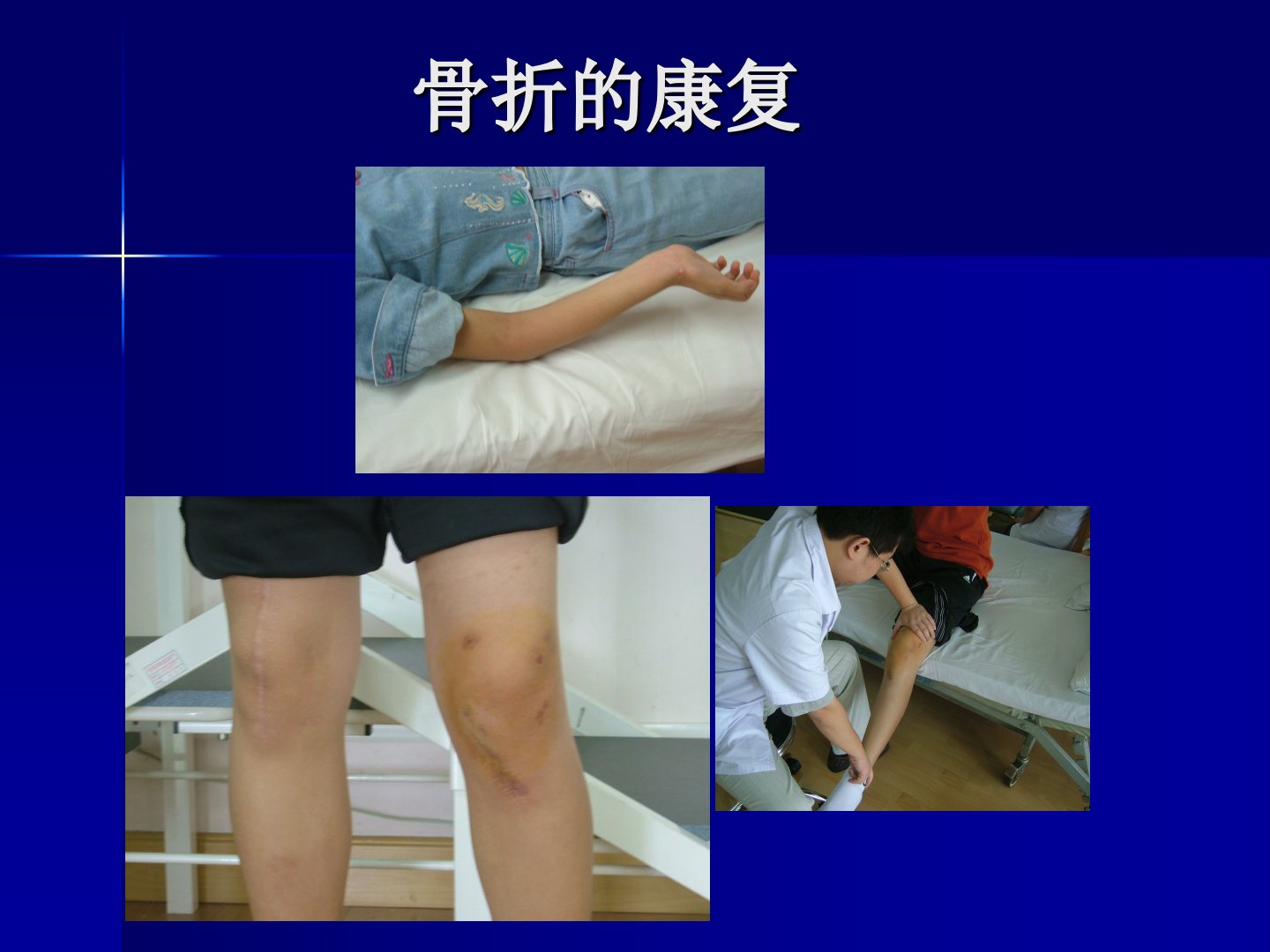 骨折治疗涉及多种固定方法包括牵引(皮牵引、骨牵引)、内固定(钢板、螺丝钉等)和外固定(外固定器、石膏等)。骨折愈合分正常、延迟、不愈合和畸形愈合四类不愈合X线表现为骨折线清晰、间隙增宽等。骨折康复面临废用肌萎缩、关节挛缩等问题主要源于制动、骨折本身和治疗。制动会抑制关节软骨营养致其退行性变还会致骨骼骨质疏松、韧带肌腱糖胺多糖和水分丢失等。骨折康复可促进水肿吸收、减轻肌肉萎缩、预防关节僵硬等常用评定方法有骨折对位对线检查、关节活动范围测量等。骨折愈合是骨再生过程康复治疗分早期和后期。固定期(早期)目标是消除肿胀、缓解疼痛方法包括主动运动、物理因子治疗等;后期目标是消除残存肿胀、增加关节活动范围和肌力方法主要是运动疗法。功能训练强度和时间应循序渐进医生需科学判断运用。此外不同部位骨折康复要点不同如肱骨干骨折、桡骨远端骨折等各有注意事项。