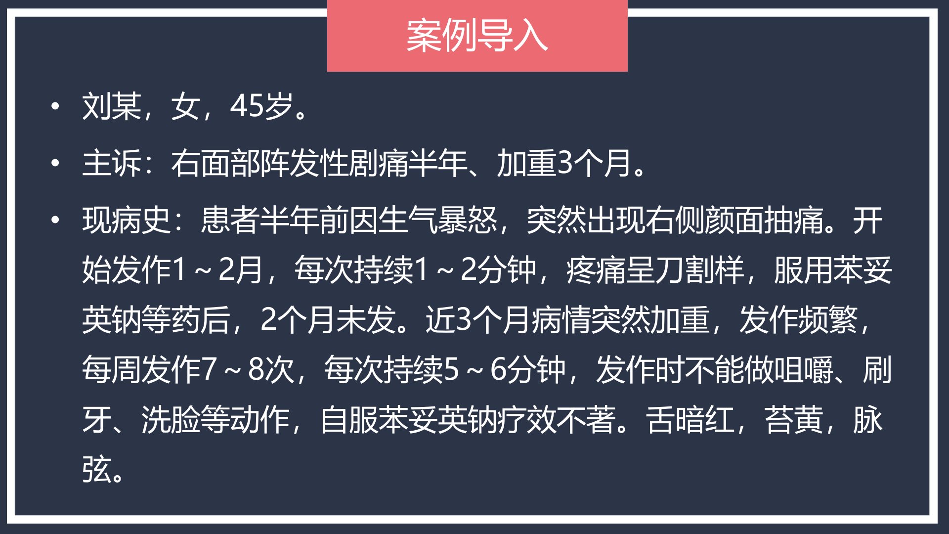 面痛摘要学习目标掌握面痛基本治疗熟悉辨证要点了解其他治疗与按语。疾病概述面痛以眼、面颊部阵发性剧痛为主又称“面风痛”等多发于40岁以上女性右侧多见病情顽固相当于西医学三叉神经痛分原发性和继发性。病因病机与外感六淫、情志失调、外伤等因素有关病机是面部经络气血阻滞或失养病位在面部与手、足三阳经关系密切。辨证要点面部剧烈疼痛呈闪电样等发作不定有扳机点因多种因素诱发。分经络辨证和证型辨证。治疗1基本治疗:通经活络、祛风止痛取手足阳明经穴为主主穴四白等配穴依疼痛部位和证型选取毫针常规针刺。2其他治疗:包括电针法、耳针法、刺络拔罐法、穴位注射法、皮内针法。按语针刺对三叉神经痛止痛效果好针灸是有效方法之一宜采用对症和辨证取穴结合。