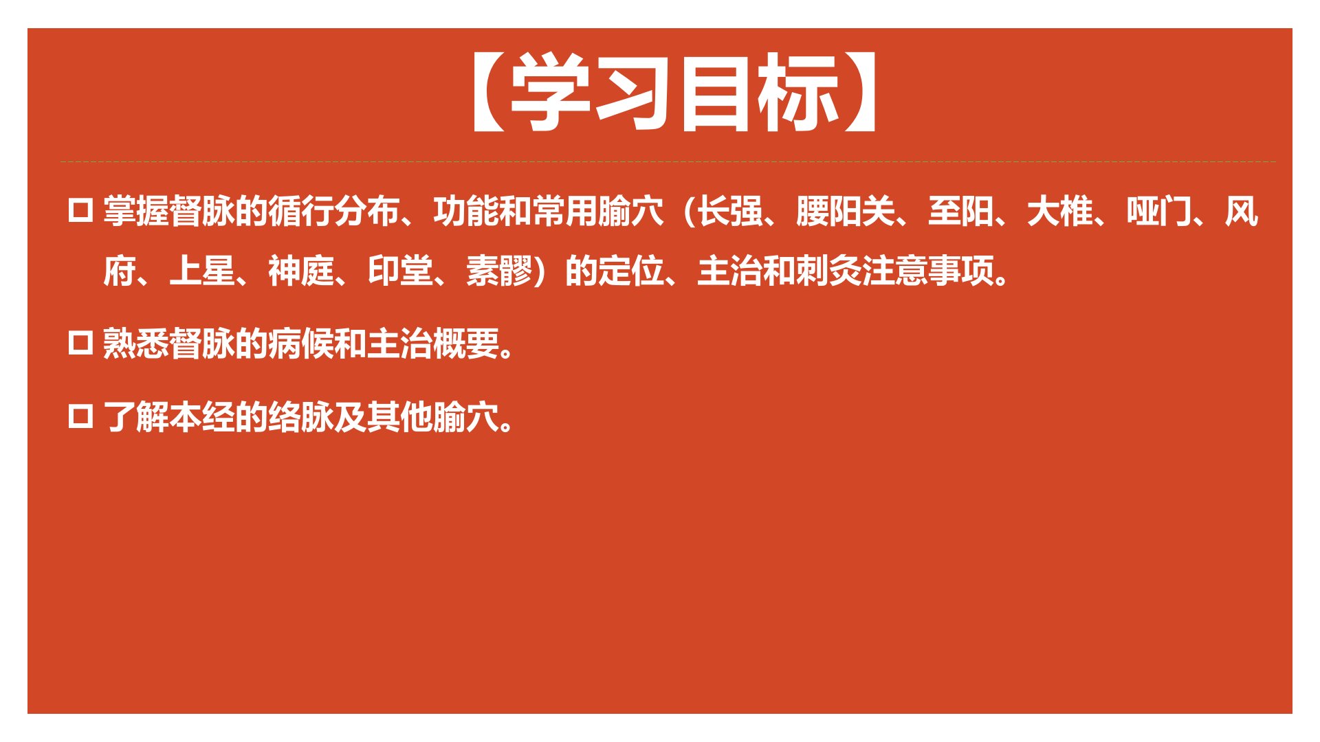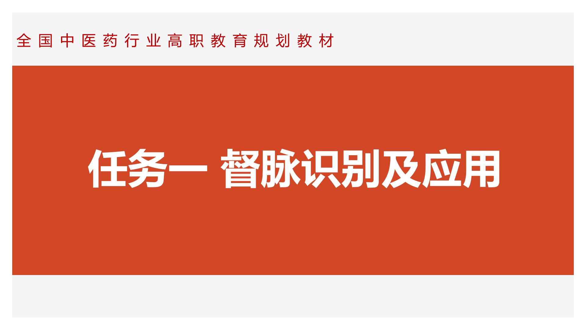 奇经八脉识别及应用任务一督脉识别及应用【学习目标】掌握督脉的循行分布、功能和常用腧穴(长强、腰阳关、至阳、大椎、哑门、风府、上星、神庭、印堂、素髎)的定位、主治和刺灸注意事项。熟悉督脉的病候和主治概要。了解本经的络脉及其他腧穴。督脉主干行于后正中线,“督”,原字为“裻”。《说文解字》释曰:“衣背缝也”。表示此脉循行后背正中。“督”,本义为观察、审察。《说文解字》释曰:“督,察也”。督有总督、统率、正中之义。督脉与全身阳经联系广泛,为“阳脉之海”。循行分布【原文】《素问·骨空论》:督脉者,起于少腹[1],以下骨中央[2],女子入系廷孔[3],其孔,溺孔之端也。其络循阴器,合纂间[4],绕纂后[5...