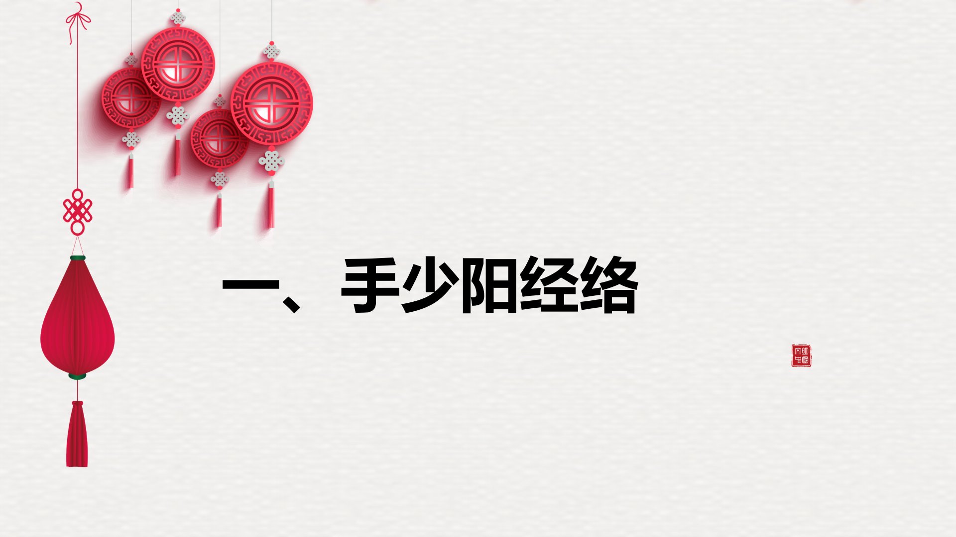 手少阳经络与腧穴识别及应用掌握本经脉循行和常用腧穴(关冲、中渚、阳池、外关、支沟、肩髎、翳风、角孙、耳门、丝竹空)的定位、主治和刺灸注意事项。熟悉本经脉的主治概要。了解本经的络脉、经筋、经别及其他腧穴。【学习目标】一、手少阳经络手少阳经脉《灵枢·经脉》:三焦手少阳之脉,起于小指次指之端,上出两指之间[1],循手表腕[2],出臂外两骨[3]之间,上贯肘,循臑外[4]上肩,而交出足少阳之后,入缺盆,布膻中[5],散络心包,下膈,遍[6]属三焦。其支者,从膻中,上出缺盆,上项,系耳后,直上出耳上角,以屈下颊至[7]。其支者,从耳后入耳中,出走耳前,过客主人[8],前交颊,至目锐眦[9]。【原文】[1...