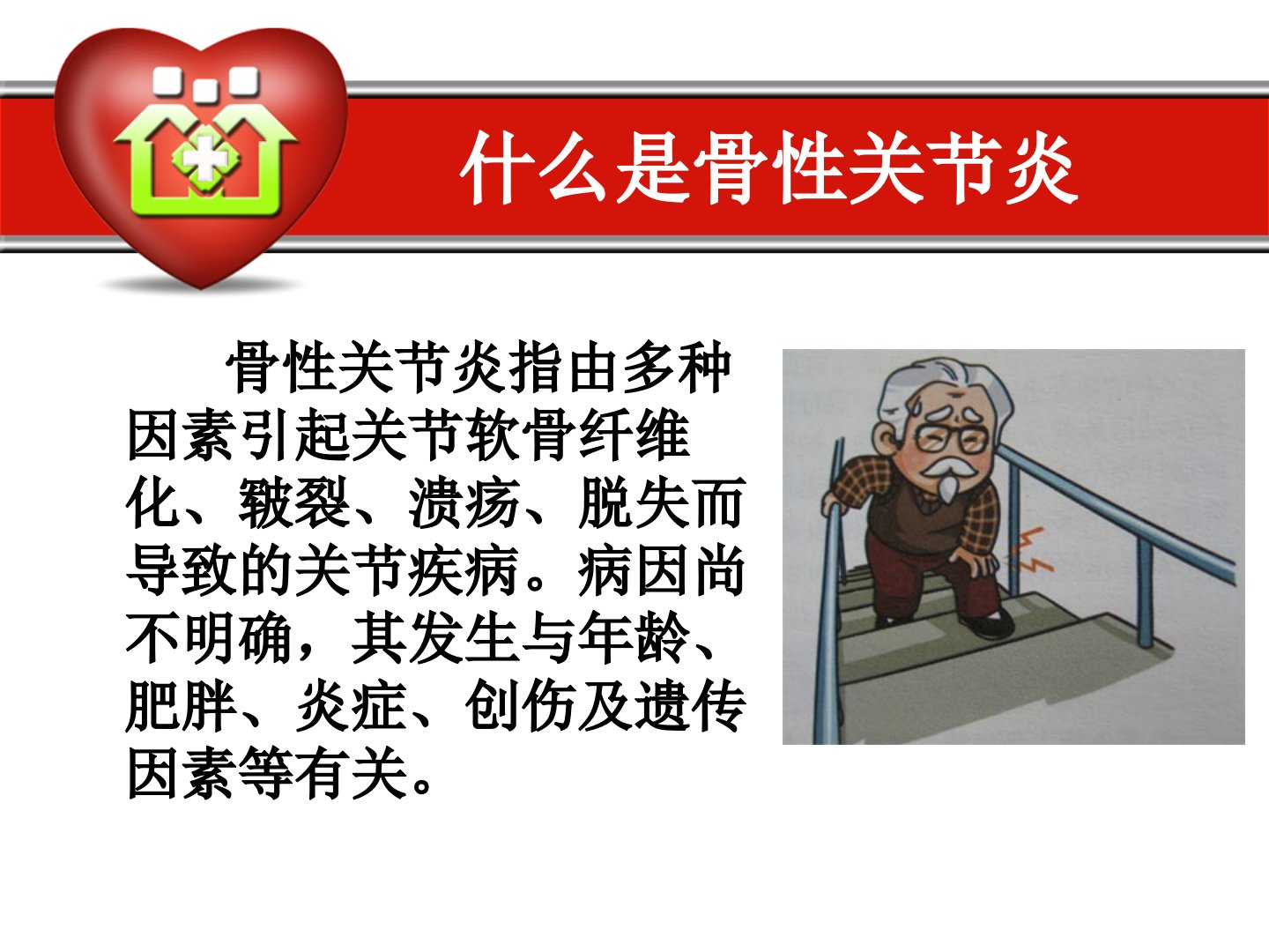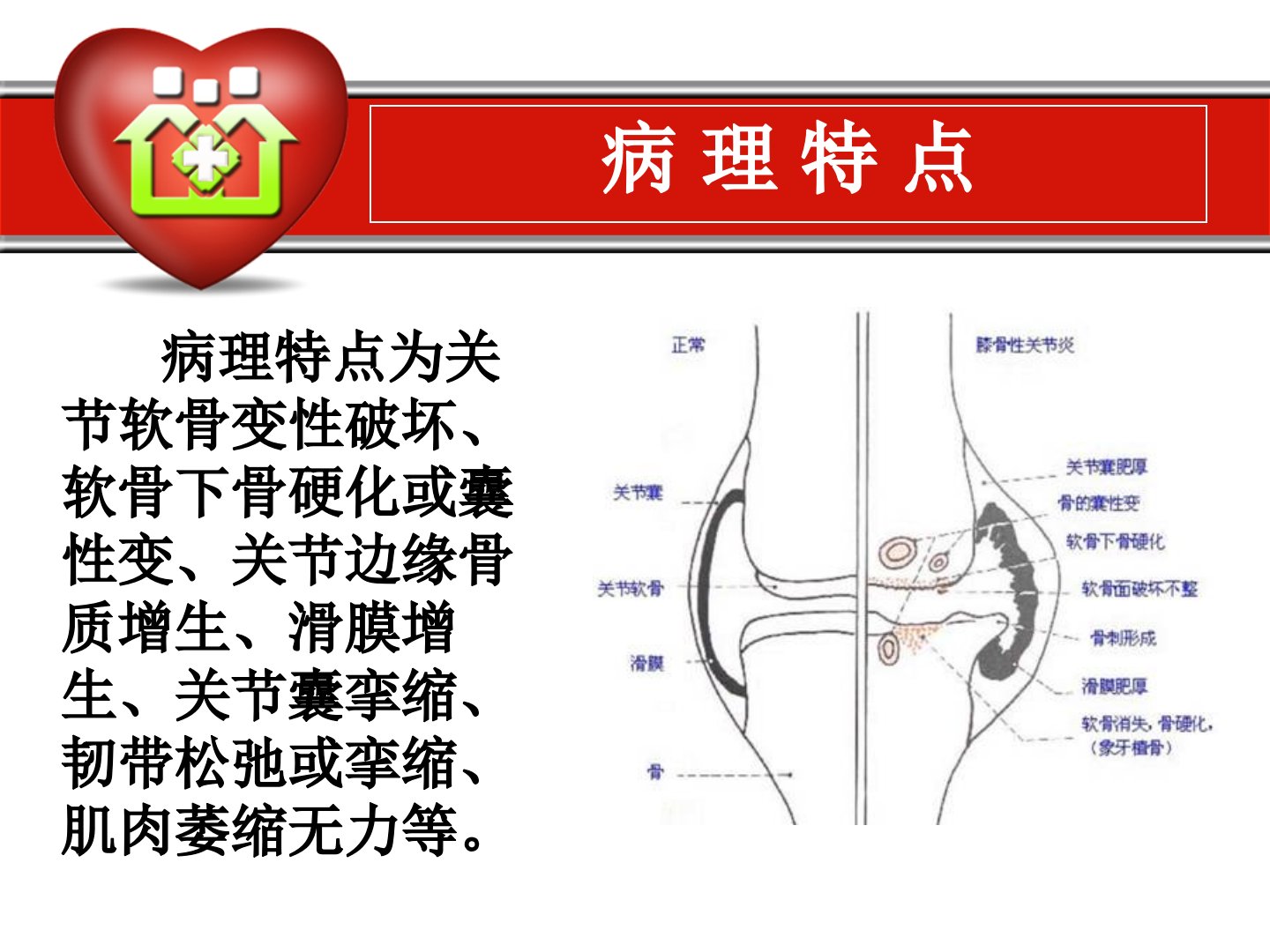骨性关节炎是多种因素引发的关节疾病与年龄、肥胖、炎症、创伤及遗传有关病理特点为关节软骨变性破坏等多见于中老年女性好发于负重、活动多的关节致残率高达53。临床表现有关节疼痛、晨僵、肿大、骨摩擦音感、关节无力及活动障碍等。治疗目的是减轻疼痛、改善功能、提高生活质量。治疗原则是非药物与药物治疗结合必要时手术且治疗需个体化。非药物治疗包括健康教育、物理治疗、行动支持和改变负重力线等是药物治疗及手术的基础。药物治疗包括局部用药、全身镇痛药、改善病情类药物及软骨保护剂等。外科治疗途径主要有关节镜窥镜和开放手术。康复治疗包括体育疗法和肌力训练适当运动可改善关节软骨营养增强关节周围肌肉力量可保护关节、抑制退变。美国骨科医师学会不推荐一些传统治疗方法强调健康教育及生活方式改变的重要性。