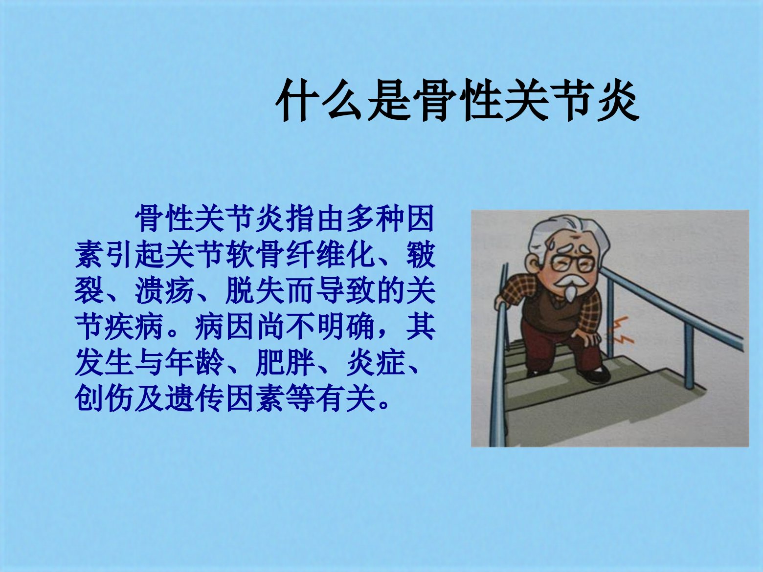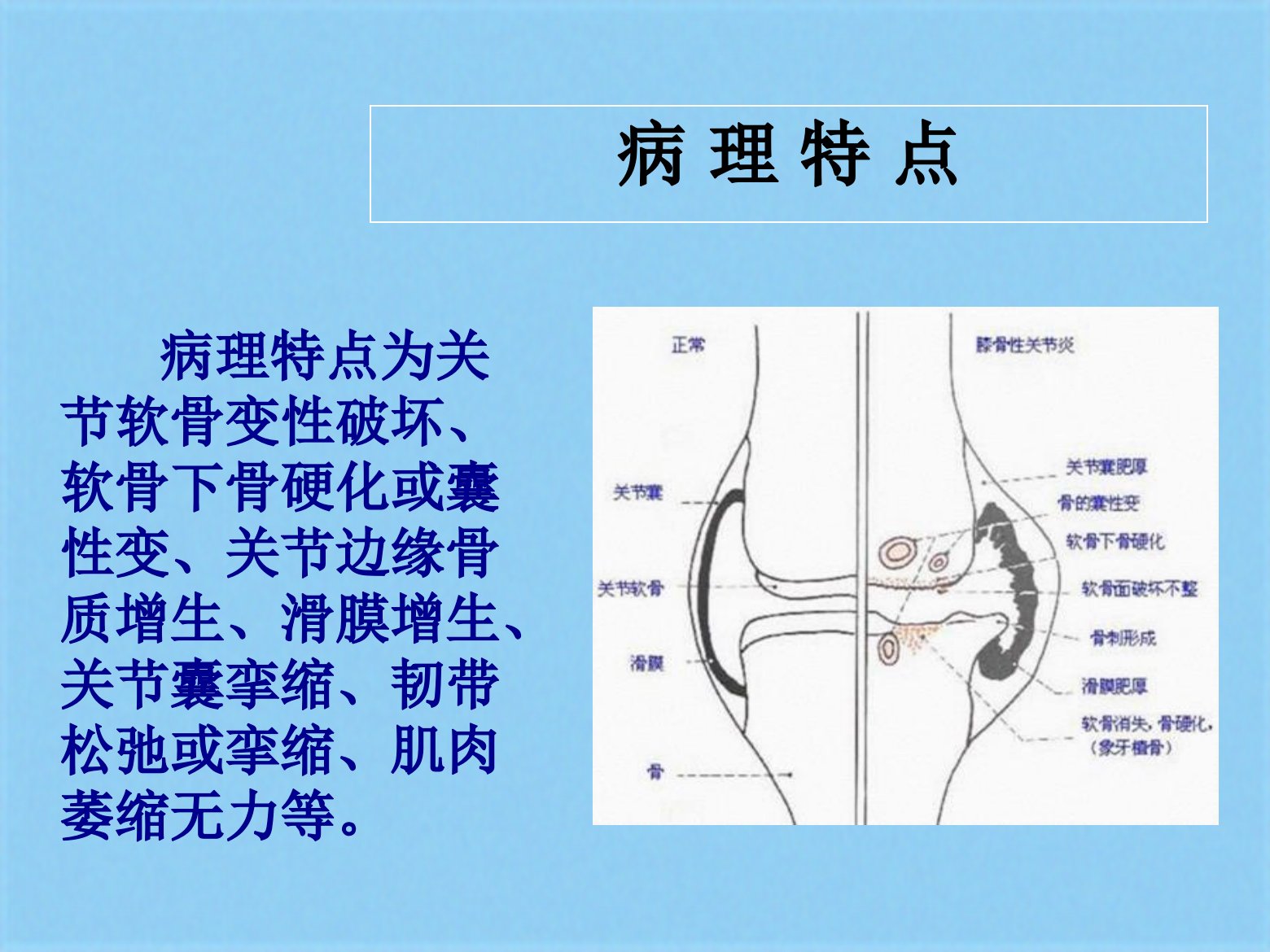 骨性关节炎是因多种因素导致关节软骨纤维化等病变的关节疾病病因不明与年龄、肥胖等因素有关。病理特点为关节软骨变性破坏等。该病多见于中老年女性好发于负重大、活动多的关节致残率高达53。临床表现包括关节疼痛及压痛、关节僵硬、肿大、骨摩擦音感、关节无力及活动障碍。治疗目的是减轻或消除疼痛改善关节功能总体原则是非药物与药物治疗结合必要时手术且治疗应个体化。非药物治疗包括健康教育、物理治疗、行动支持、改变负重力线等;药物治疗则根据疼痛情况选择如局部药物治疗、全身镇痛药物、改善病情类药物及软骨保护剂等。外科治疗途径包括关节镜窥镜和开放手术。康复治疗方面体育疗法和肌力训练有利于改善关节软骨营养防止肌肉和软骨萎缩。