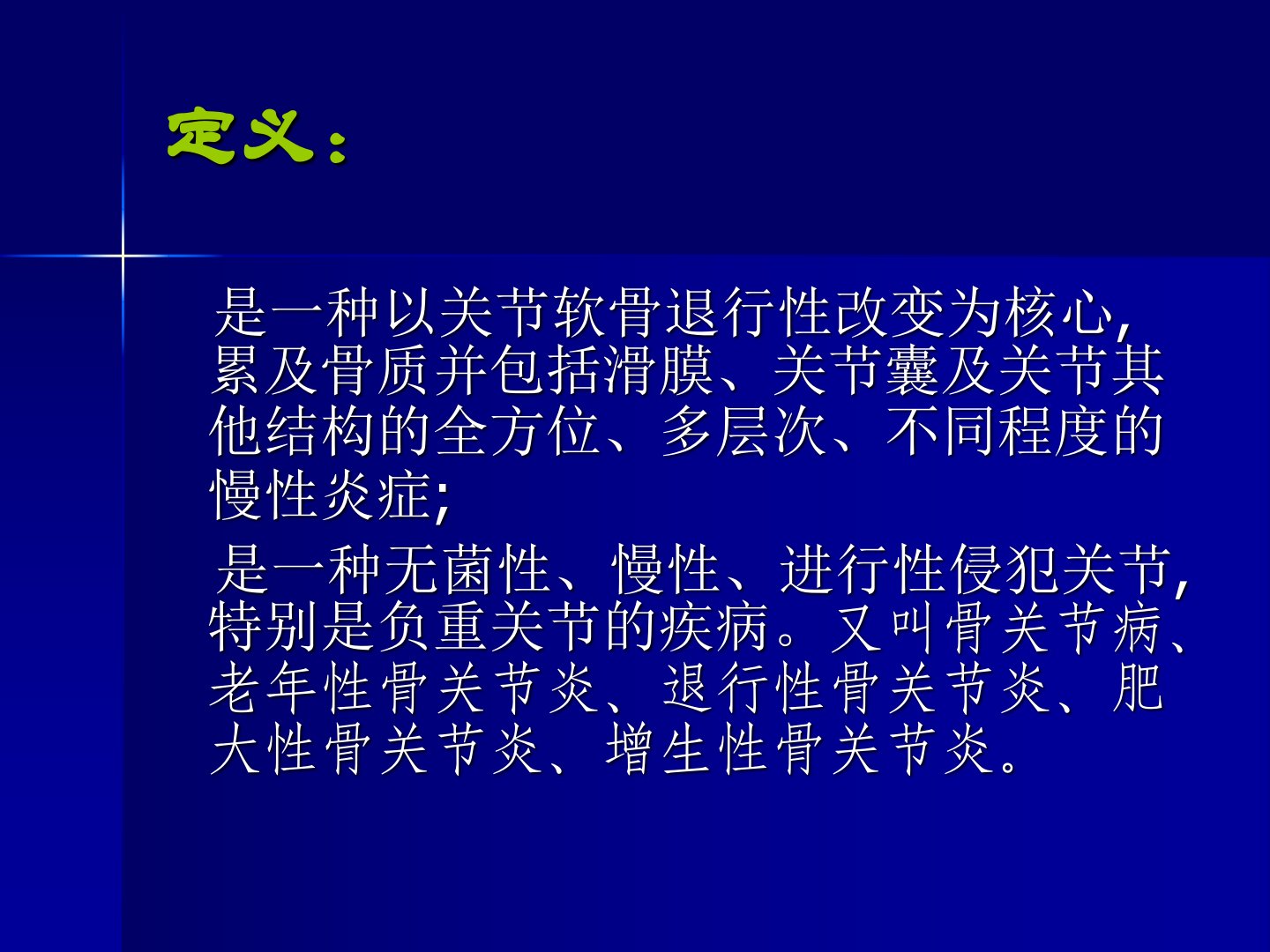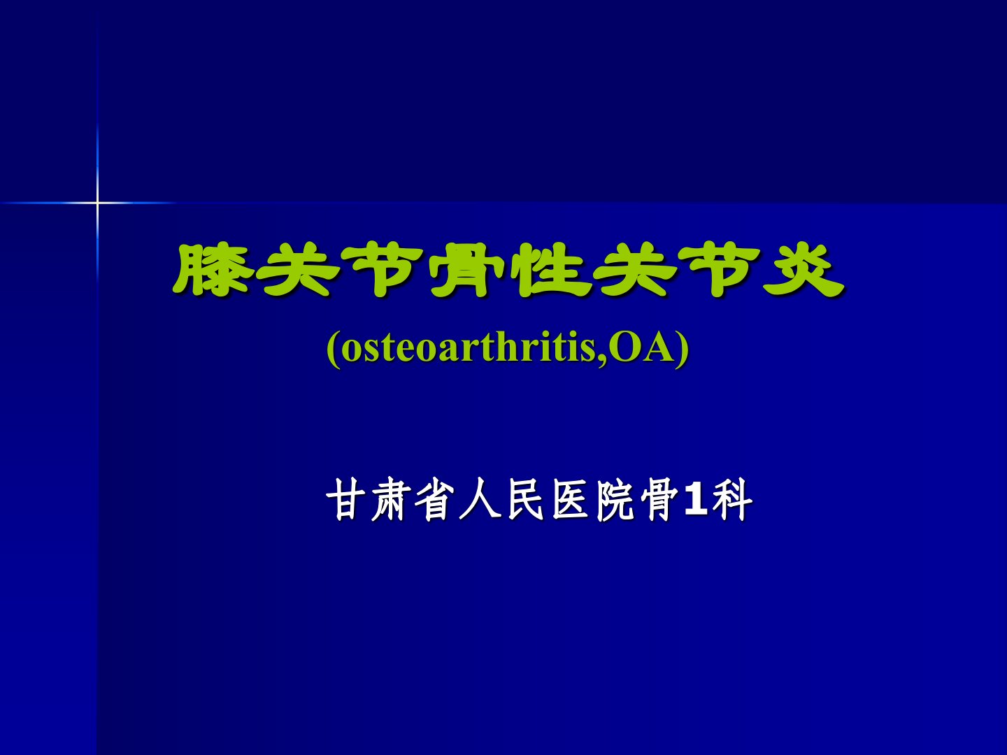 甘肃省人民医院医生介绍膝关节骨性关节炎(OA)是以关节软骨退行性改变为核心累及骨质及滑膜、关节囊等多结构的慢性炎症又称骨关节病等。OA分为原发性和继发性两类前者多见于50岁以上肥胖患者常多关节发病与年龄相关预后较好;后者继发于创伤、炎性关节病等疾病发病年龄较轻常累及单个关节进展较快预后较差。其病理改变主要是膝关节负重侧关节软骨退行性变继发滑膜炎、骨质增生等晚期关节伸直挛缩。临床表现包括疼痛、关节活动受限、关节“绞锁”、“膝软”等。辅助检查中X线、CT、MRI、关节镜及超声仪各有优势其中MRI可提高早期诊断率关节镜可直观反映病变程度。OA诊断可依据1995年ACR标准。治疗包括非手术疗法(健康教育、物理治疗、药物治疗)和手术治疗。
