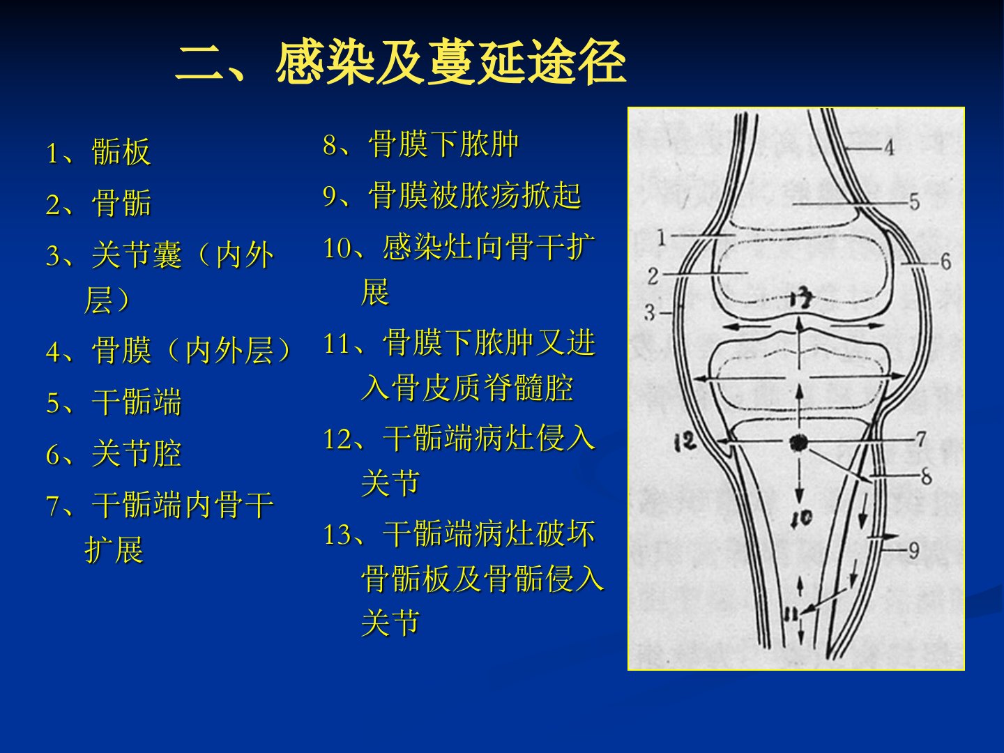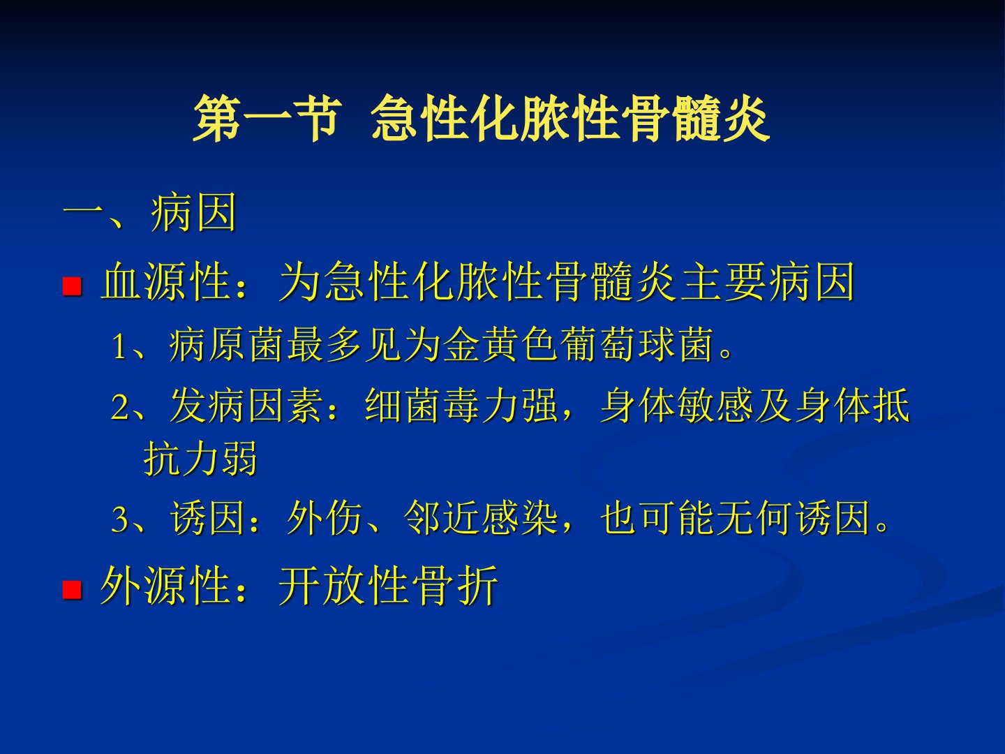 骨髓炎第一节急性化脓性骨髓炎一、病因血源性:为急性化脓性骨髓炎主要病因1、病原菌最多见为金黄色葡萄球菌。2、发病因素:细菌毒力强,身体敏感及身体抵抗力弱3、诱因:外伤、邻近感染,也可能无何诱因。外源性:开放性骨折二、感染及蔓延途径1、骺板2、骨骺3、关节囊(内外层)4、骨膜(内外层)5、干骺端6、关节腔7、干骺端内骨干扩展8、骨膜下脓肿9、骨膜被脓疡掀起10、感染灶向骨干扩展11、骨膜下脓肿又进入骨皮质脊髓腔12、干骺端病灶侵入关节13、干骺端病灶破坏骨骺板及骨骺侵入关节三、临床症状及体症发病急,以日计算;高烧;局部红、肿、热、痛根据发病时间和病理变化分三期:1、骨膜下脓肿前期,一般在发病10...