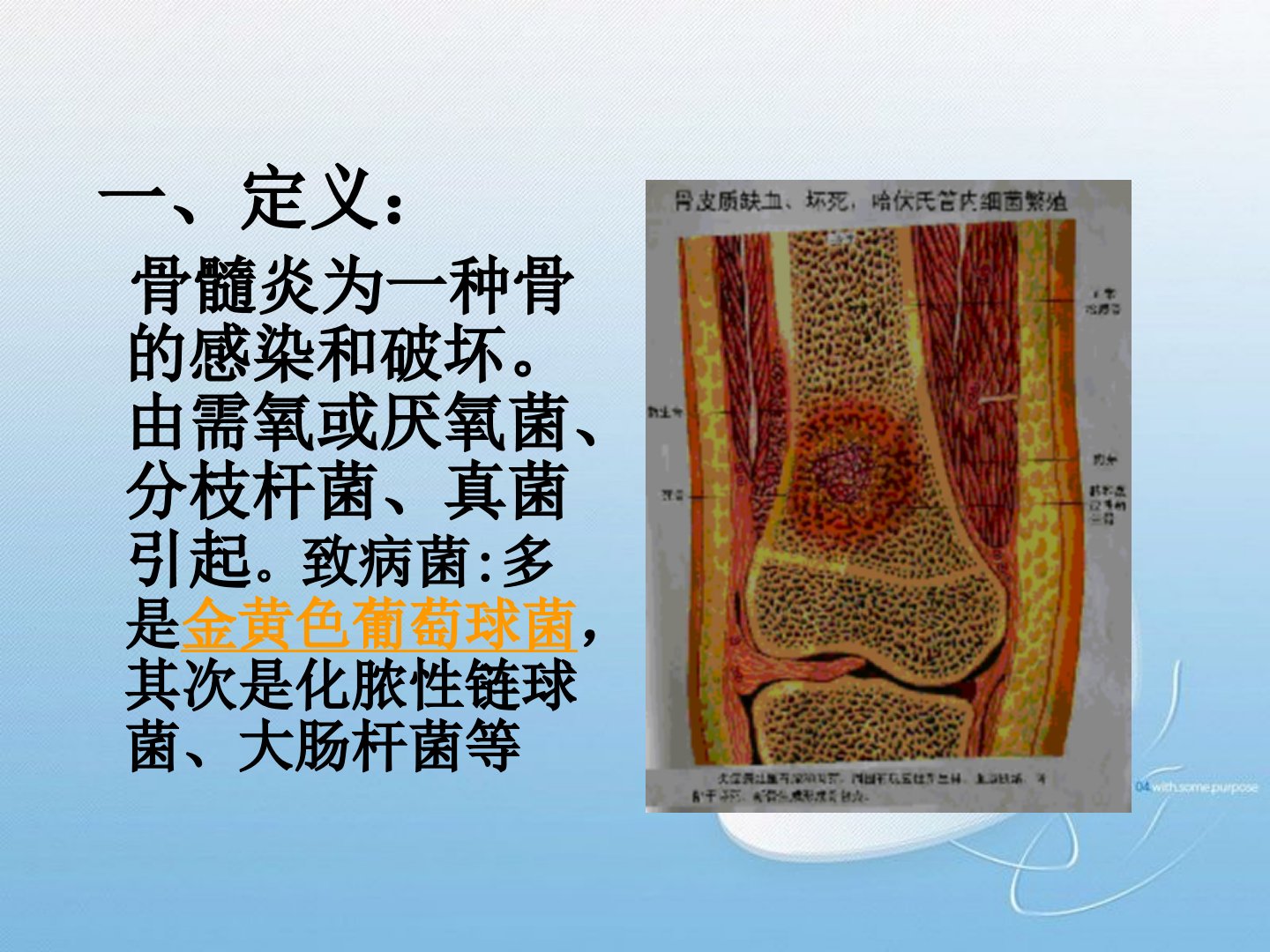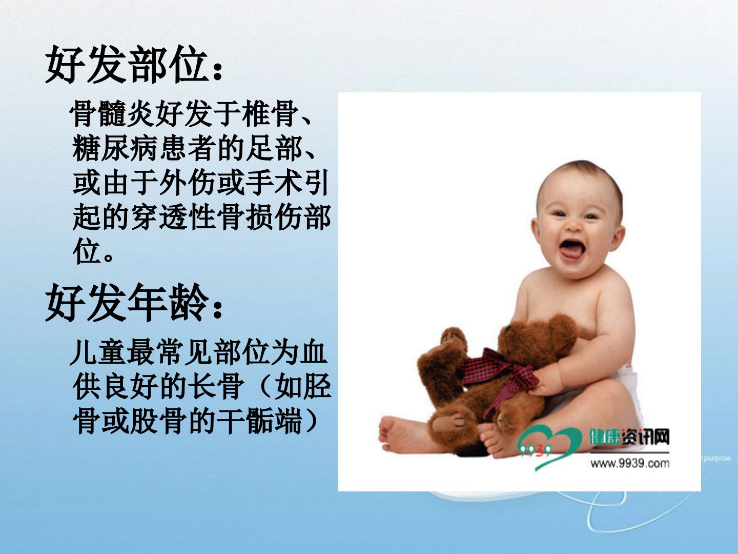 骨髓炎是骨的感染和破坏可由需氧或厌氧菌、分枝杆菌、真菌等引发好发于椎骨、糖尿病患者足部及穿透性骨损伤部位儿童则常见于长骨干骺端。根据发病原因骨髓炎可分为血源性、外伤性及邻近组织感染蔓延三类按发病缓急又分急性和慢性。急性骨髓炎症状包括病骨疼痛、发热、消瘦等治疗无效可转为慢性引发骨痛、压痛和窦道排脓。检查手段包括实验室检查、X线、CT、活检及碘油造影其中X线检查可显示骨质破坏、骨膜反应、死骨形成及骨质增生等特征。治疗方面有持续冲洗术、死骨保留及再植入、微创外固定技术等多种方法。急性骨髓炎可能引发化脓性关节炎、病理骨折等危害。护理上需注意观察病情变化加强营养抬高患肢固定患肢并注意血液循环同时防止交叉感染。预防措施包括保持环境卫生、加强体育锻炼等。