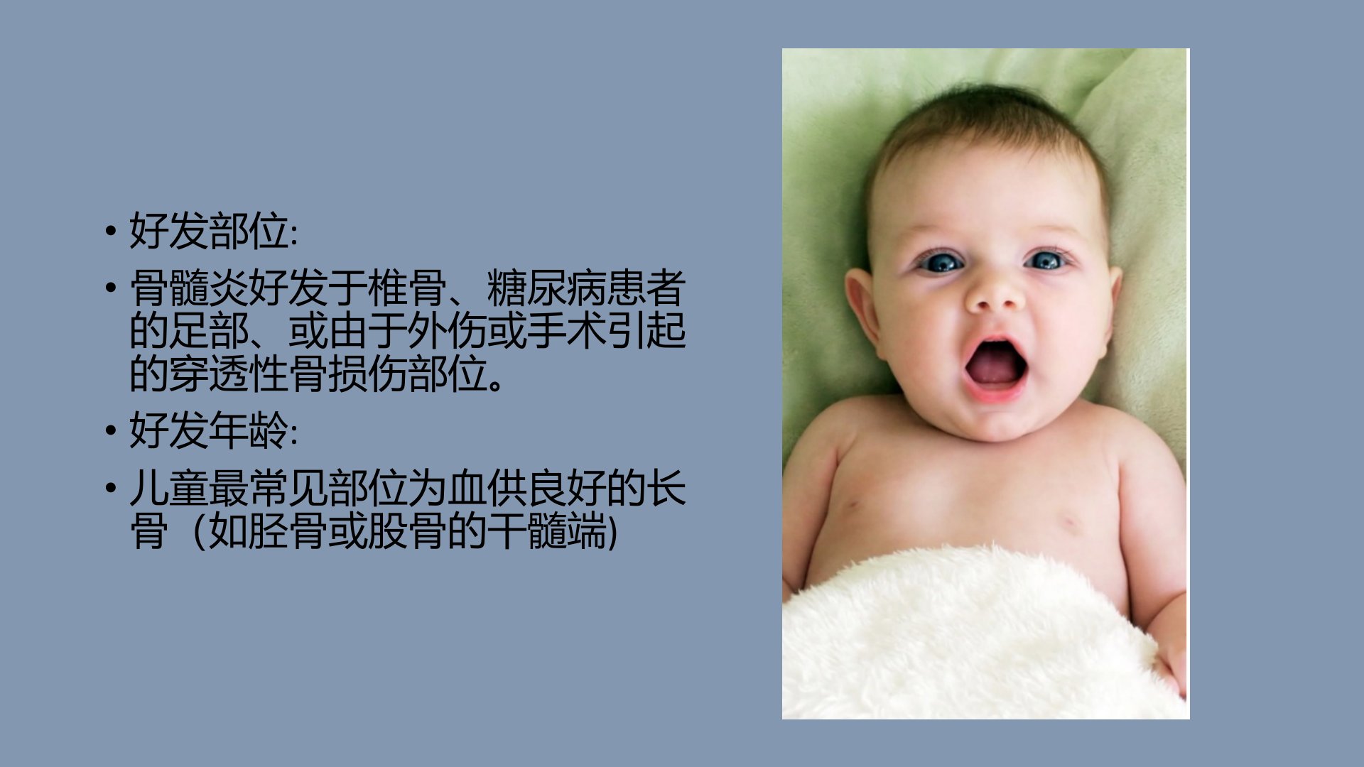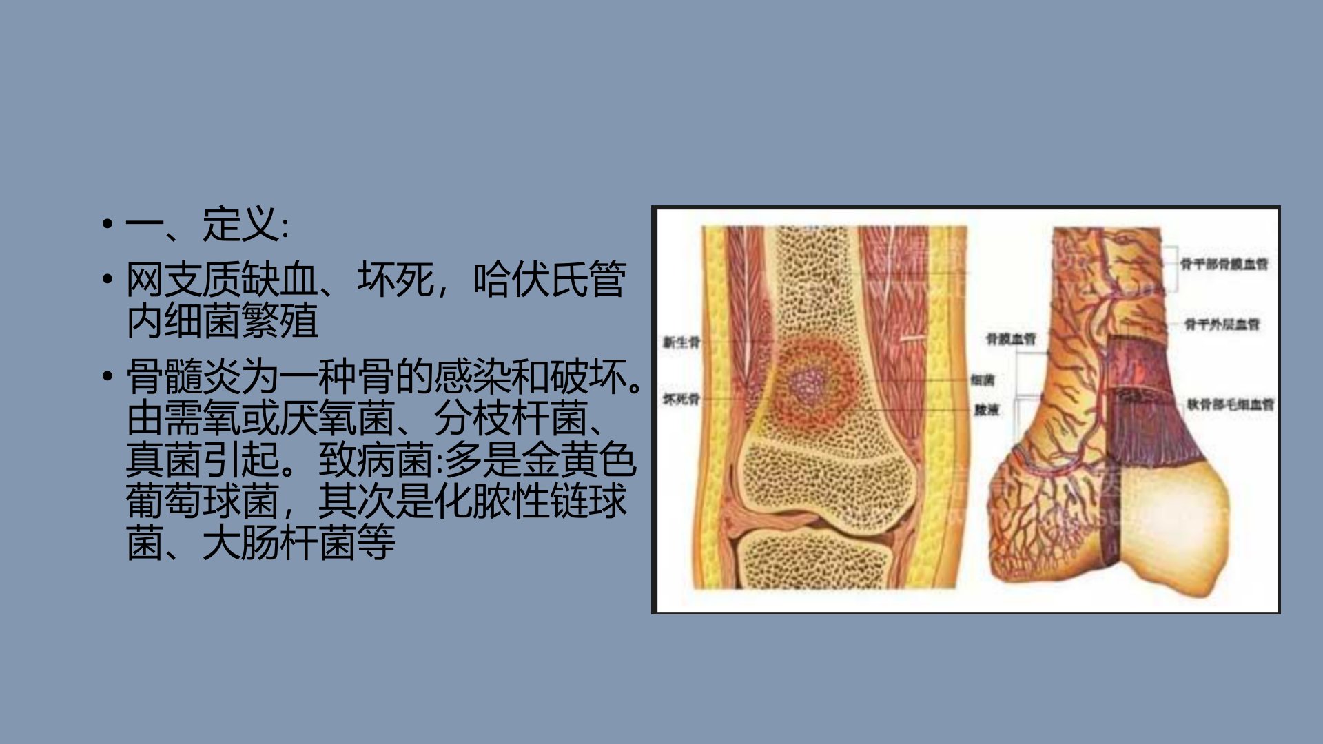 骨髓炎是骨的感染与破坏多由金黄色葡萄球菌等需氧或厌氧菌、分枝杆菌、真菌引起好发于椎骨、糖尿病患者足部及穿透性骨损伤部位儿童则常见于血供良好的长骨。根据发病原因骨髓炎可分为血源性、外伤性及邻近组织感染蔓延三类按发病缓急又分急性和慢性。急性骨髓炎症状包括骨痛、发热、消瘦等治疗无效可转为慢性引发骨痛、压痛和窦道排脓。检查包括实验室、X线、CT、活检及碘油造影检查。治疗手段多样包括持续冲洗术、死骨保留及再植入、多种手术法及微创外固定技术等。骨髓炎还可能引发化脓性关节炎、病理骨折等危害。护理上需注意观察病情加强营养抬高患肢固定患肢以防病理性骨折及时处理伤口分泌物防止交叉感染。预防骨髓炎需保持环境卫生、个人卫生加强锻炼积极预防和治疗扁桃体炎等。
