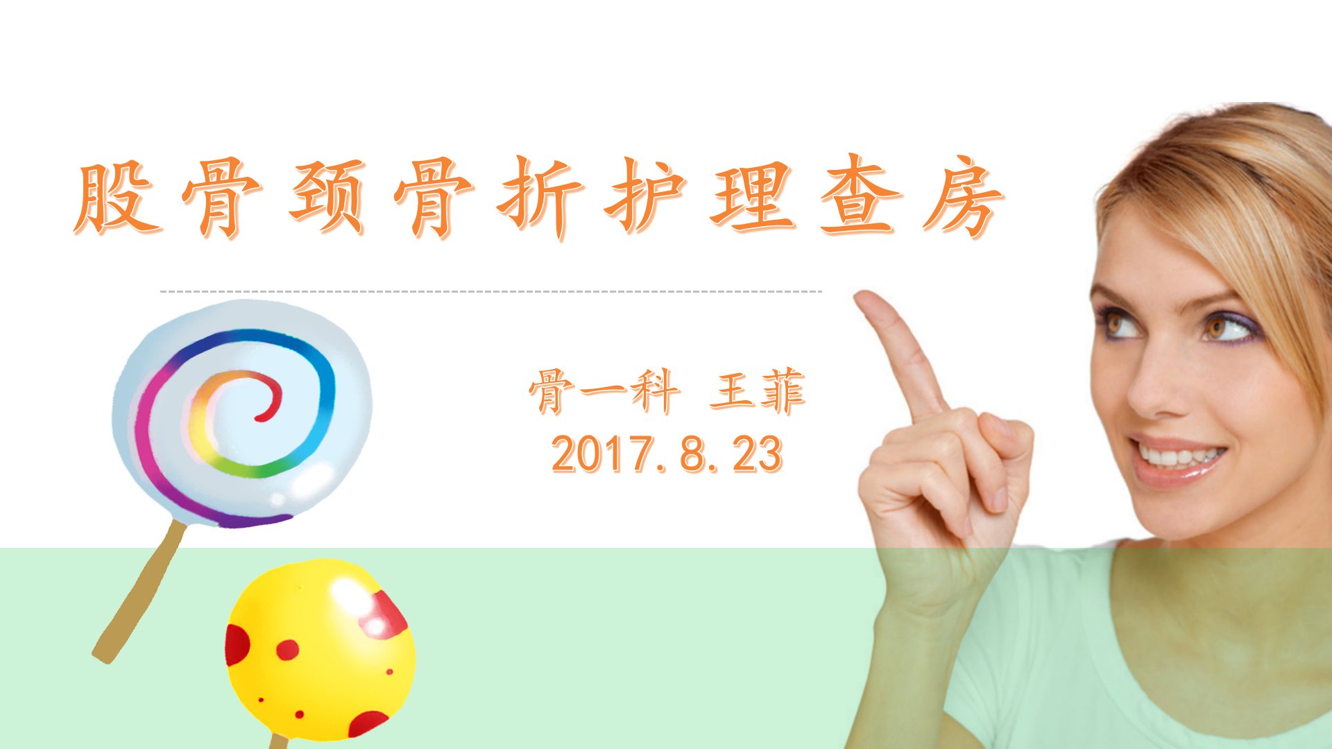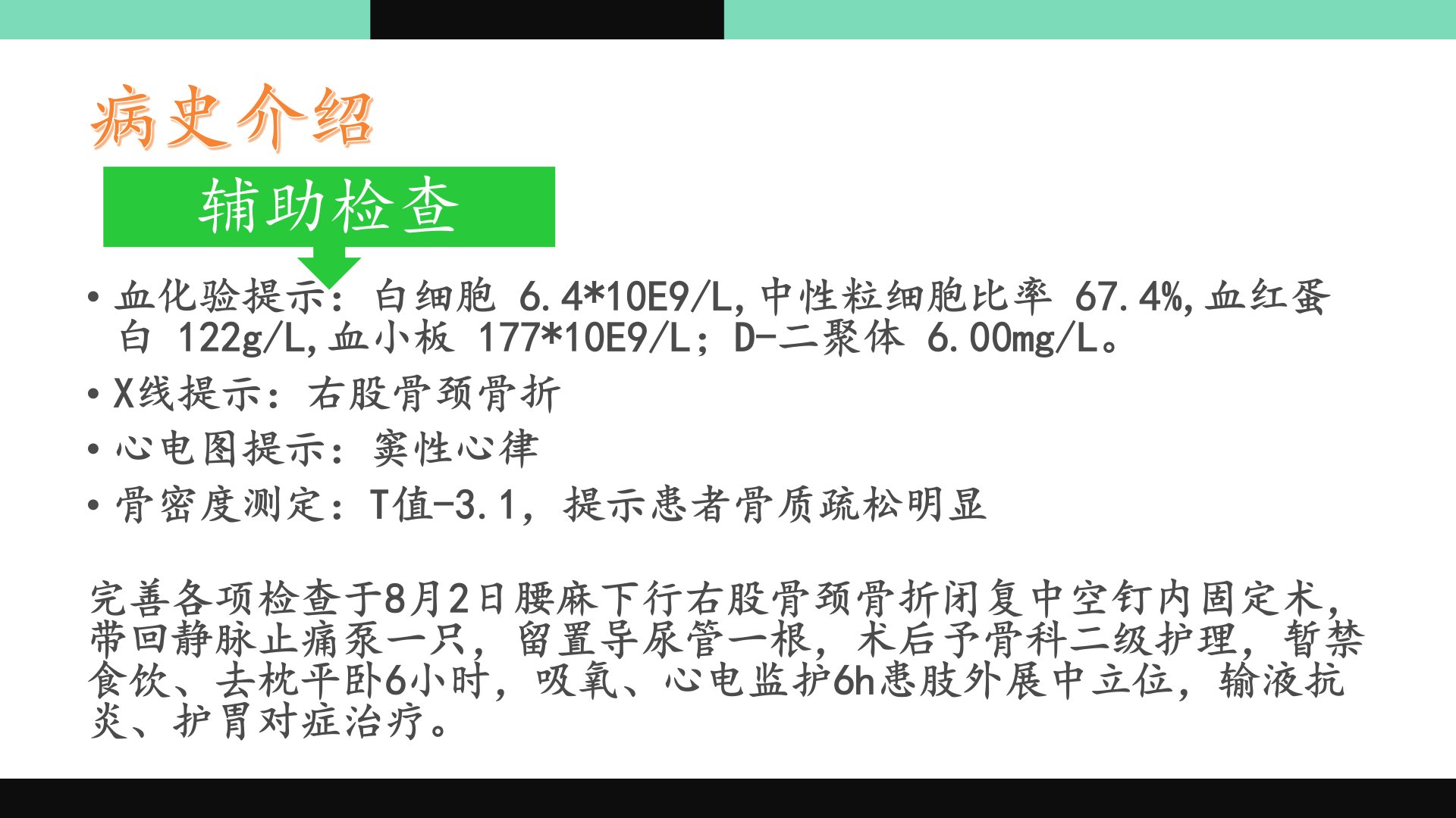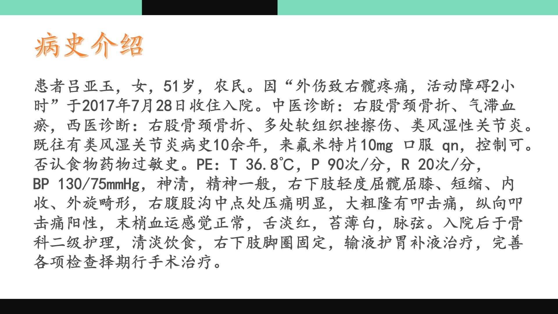 股骨颈骨折护理查房摘要2017年8月23日骨一科王菲进行了股骨颈骨折护理查房。患者吕亚玉女51岁因外伤致右髋疼痛活动障碍2小时收住入院。中医诊断为右股骨颈骨折、气滞血瘀西医诊断为右股骨颈骨折、多处软组织挫擦伤、类风湿性关节炎。患者有10余年类风湿关节炎病史入院后完善检查于8月2日行右股骨颈骨折闭复中空钉内固定术术后予骨科二级护理对症治疗后恢复良好予8月出院。股骨颈骨折是老年人常见骨折女性发病率高于男性病因包括骨质疏松、外伤等。分型有按解剖部位、骨折线倾斜角度、骨折移位程度三种。临床表现包括有跌倒史、疼痛、肿胀等辅助检查主要是髋部X线摄片。治疗分非手术和手术非手术适用于无明显移位等情况手术治疗包括闭合、切开复位内固定术和人工髋关节置换术。围手术期护理:术前做好心理、饮食、体位、功能锻炼护理预防并发症;术后密切观察病情预防骨折移位、下肢深静脉血栓形成及肺栓塞、压疮、肺部感染、泌尿系感染、便秘等并发症。针对护理问题如疼痛、焦虑等采取相应护理措施。出院时指导患者饮食、体位、日常生活预防关节感染。