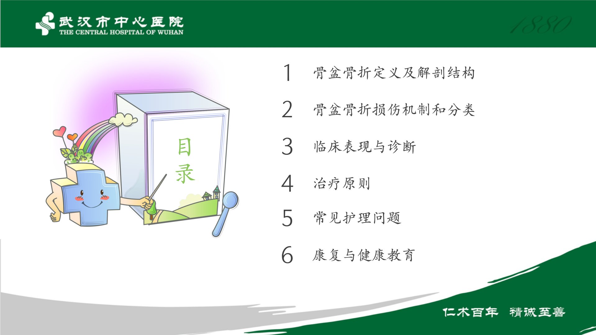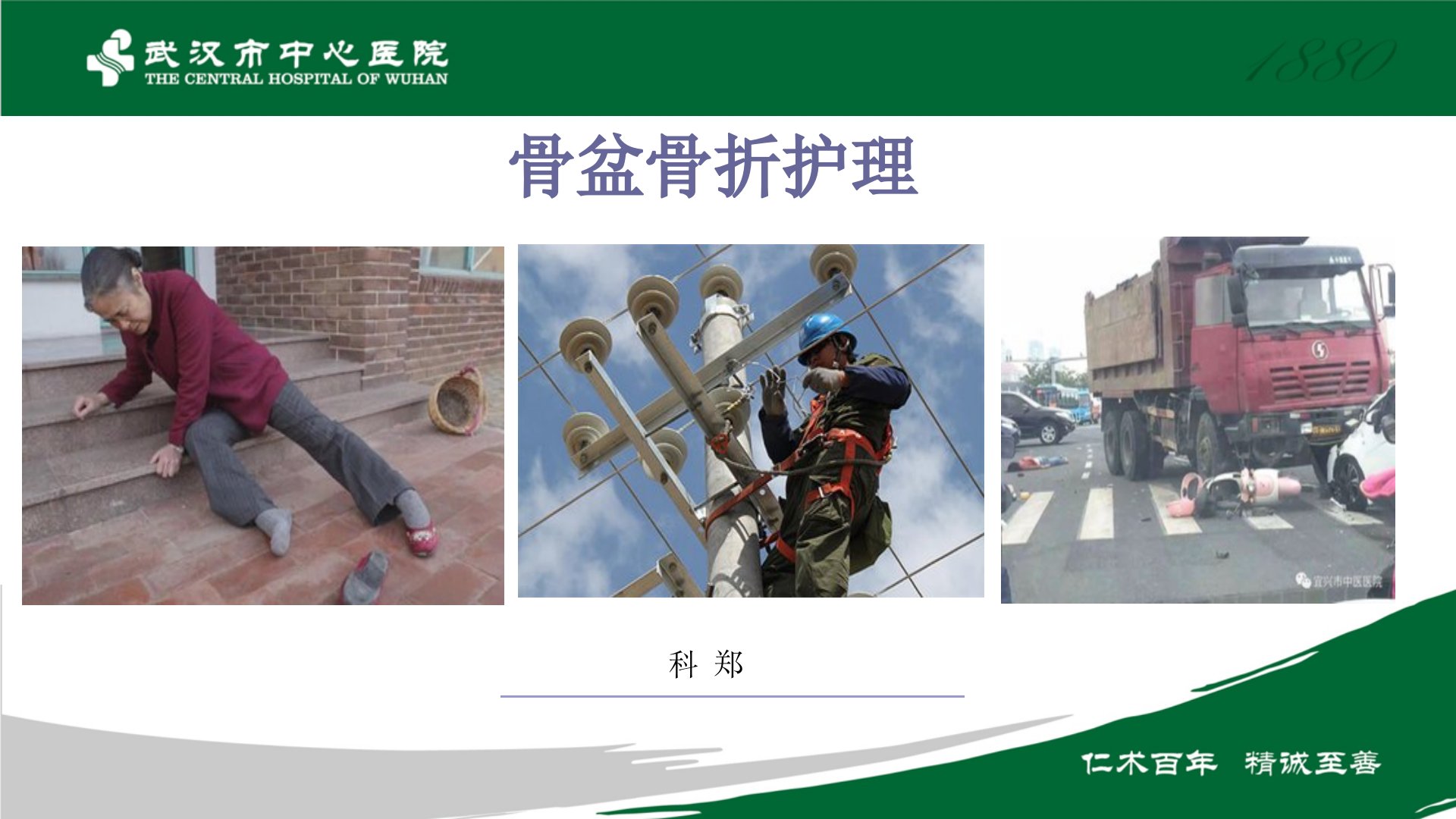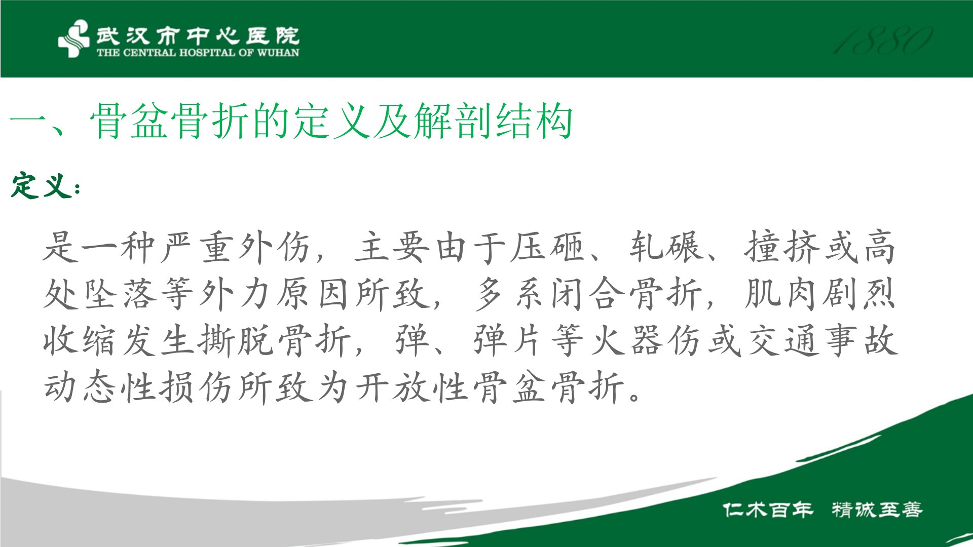 骨盆骨折护理摘要骨盆骨折是一种严重外伤多由压砸、轧碾、撞挤、高处坠落、火器伤或交通事故等外力所致分为闭合性与开放性骨折。损伤机制与分类损伤机制包括前后压迫、侧方挤压等。分类上Tile和YoungBurgess按暴力方向分A、B、C型A型为稳定骨折B型旋转不稳定、垂直稳定C型旋转及垂直方向均不稳定。临床表现与诊断表现为出血、疼痛、肢体移动障碍、骨盆变形、异常活动等严重时有出血性休克、神经损伤、腹腔脏器损伤等症状。诊断主要依靠X线检查和CT扫描。治疗原则与护理问题治疗原则涉及疼痛管理、损伤部位处理等。常见护理问题有休克、感染、躯体移动障碍、神经损伤等。针对感染要及时清创加强营养预防性使用抗生素等;对于躯体移动障碍要观察神经损伤情况指导患者进行功能锻炼。康复与健康教育影响骨盆环完整的骨折伤后卧床并进行上肢等运动。伤后2周或术后57天开始功能锻炼包括踝泵运动、肌肉紧绷训练等。