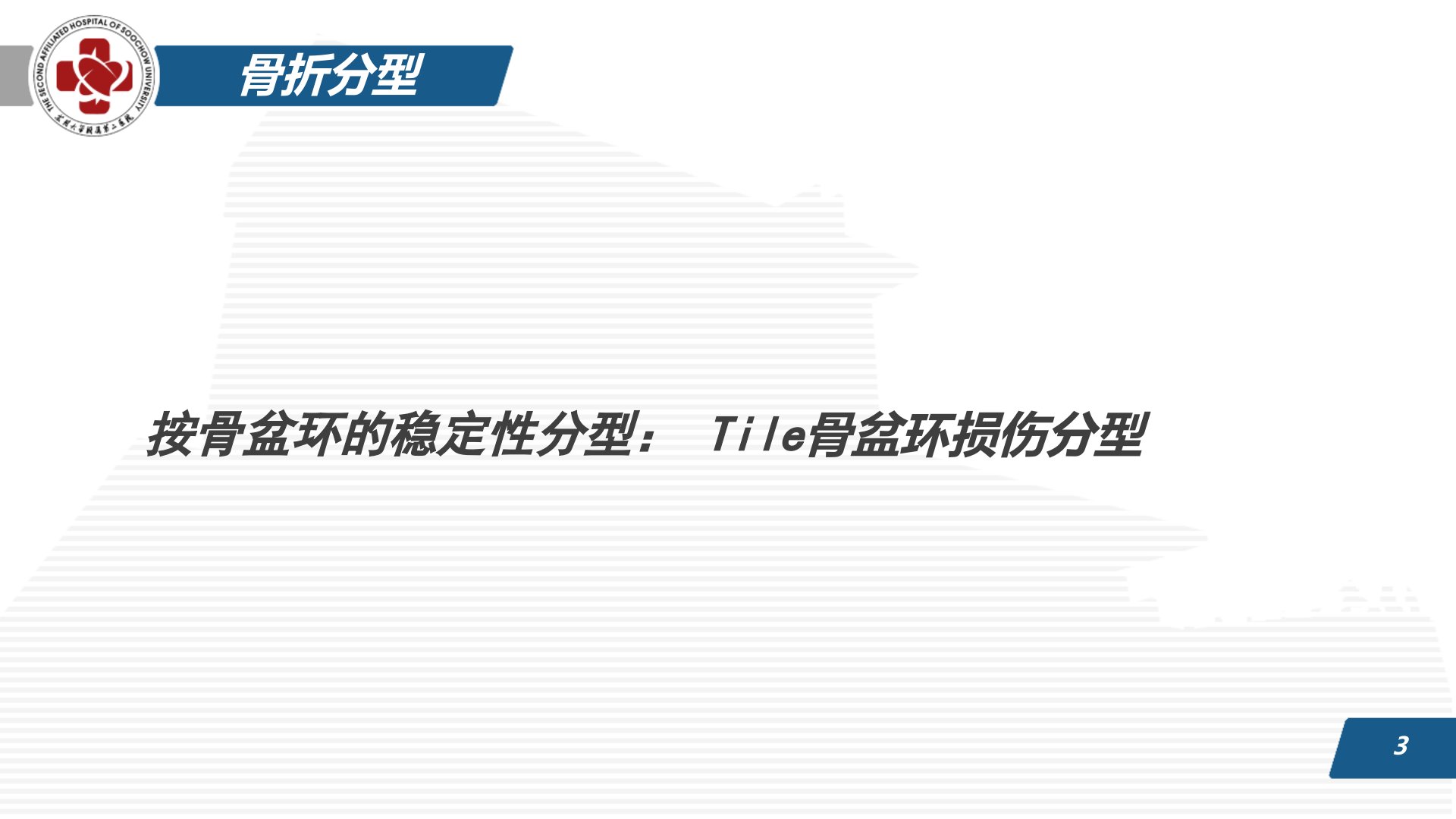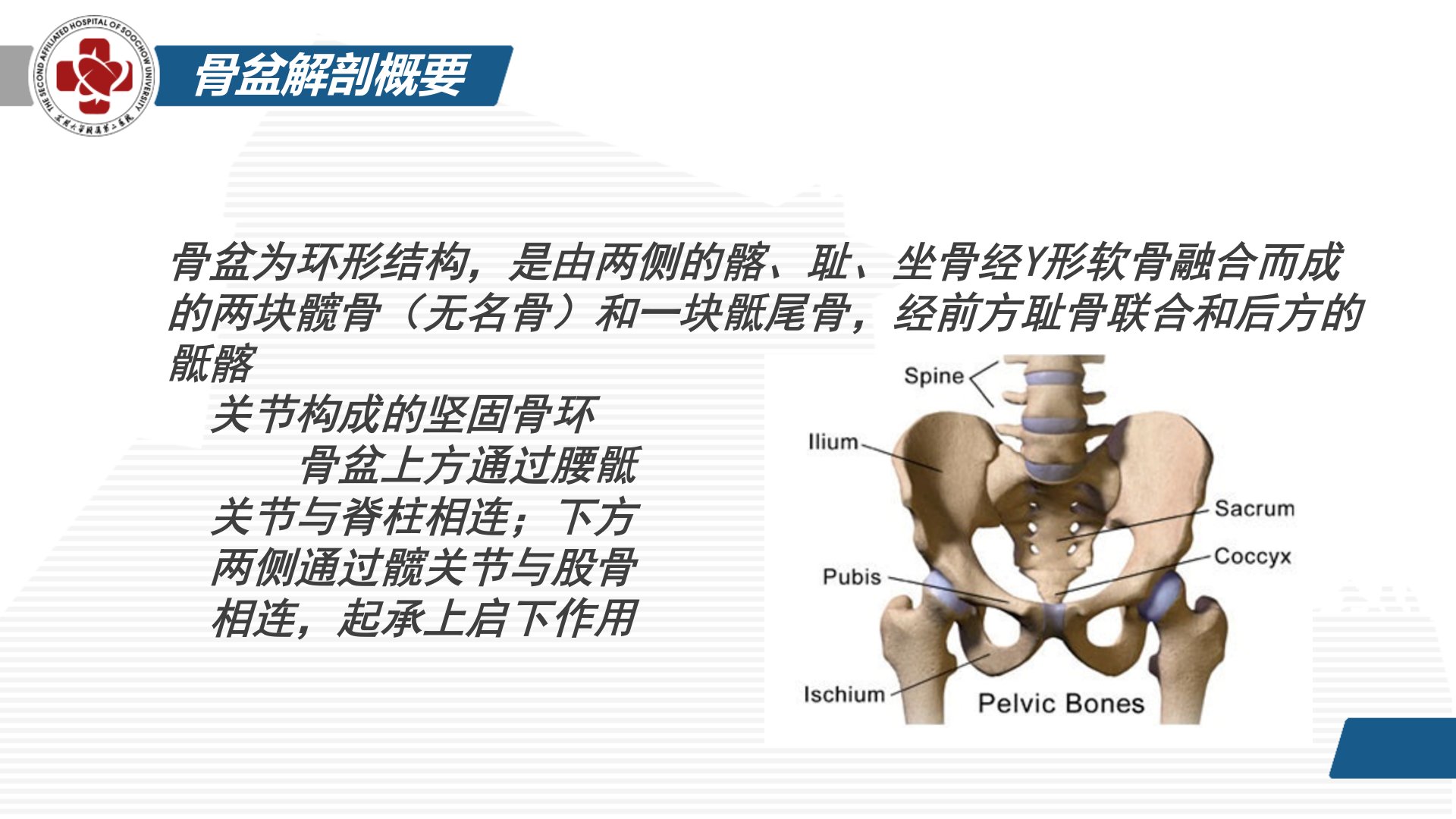 2018年苏州大学附属第二医院进行了骨盆骨折及病例汇报。骨盆为环形结构由髋骨和骶尾骨构成起承上启下作用。按骨盆环的稳定性Tile骨盆环损伤分型为:A型稳定型B型部分稳定型C型旋转、垂直均不稳定型。局部受伤表现为疼痛、活动困难有腹膜后出血者还会腹痛、腹胀。全身则有失血性休克征象。体征上骨盆分离与挤压实验呈阳性肢体长度不对称。影像学检查中X线可显示骨折类型CT三维重建可更直观显示。并发症包括腹膜后血肿、盆腔内脏器损伤、神经损伤、脂肪栓塞与静脉栓塞。汇报中有一52岁男性货车司机病例因车祸致双侧下肢疼痛伴活动受限8小时入院。检查发现多处骨折包括骨盆、髋臼、股骨、胫腓骨等还有肋骨骨折和肺挫伤。诊疗中患者存在失血性休克可能予积极输血补液等治疗后全麻下行左侧髋臼骨折切开复位内固定术术后考虑坐骨神经损伤。其诊治流程包括询问病史、评估病情、处理并发症、影像学检查以明确诊断。术前需做常规检查对无法尽早手术的患者可予以患肢固定同时预防深静脉血栓形成、充分镇痛、预防性使用抗生素、进行营养支持、准备术中用药、申请输血、做好手术准备。术后要充分镇痛、处理切口、维持水和电解质平衡、评估营养状态、进行康复锻炼。