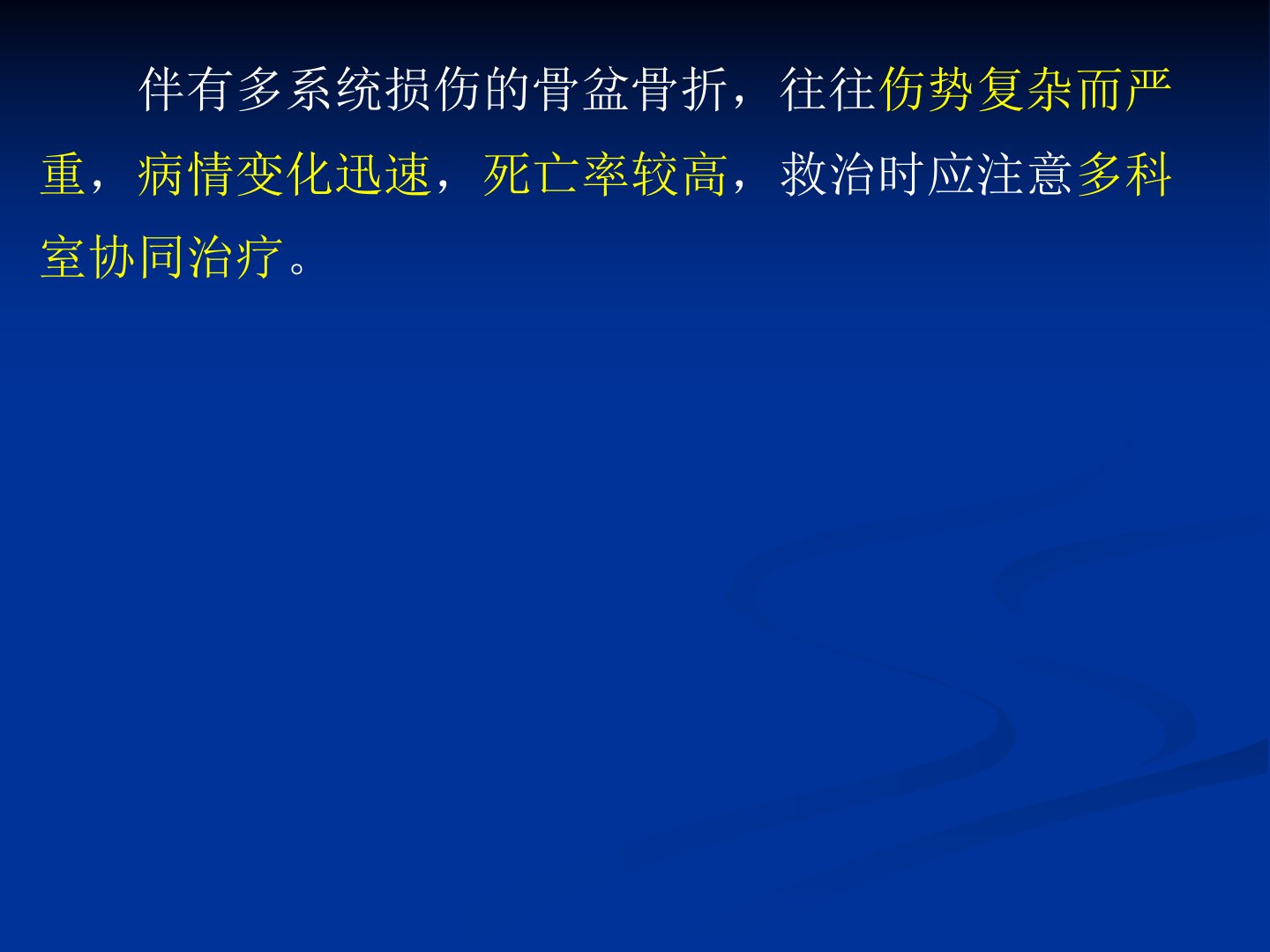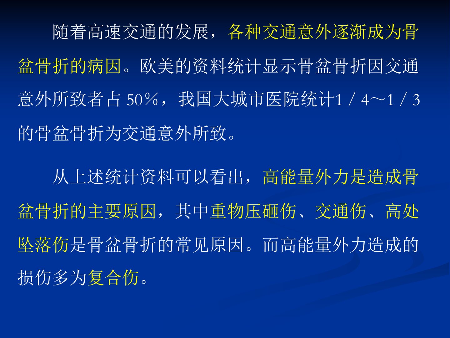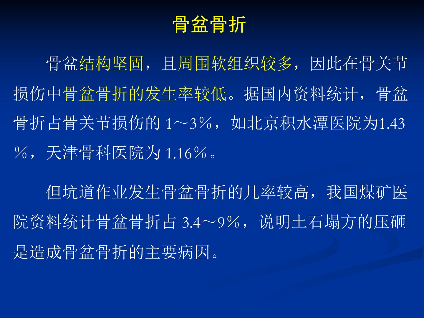 骨盆结构坚固且周围软组织较多故骨盆骨折在骨关节损伤中发生率较低国内统计约占13煤矿医院统计坑道作业中占349交通意外是骨盆骨折的重要病因欧美统计占50我国大城市约占1413。高能量外力是造成骨盆骨折的主因其中重物压砸伤、交通伤、高处坠落伤是常见原因。骨盆由髋骨、骶尾骨构成依靠骶髂关节和耻骨联合连接和稳定主要负重部分在骨盆后部。骨折病因包括直接暴力、摔倒或高处坠落臀部触地、肌肉强力收缩、混合暴力等。分类按骨折部位和骨盆环完整程度可分为骨盆环无断裂骨折、骨盆环单弓断裂骨折、骨盆环双弓断裂骨折;按骨盆环的稳定程度可分为稳定性骨折和不稳定骨折;根据损伤机制与骨盆变形程度分为压缩型、分离型、中间型。并发症包括创伤性休克、血管损伤、神经损伤、尿道断裂、膀胱破裂、直肠破裂、女性内生殖器损伤等。诊断需结合外伤史、临床表现、影像学检查及并发症评估。治疗包括急救处理、整复固定、药物治疗、练功疗法多科室协同治疗对于伴有复合伤的患者至关重要。本病学习重点为负重主弓、骨折分类、并发症及诊断、骨折整复固定方法。