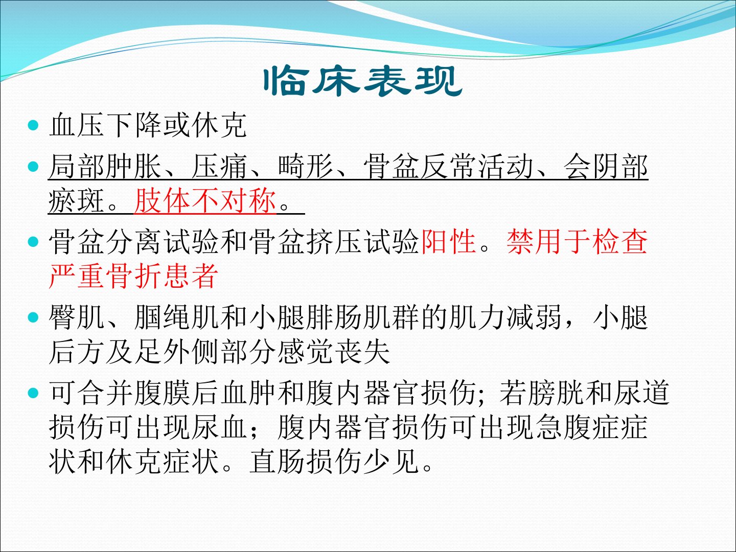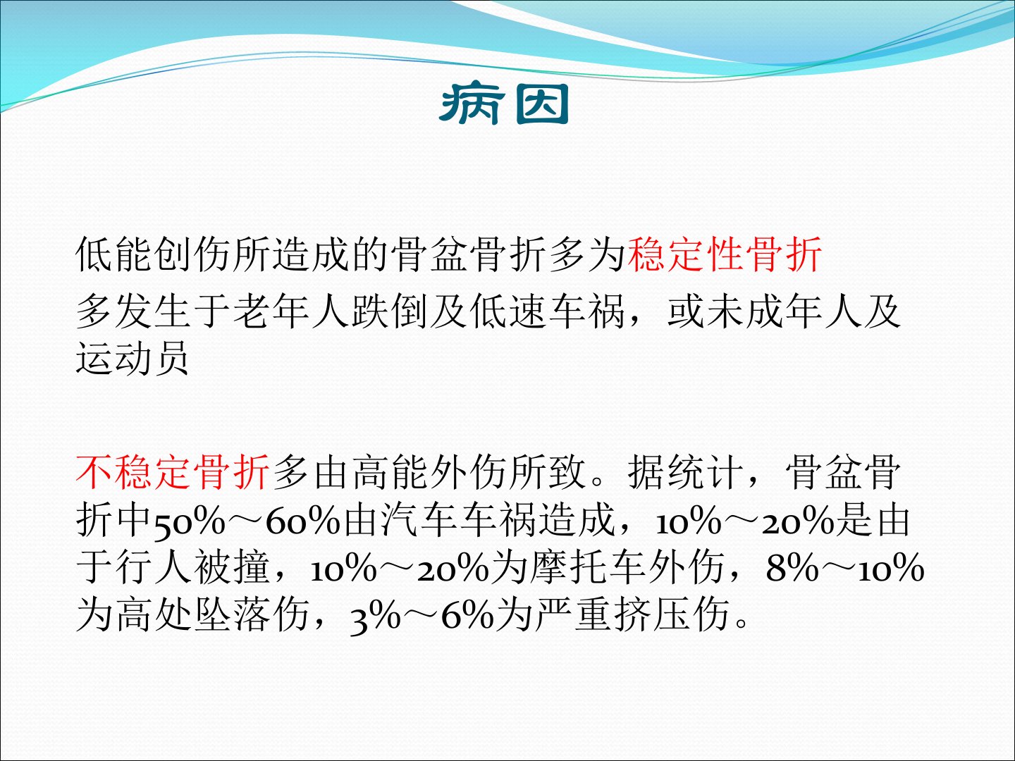 骨盆骨折摘要骨盆骨折病因多样低能创伤所致多见于老年人、未成年人及运动员多为稳定性骨折;高能外伤易致不稳定骨折汽车车祸、行人被撞、摩托车外伤等是常见原因。临床表现上患者有血压下降、局部肿胀等症状还可能出现肌力减弱、感觉丧失甚至合并腹膜后血肿等严重情况。骨盆由髋骨等组成稳定性结构包括耻骨联合等其生物力学有特定特征薄弱部位有耻骨联合等。分型方面Tile分型有A、B、C型YoungBurgess分型有侧方挤压型等4种类型。诊断依靠X线、CT。治疗上稳定性骨折多保守治疗不稳定骨折依分类选治疗方式。手术指征包括外固定复位不理想等情况手术方式分前方、后方固定有骨外固定架等多种固定方式及不同手术入路。术后功能康复分早期、中期、恢复期早期进行踝泵等练习中期开展髋关节活动等练习恢复期经医生复查许可后开始负重练习。