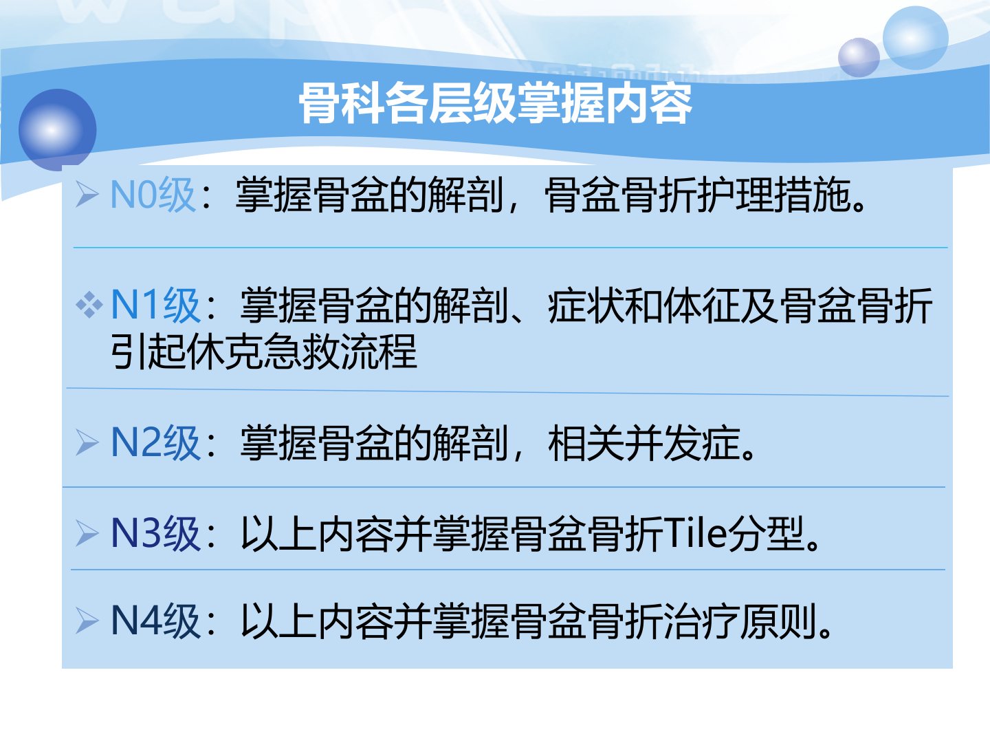 骨盆骨折创伤骨肿瘤外科知识总结分级学习内容N0N4级分别掌握骨盆解剖、症状体征、休克急救、并发症、Tile分型及治疗原则等内容。骨盆解剖与功能骨盆具支持体重、保护内脏等重要功能男女骨盆存在性别差异其内部由前至后排列着泌尿、生殖和消化三个系统的器官。骨盆环分前后部后部为承重弓含股骶、坐骶弓;前部为联结弓稳定承重弓。骨盆骨折概述骨盆骨折常见仅次于四肢和脊柱骨折并发症发生率占比3058。骨折时盆腔器官易受损Tile基于稳定性等将骨盆分为ABC型。症状包括骨盆部及下腹部疼痛、局部肿胀等可通过骨盆分离挤压实验、“4”字实验、肛指检查及X线、CT等检查诊断。治疗原则稳定型骨折采用卧床、制动等方法;不稳定骨盆骨折治疗方法多样B1型用外固定器等B2、B3型视伤情而定C1、C2、C3型前环损伤用外固定器等后环骨折有不同处理方法。急救处理观察生命体征、建立输血补液途径、查X线和CT、观察泌尿系及直肠等情况、做好生活护理、保证固定效果并功能锻炼。并发症及护理1休克和盆腔出血:最常见、最紧急、最严重应快速补液、监测生命体征等。2膀胱、尿道损伤:评估损伤轻柔留置尿管保持通畅做好膀胱造口护理。3神经损伤:观察症状