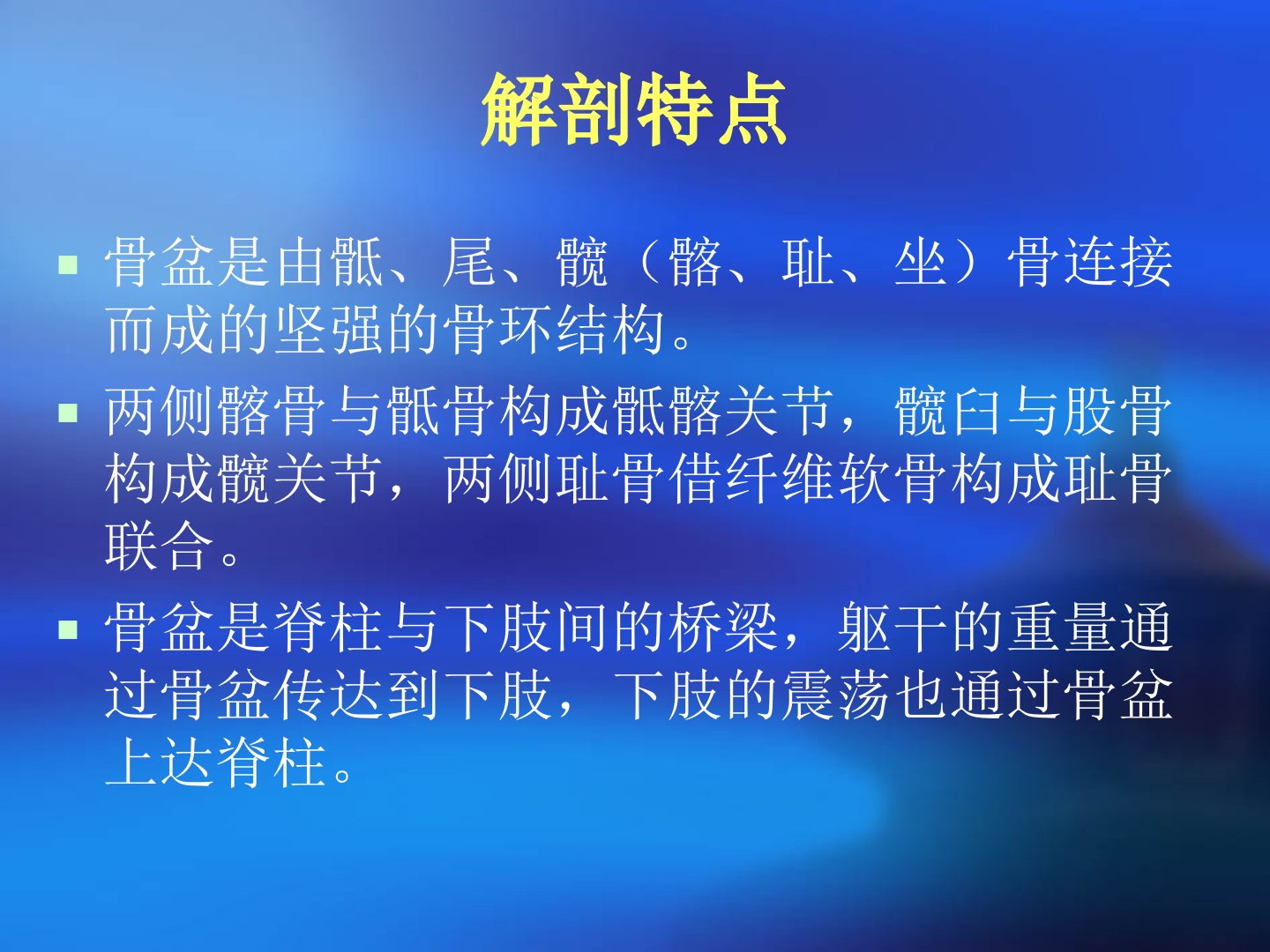 骨盆骨折摘要骨盆由骶、尾、髋骨连接成坚强骨环是脊柱与下肢间的桥梁。骨盆骨折多发于青壮年并发症多、死亡率高。其分类多样包括Tile分类(A型稳定骨折;B型旋转不稳定骨折;C型旋转垂直不稳定骨折)、Kane分类(无损骨盆弓完整骨折、单弓骨折、双弓骨折、髋臼骨折合并中心脱位)等。临床表现包括外伤病史、软组织损伤、骨盆分离挤压试验阳性、肢体长度不对称等X线可显示骨折。诊断要点为伤后局部疼痛、肿胀等症状以及骨盆挤压、分离试验阳性X线片明确骨折部位和类型。治疗方法依受伤情况而定稳定性骨折用非手术治疗不稳定性骨折行手术治疗。护理需密切观察防止再移位合理安排饮食预防并发症指导功能锻炼。常见并发症有血管损伤、神经损伤、尿道破裂、膀胱破裂、直肠破裂等。术前术后均需细致护理包括备皮、禁食、观察生命体征等功能锻炼依治疗方式不同而有所区别。
