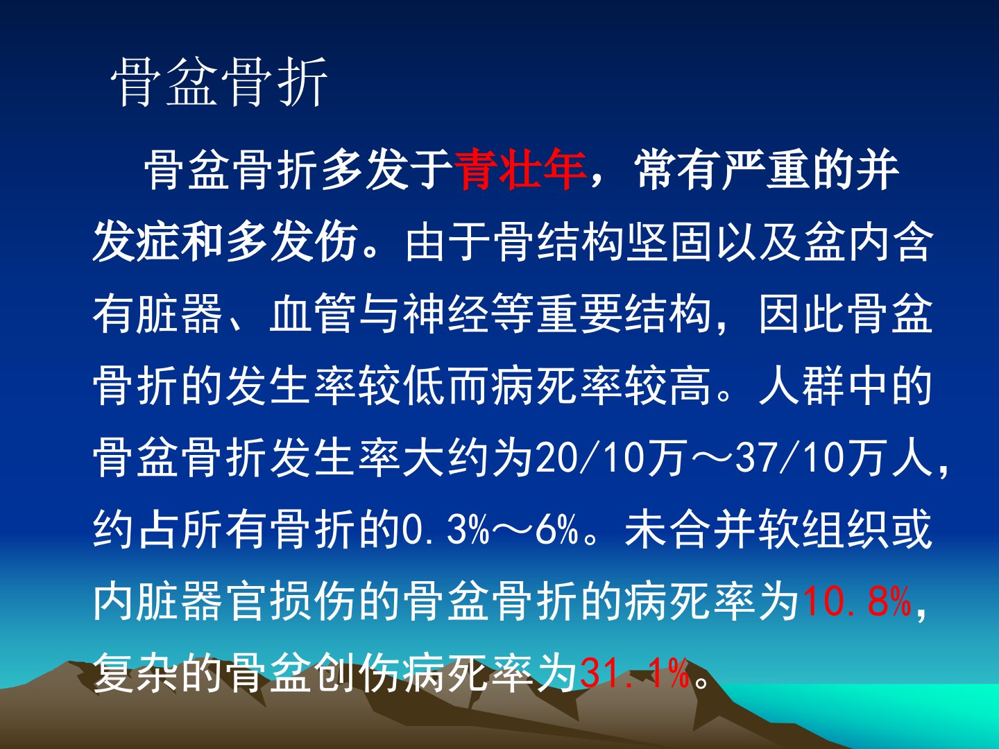 骨盆、髋臼骨折多发生于青壮年常伴有严重并发症和多发伤。由于骨盆结构坚固且包含重要脏器、血管和神经其骨折发生率较低但病死率较高人群发生率约为036复杂骨盆创伤病死率高达311。骨盆骨折多由直接暴力或肌肉猛烈收缩导致低能量损伤治疗相对容易但中、高能量损伤常伴广泛软组织和其他内脏伤是机动车事故死亡的三大原因之一。早期死亡主要因大量出血、休克、多器官功能衰竭和感染。骨盆介于脊柱与双下肢之间由骶、尾骨和两侧髋骨组成具有保护盆内脏器和传导应力的功能。其生物力学特征表现为骨盆后部是承重的主要部分骨盆前部起稳定和加强作用。骨盆骨折分类多样Tile分类法将骨折分为稳定、旋转不稳定和旋转垂直不稳定三型。骨盆骨折的临床表现包括骨盆分离与挤压试验阳性、肢体长度不对等、会阴部瘀斑等。急救处理需优先防治大量出血与内脏器官损伤对不稳定型骨盆骨折进行早期复位和持续固定。髋臼骨折分类包括简单骨折和复杂骨折手术目的是解剖复位髋臼顶并同心复位股骨头。