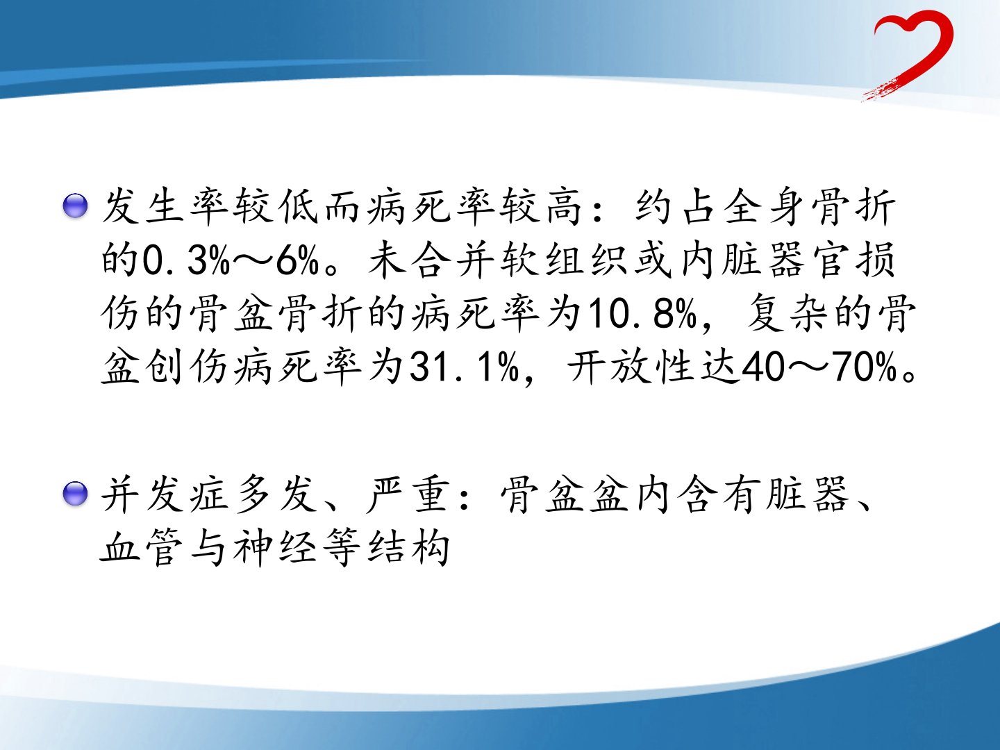 骨盆、髋臼骨折摘要骨盆骨折发生率低但病死率较高未合并软组织或内脏器官损伤的骨盆骨折病死率为108复杂骨盆创伤病死率高达311开放性骨盆骨折病死率更是高达4070。其并发症多发且严重骨盆内含有脏器、血管与神经等结构。骨盆骨折解剖:髋骨由髂骨、耻骨、坐骨经Y形软骨融合而成骶骨骨盆边缘有许多肌肉、韧带附着起到稳定骨盆的作用。分类:按骨折部位、骨盆环的稳定性(Tile)、暴力方向(YoungBurgess)分类。临床表现:高能量损伤复合伤、休克多见体征包括会阴部瘀斑、肢体不等长等。治疗:根据全身情况多科室协作重度骨折外科急救不同类型骨折处理方式不同。髋臼骨折由强大暴力作用于股骨头和髋臼之间造成占全身骨折07。LetournelJudet分型将髋臼骨折分为15型简单骨折和610型复杂骨折。治疗包括保守治疗(卧床、牵引)和手术治疗。