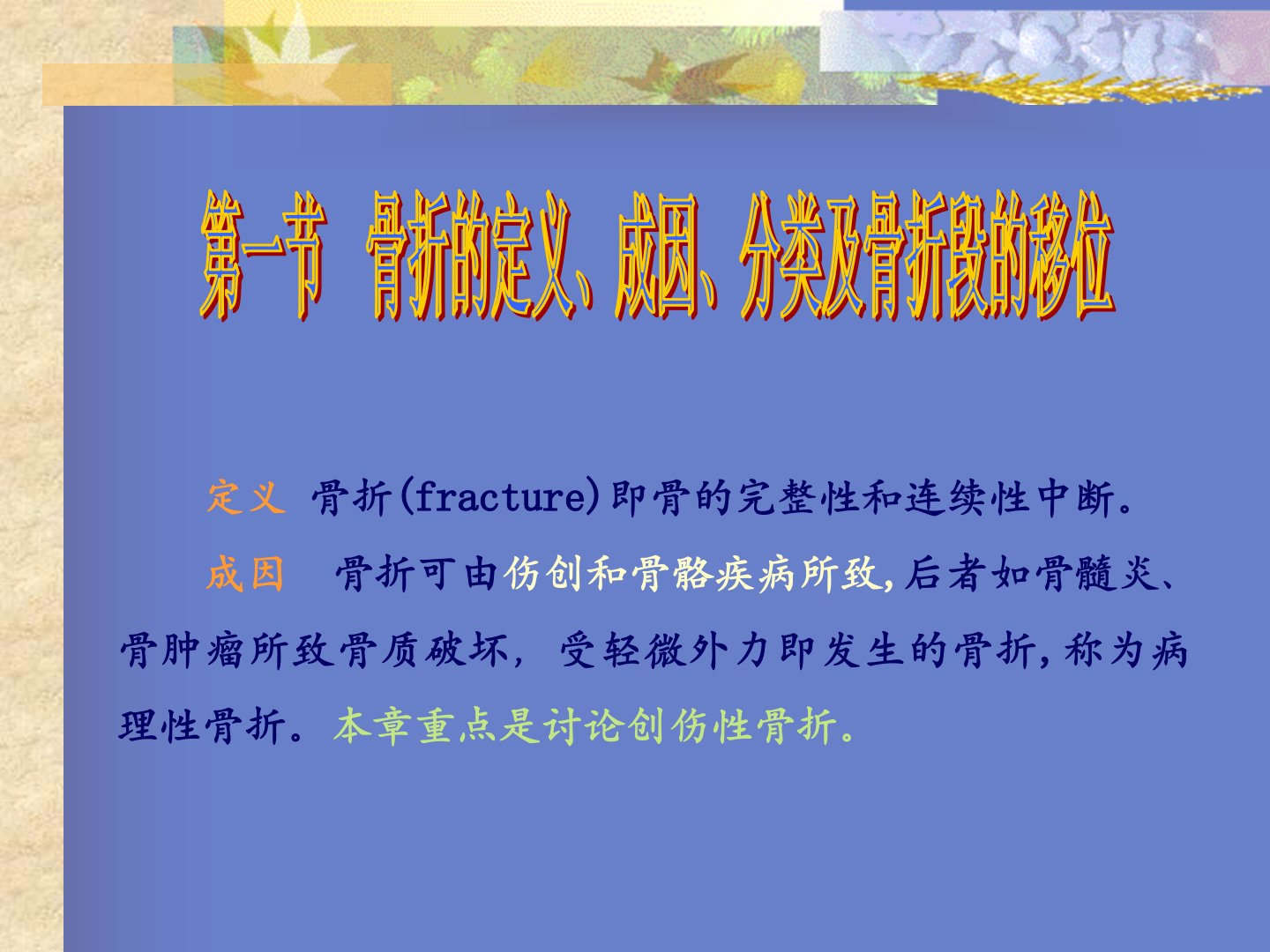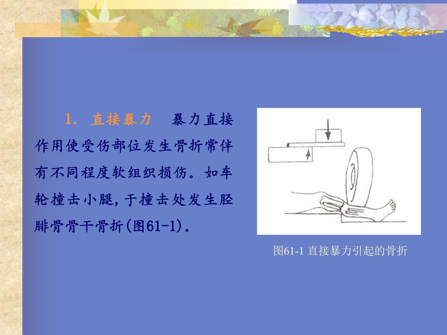 骨折概论定义骨折(fracture)即骨的完整性和连续性中断。成因骨折可由伤创和骨骼疾病所致,后者如骨髓炎、骨肿瘤所致骨质破坏,受轻微外力即发生的骨折,称为病理性骨折。本章重点是讨论创伤性骨折。第一节骨折的定义、成因、分类及骨折段的移位1.直接暴力暴力直接作用使受伤部位发生骨折常伴有不同程度软组织损伤。如车轮撞击小腿,于撞击处发生胫腓骨骨干骨折(图61-1)。图61-1直接暴力引起的骨折图61-2间接暴力引起的骨折图62-46伸直型桡骨下端的骨折典型移位图62-28伸直型肱骨髁上骨折图61-3肌拉力引起的骨折2.间接暴力暴力通过传导、杠杆、旋转和肌收缩,使肢体远处发生骨折。如跌倒时以手掌撑地,...