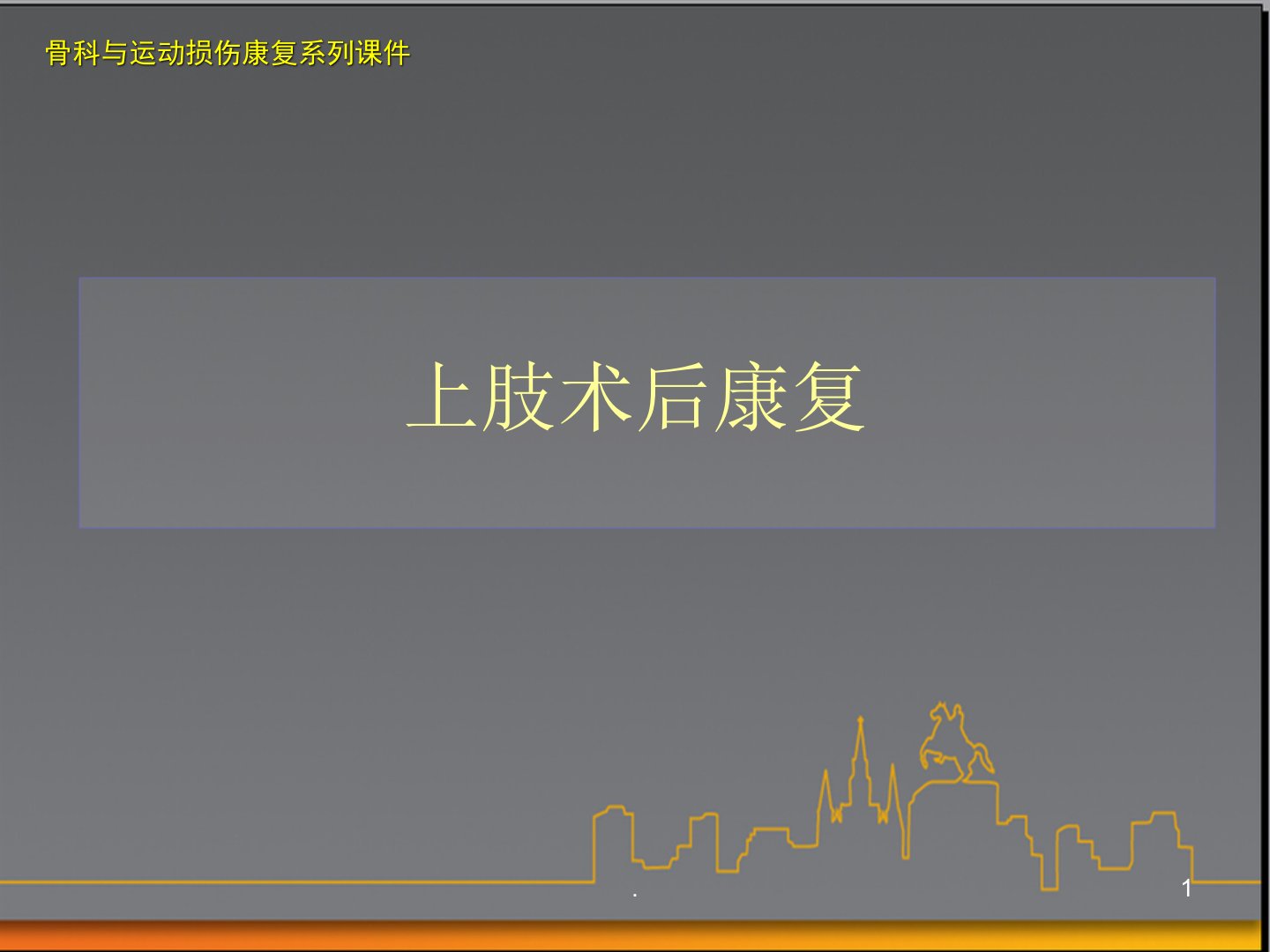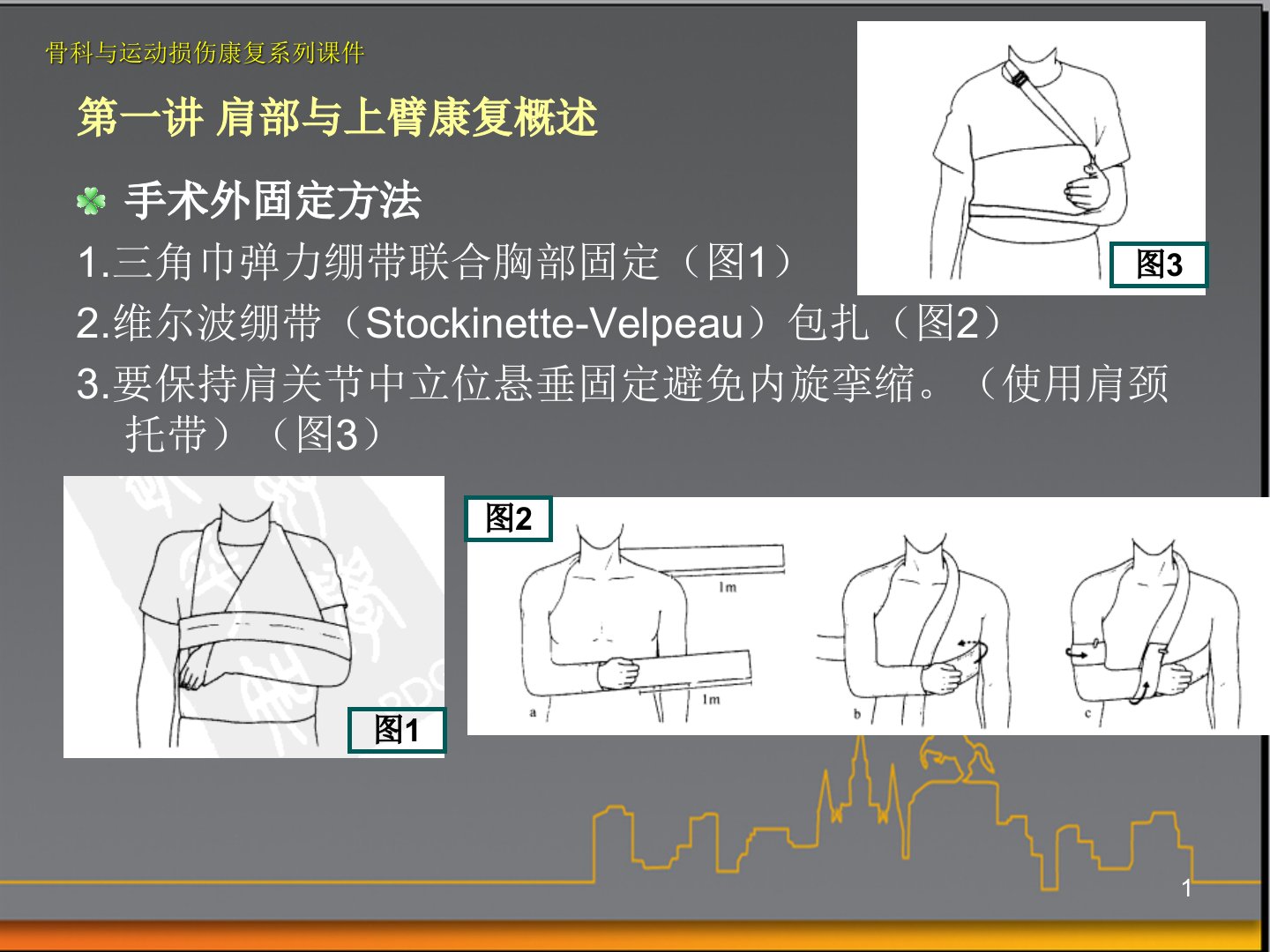 《骨科与运动损伤康复系列课件上肢术后康复》摘要本课件聚焦骨科与运动损伤的上肢术后康复。手术外固定方法有三角巾弹力绷带联合胸部固定、维尔波绷带包扎且要保持肩关节中立位悬垂固定避免内旋挛缩。术后第1天起患者可进行握拳与伸指运动、颈部运动与深呼吸以改善血液循环、减轻肿胀、防止肌肉挛缩。康复训练分阶段进行:1第1阶段:术后23周以改善关节活动度的被动运动为主包括钟摆运动、被动前屈、外旋、内旋、滑轮运动等需在肩关节放松下进行。2第2阶段:主动与抗阻运动增强肩部肌力遵循“5”字原则。3第3阶段:以肩部等长运动为主开展抗阻外旋、后伸、外展、前屈运动。4第4阶段:术后6个月到1年ROM基本正常后进行综合训练如牵伸运动、外旋运动、后伸内旋提拉运动等。需注意未涉及外展运动反之外旋不充分就外展可能造成损伤。有条件的医院可借助设备训练但其疗效待进一步验证。