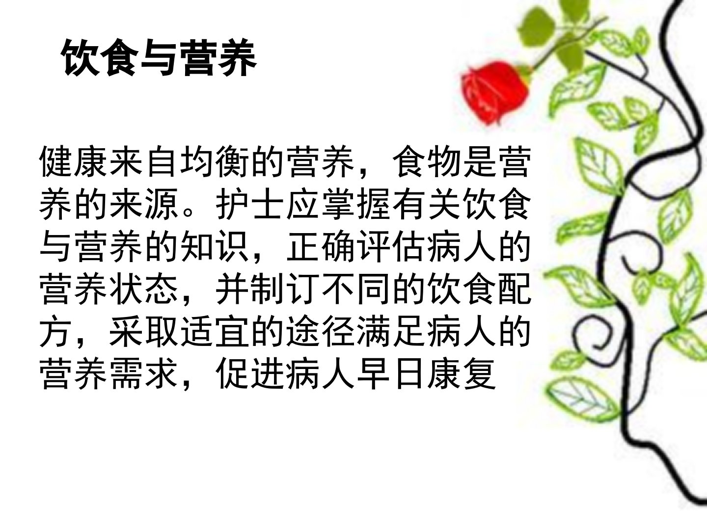健康源自均衡营养食物是营养的主要来源。护士需掌握饮食与营养知识正确评估病人营养状态制定个性化饮食方案。七大营养素包括蛋白质、脂类、糖类、无机盐、维生素、水和纤维素。骨折愈合需蛋白质、不饱和脂肪酸等营养素补充营养不良则会影响伤口愈合导致免疫力下降。骨折后病人营养代谢经历急性损伤、转折点、合成代谢和脂肪累积等阶段各阶段营养需求不同。评估病人营养状况可通过健康史询问、人体测量和实验室检查。饮食指导方面骨科病人膳食种类多样包括高热量高蛋白、高膳食纤维、富含维生素和无机盐及微量元素的饮食。同时蛋白质补充、多食富含胶原食物也很重要。饮食需按病程合理调配忌不消化之物、过量糖类、带色素饮料、过多骨头汤、盲目补钙及恢复期服用三七片。