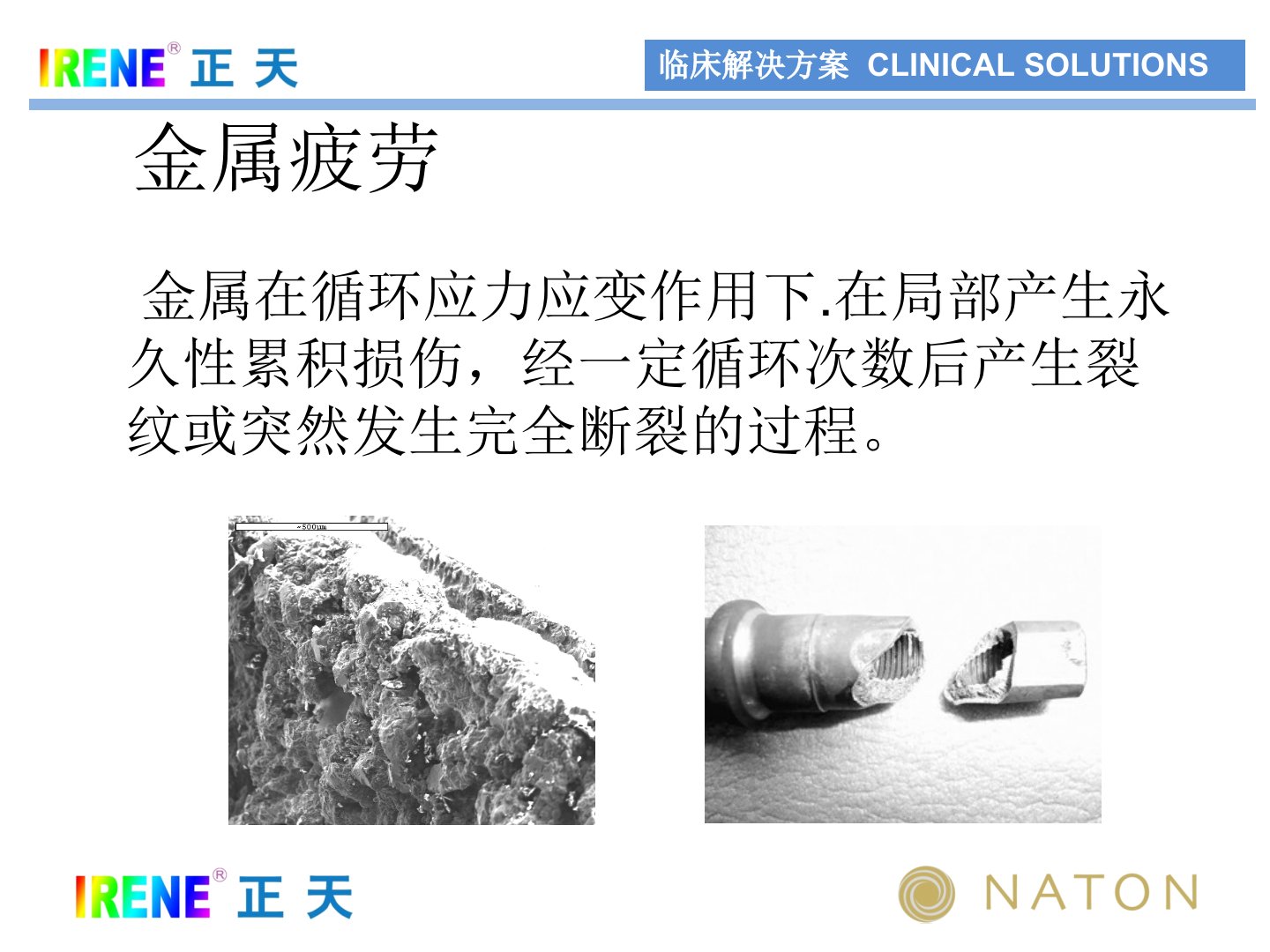 骨科治疗中内固定物断裂是医生面临的难题。金属在循环应力下会产生永久性累积损伤最终导致断裂。与不锈钢相比医用钛材单次负荷能力较差但重复应力承受力强。内固定物断裂原因复杂患者方面包括骨折不愈合、内植物疲劳折断、过度负重、不遵医嘱过早负重、意外摔倒及锻炼方式不当等;术者方面则涉及术前设计和选择错误、复位不充分、钢板放置不当、螺钉螺孔选择错误、钢板应用原则不当、不当塑性、非规范操作等问题;此外内植物本身材质、生产工艺、产品设计存在缺陷以及不同厂家产品混用、不同材质混合应用造成的电化学腐蚀等也会导致断裂。虽然不能完全避免内植物断裂但通过努力可减少其发生。