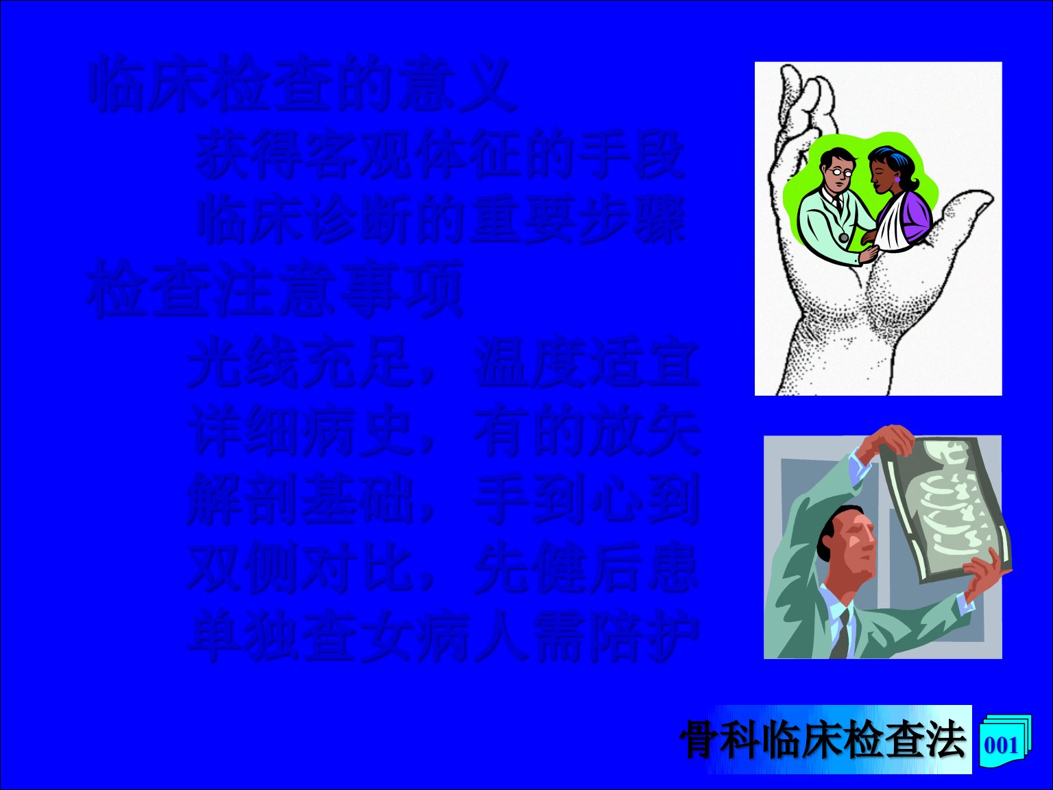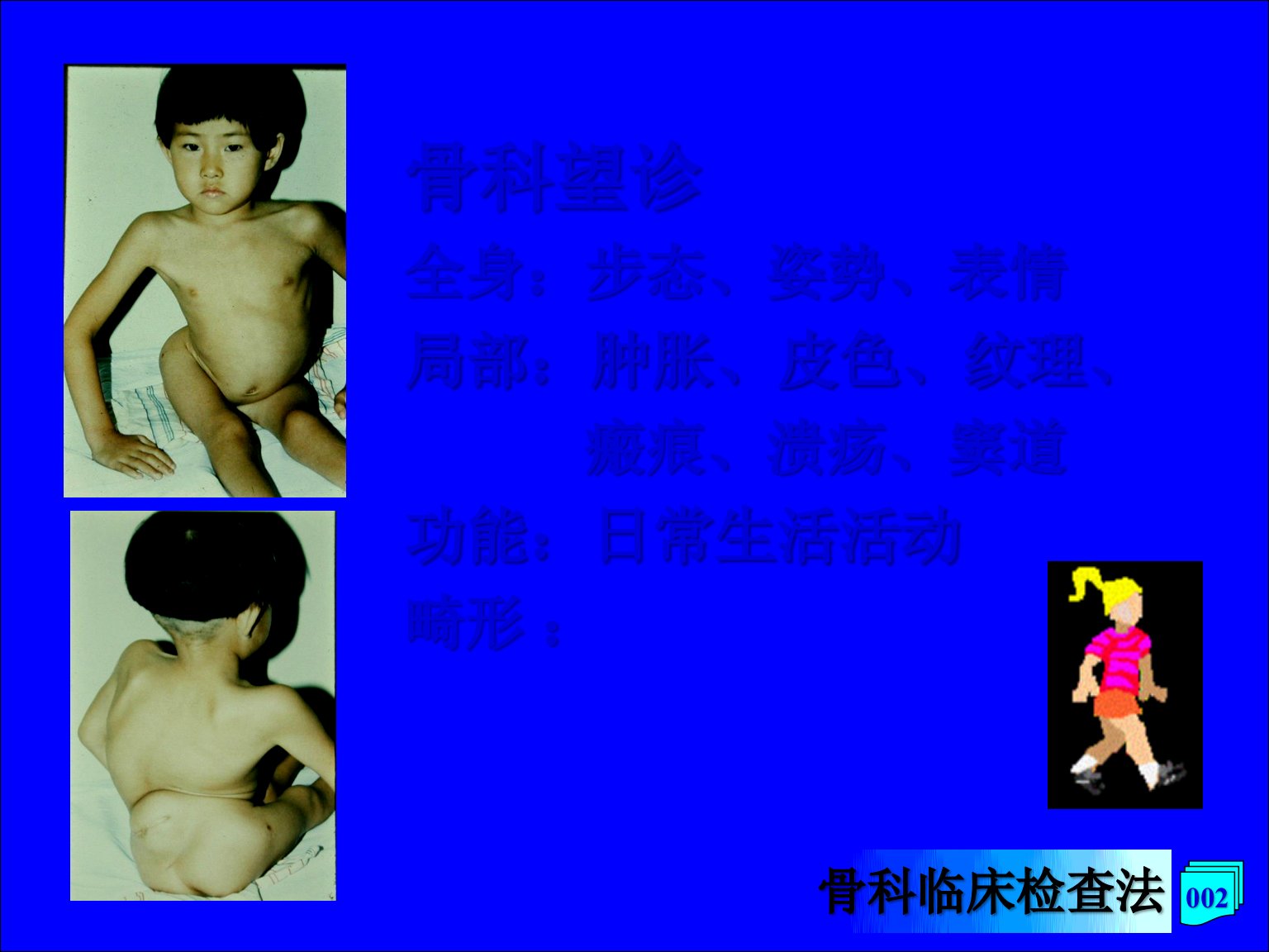 骨科临床检查临床检查的意义获得客观体征的手段临床诊断的重要步骤检查注意事项光线充足,温度适宜详细病史,有的放矢解剖基础,手到心到双侧对比,先健后患单独查女病人需陪护001骨科望诊全身:步态、姿势、表情局部:肿胀、皮色、纹理、瘢痕、溃疡、窦道功能:日常生活活动畸形:002长度测量躯干:颅顶→尾骨尖(躯干/肢长)上肢:肩峰→桡骨茎突(中指尖)上臂:肩峰→肱骨外上髁前臂:肱骨外上髁→桡骨茎突/尺骨鹰嘴→尺骨茎突下肢:(摆正骨盆)髂前上棘(脐、大转子)→内踝下缘大腿:髂前上棘→膝关节内缘(股骨内上髁最高点)小腿:膝关节内缘→内踝下缘(腓骨头→外踝下缘)003004长度测量004周径测量原则:取双侧对应...