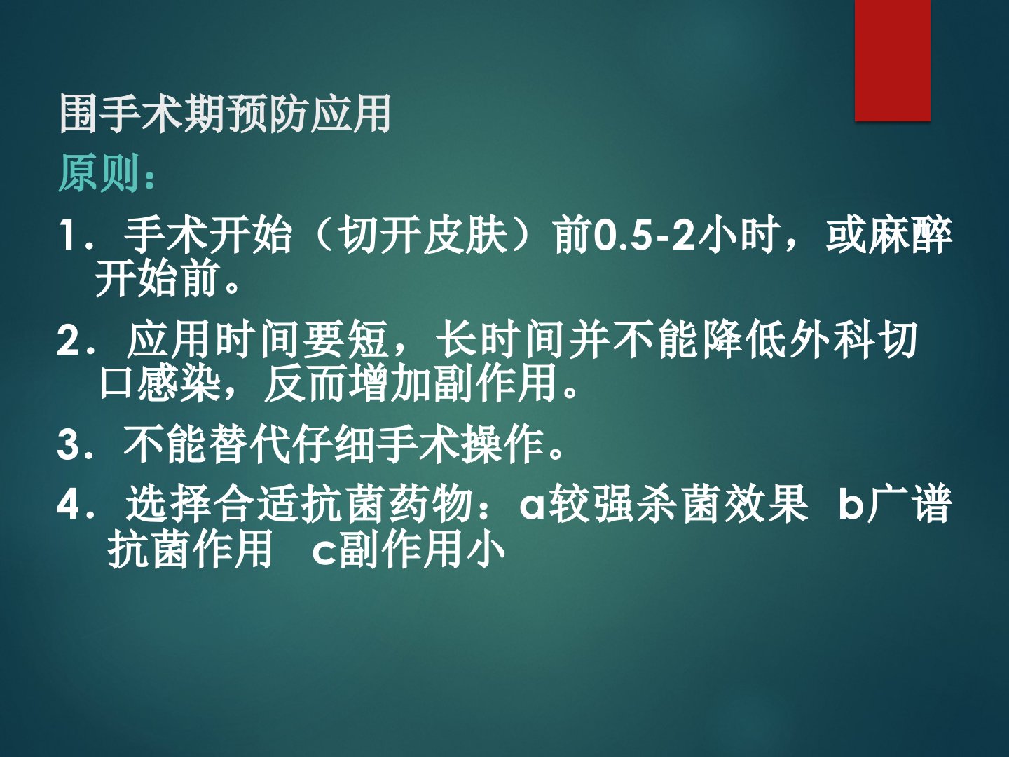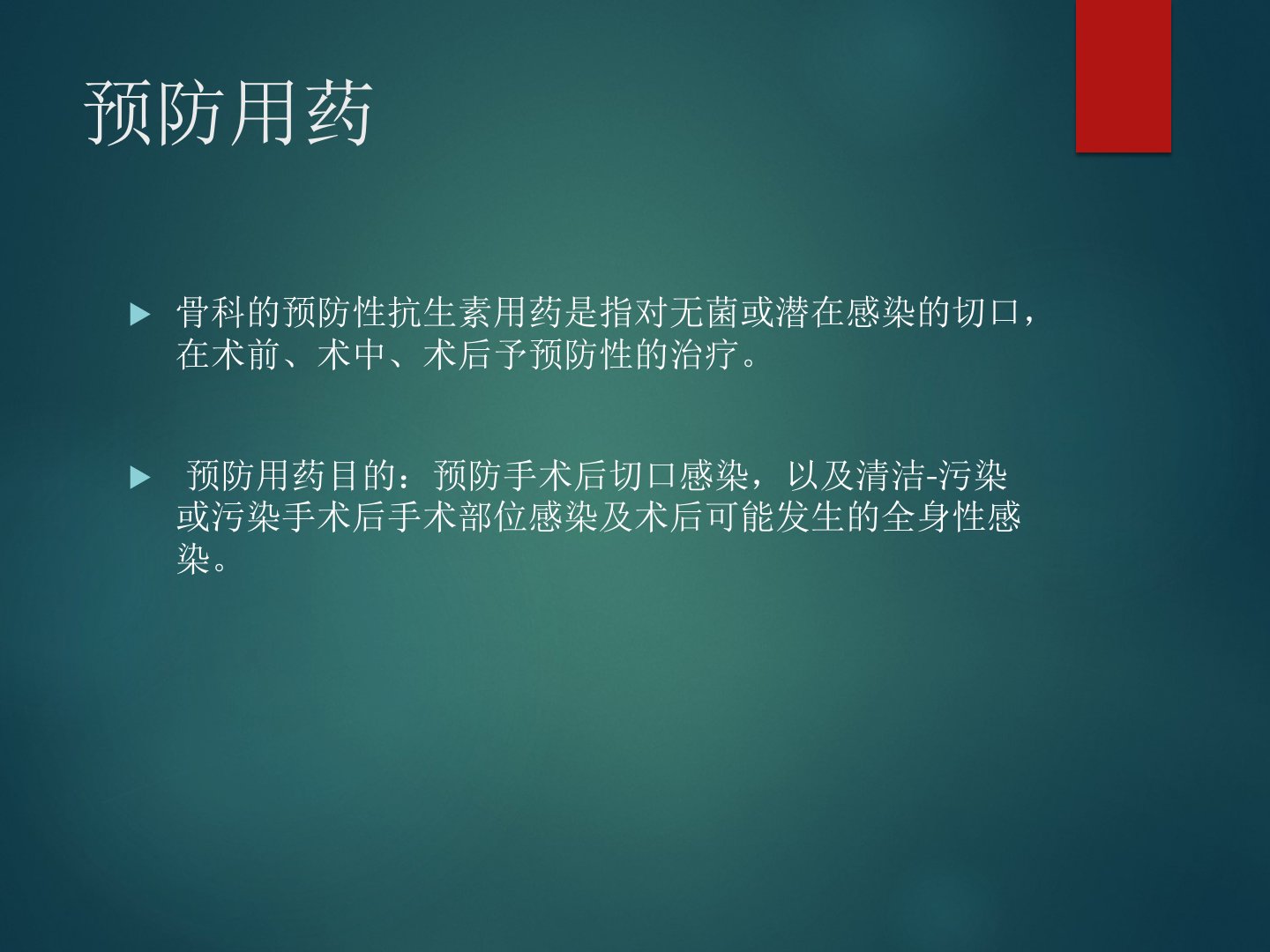 骨科预防性抗生素用药用于无菌或潜在感染切口目的是预防术后切口及手术部位感染。用药原则包括:术前052小时或麻醉前给药应用时间要短;选择杀菌强、广谱、副作用小的药物;手术超3小时或失血量大需追加剂量;总用药时间一般不超24小时个别情况可延长至48小时特定情况(如人工植入物手术、高龄、糖尿病等)可适当延长。具体预防用药如下:1无内植物手术:术前30分钟静滴广谱抗生素术后使用时间小于24小时可根据情况适当延长。2有内植物手术:术前30分钟静滴广谱抗生素术后使用时间小于48小时可根据情况延长至57天。3关节置换手术:术前30分钟应用广谱抗生素手术时间大于3小时追加一组术后使用57天特定情况可延长。4开放性损伤:术前30分钟静滴广谱抗生素术后根据伤口情况选用抗生素治疗310天。感染性疾病用药应根据病原菌种类及药敏结果调整留取标本送细菌培养。骨、关节感染应选用骨、关节腔内药物浓度高且细菌不易产生耐药性的抗菌药物。骨与关节结核治疗时间多在15年左右。术后伤口感染需根据分泌物培养及药敏试验结果选择抗生素。同时要避免抗生素使用误区。