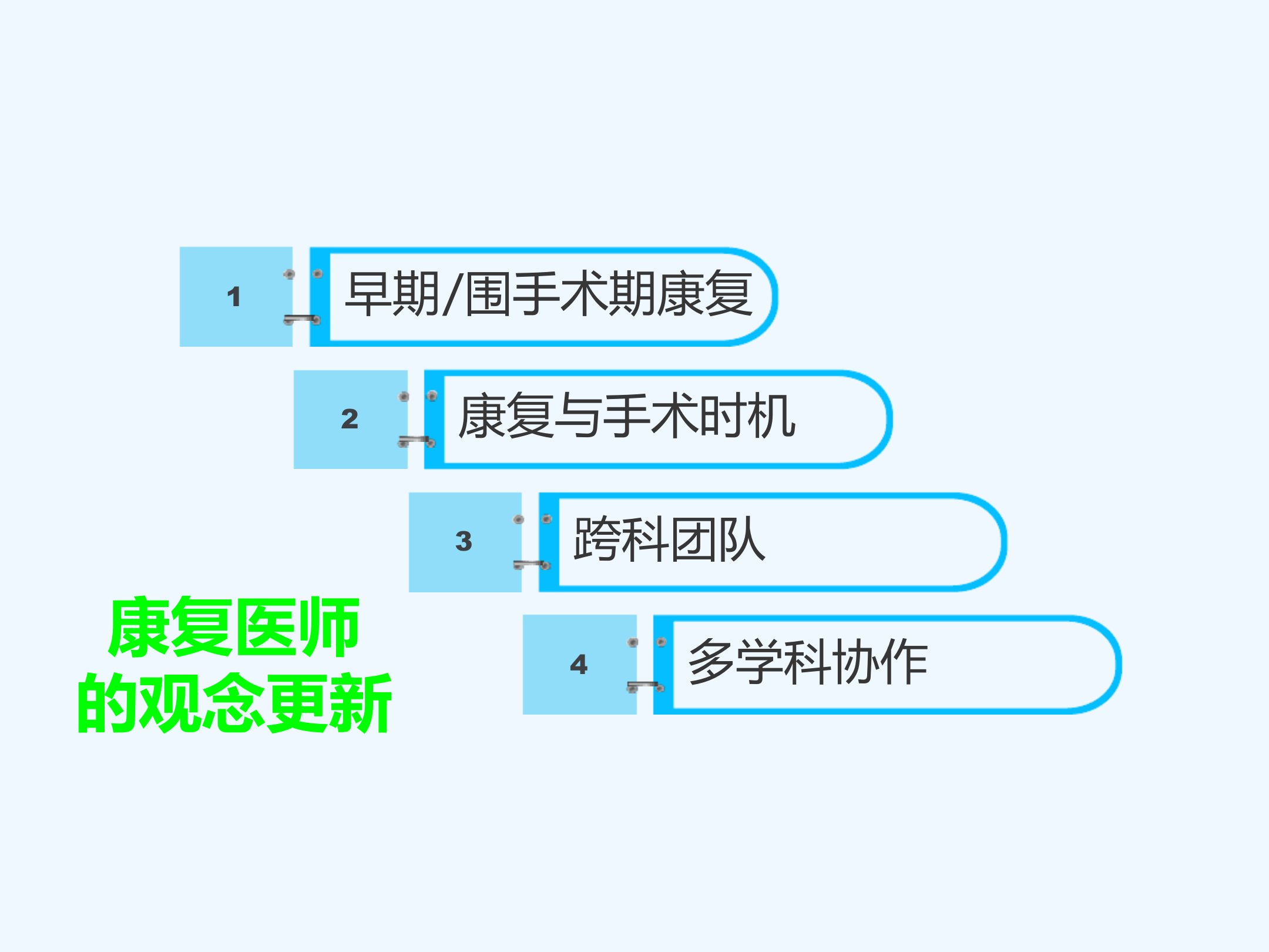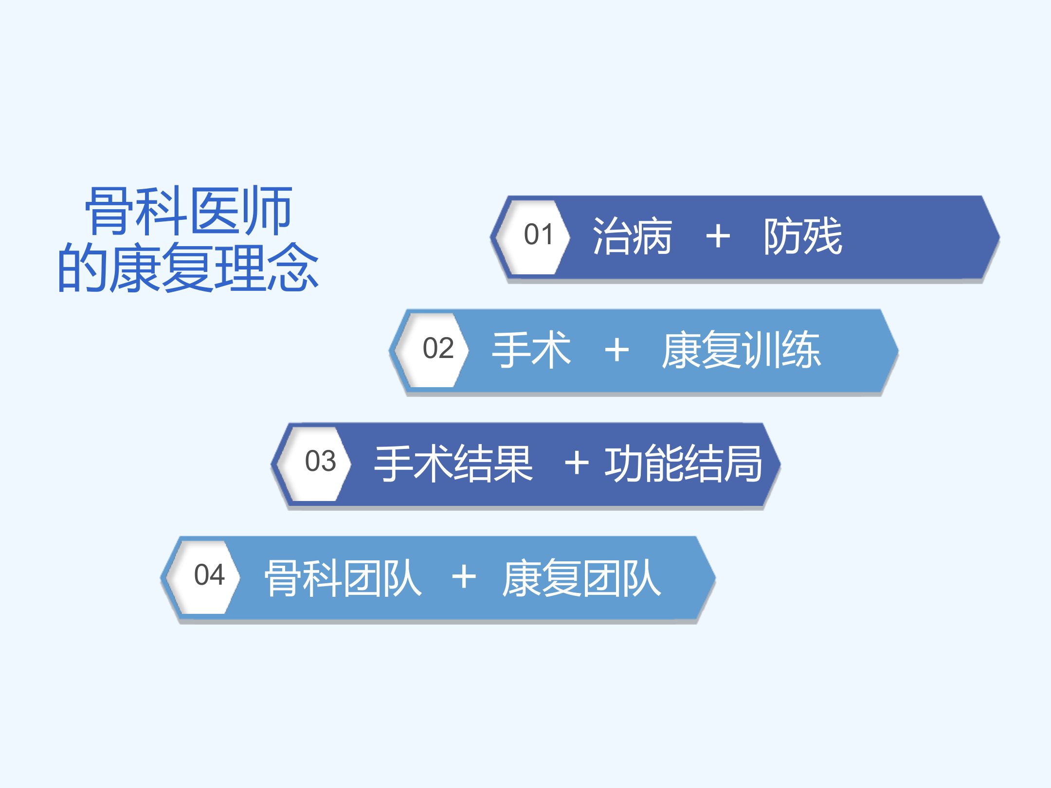 骨科——康复一体化旨在治病防残涉及手术康复训练、手术结果与功能结局评估强调骨科团队与康复团队的紧密协作及骨科医师的康复理念包括早期围手术期康复、康复与手术时机的把握、跨科团队及多学科协作等。美国物理治疗协会骨科分会发布了相关临床实践指南涉及足跟痛、踝关节稳定性、肩部疼痛、腰背痛、膝关节痛等多种骨科疾病。同时国内华西、北医三院等也制定了骨科常见疾病术后康复模式和临床路径。骨科康复服务对象广泛主要目的为消除肿胀疼痛、加速创伤愈合、预防挛缩畸形、增强肌力、改善平衡功能等以提高患者生活质量。康复常用技术包括力量训练、关节松动术等并强调个体化、多模式、超前镇痛方案及完善的疼痛评估体系。此外还介绍了等速肌力评定及训练系统特点以及前交叉韧带重建术后、髋关节置换术后的康复流程。