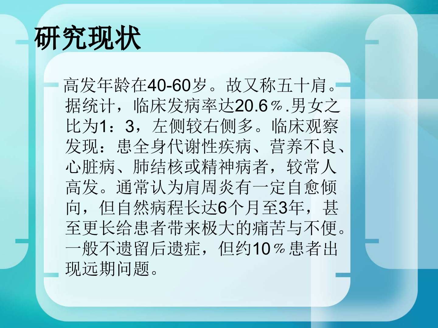 肩周炎全称肩关节周围炎是50岁左右人群的常见病以肩关节疼痛和活动不便为主要症状病变特点广泛。高发年龄在4060岁临床发病率达206女性高于男性左侧多于右侧患全身代谢性疾病者高发有一定自愈倾向但病程长。其成因多样包括外邪、劳损、外伤及内伤等。原发性肩周炎病程分三期:疼痛期、僵硬期、融冻期。诊断要点包括年龄、病史、症状及X线检查等需与颈椎病、肺尖部肿瘤、肩关节结核等病相鉴别。治疗方面针灸效果显著方法多样包括电针、穴位注射、针刀等安全可靠。中药治疗以祛风散寒、活血化瘀为主。中医手法包括推拿按摩和运动疗法能舒筋通络、解痉止痛。此外温热式低周波、高压氧、磁场和超短波等理疗方式也有效果。患者坚持肩关节功能锻炼也可改善症状、巩固疗效。