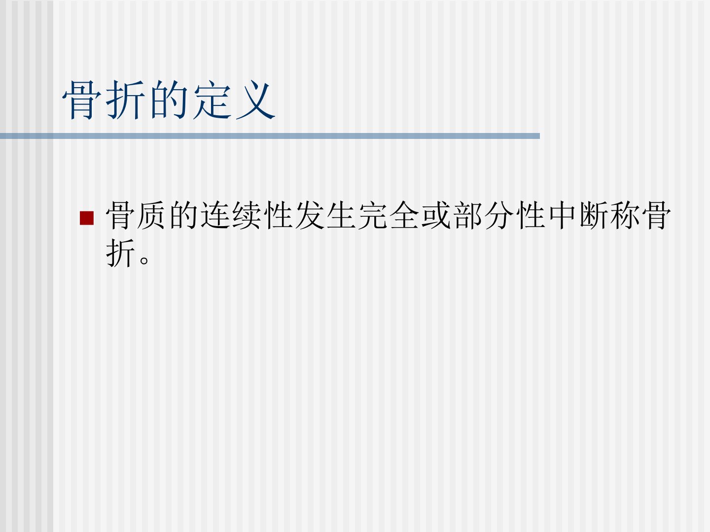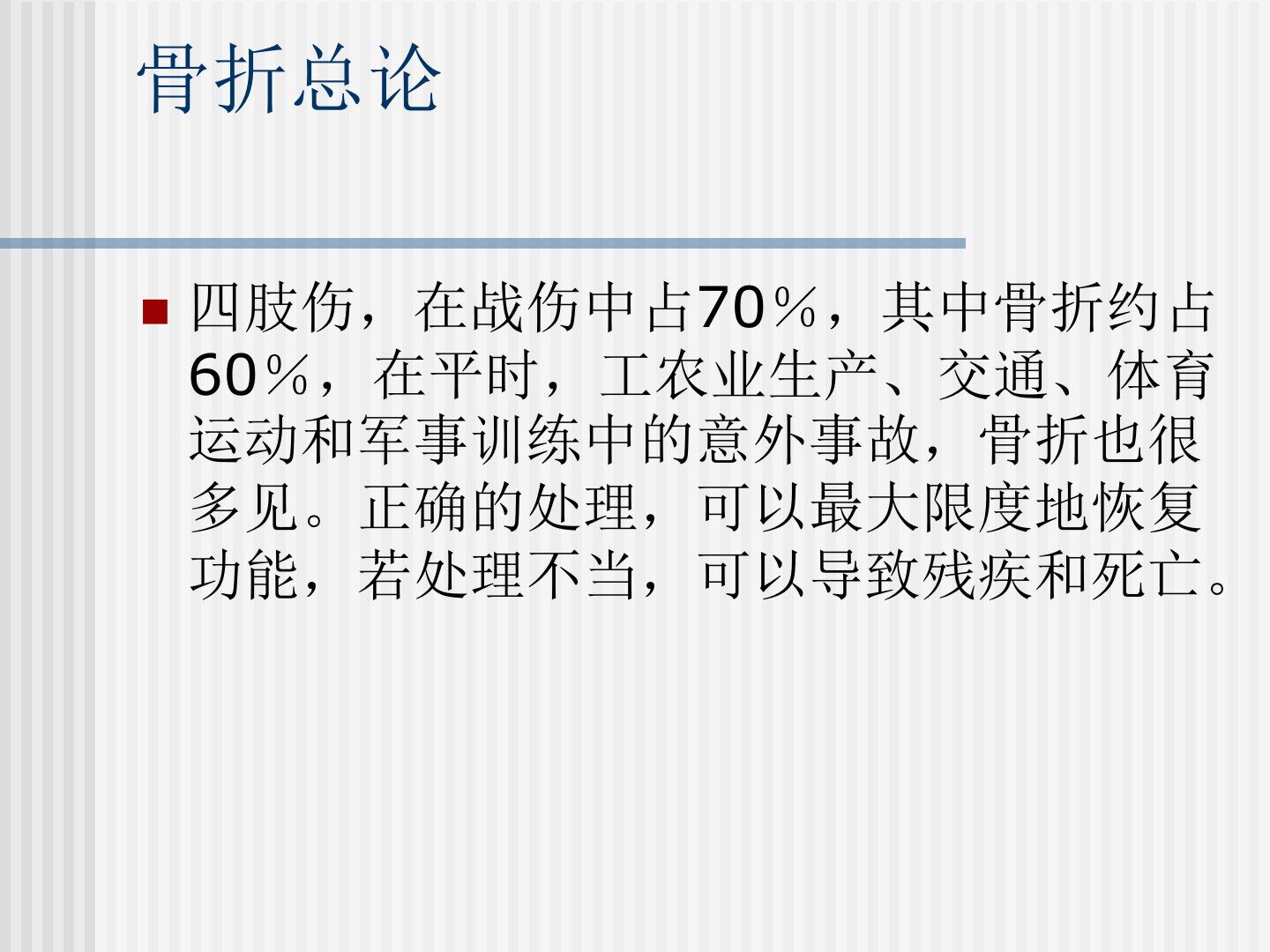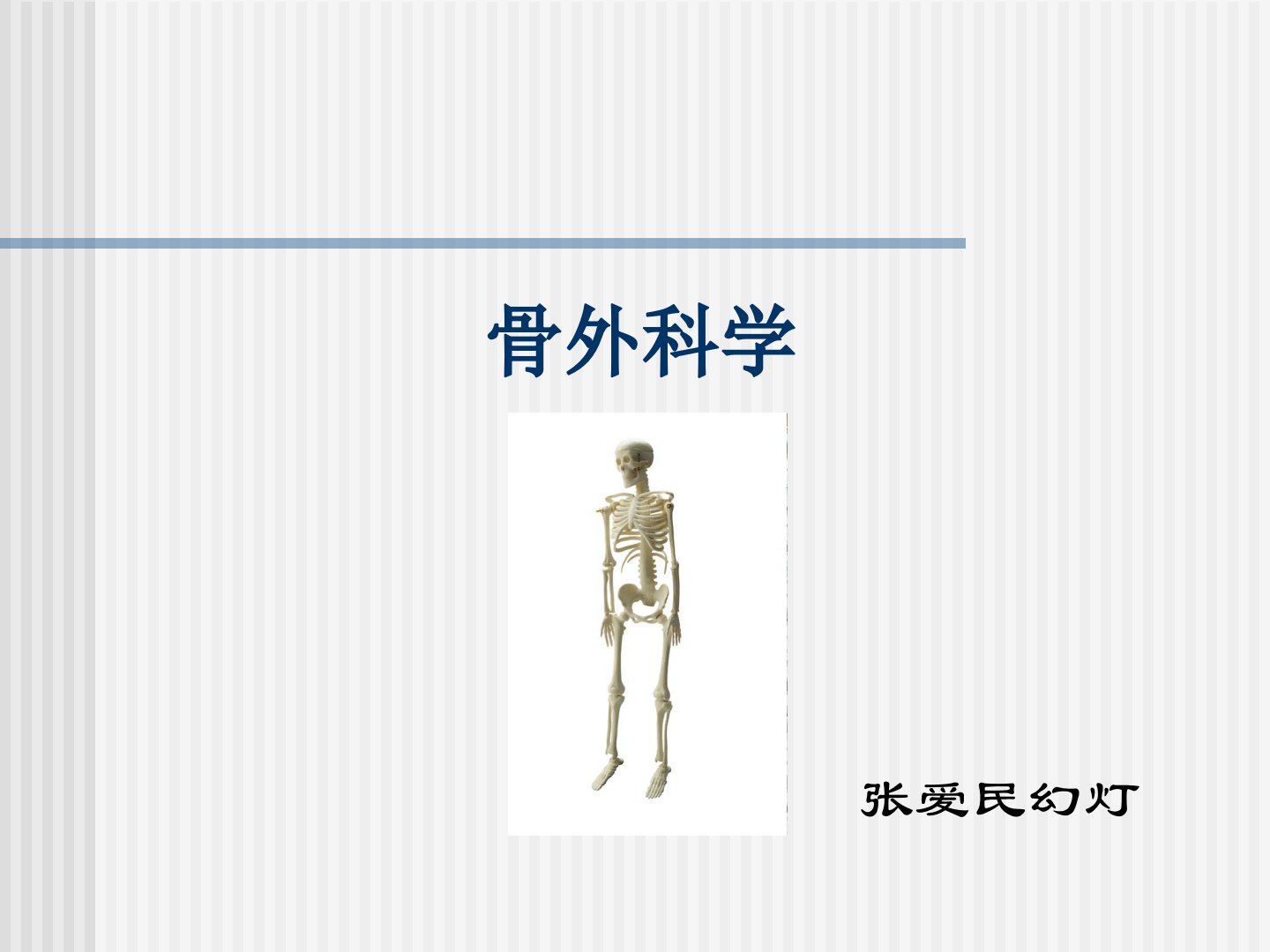 骨外科学中张爱民幻灯介绍了骨折相关知识。骨折成因分为直接暴力和间接暴力前者多为开放性骨折软组织损伤重;后者骨折距暴力接触点远多为闭合骨折包括挤压、折断、扭转作用及肌肉收缩导致的骨折还有病理性骨折。骨折分为完全性和不完全性修复需经历血肿机化期、原始骨痂形成期、骨痂改造塑型期。影响骨折愈合因素有年龄、全身健康情况、局部因素。骨折症状有全身表现如休克、体温增高局部表现有专有体征(畸形、反常活动、骨擦音或骨擦感)及其他疼痛、压痛、肿胀、瘀斑、功能障碍等。闭合性骨折治疗原则为复位、固定、功能锻炼和药物治疗其中复位可用持续牵引复位(皮肤牵引、骨牵引)还需进行固定。