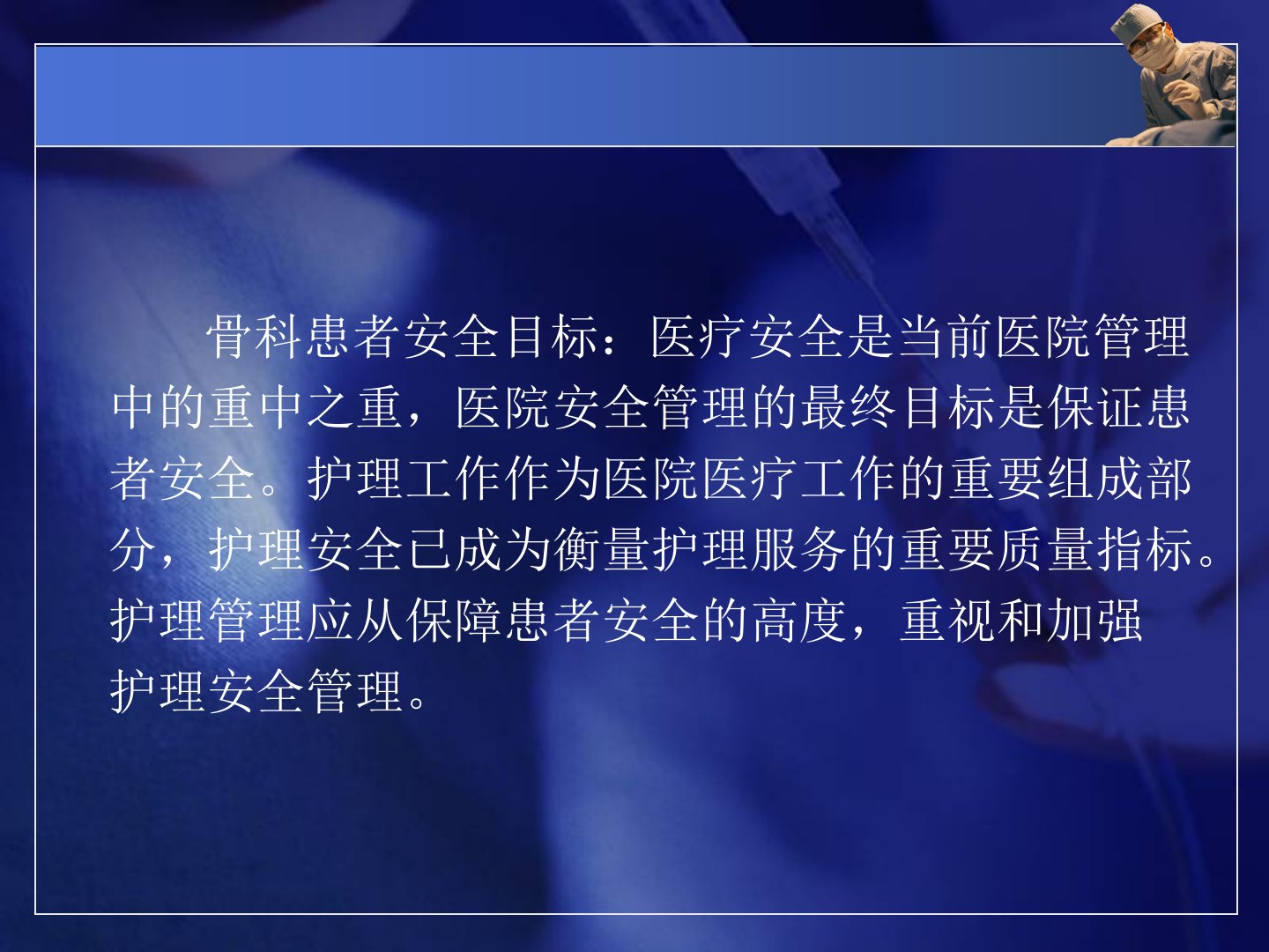 骨科患者的安全管理摘要随着对生命安全的重视WHO成立了“患者安全联盟”我国也在努力减少患者的安全损害。对于骨科患者而言安全尤为重要。骨科患者安全目标以保障患者医疗安全为核心护理管理需高度重视护理安全。骨科患者安全受多种因素影响病房要清洁整齐针对患者行走跌倒等问题要保持地面干燥设置扶手、呼叫装置调整马桶高度定期检查输液架做好防盗工作。安全设施方面约束带使用时要注意取得患者及家属理解、短期使用并观察等;支被架可防止盖被压迫肢体;可调式肢体保护架用于肢体保护和保暖。辅助器方面拐杖、手杖、助行架等使用时都有相应的注意事项。对有自杀倾向的患者要安置在多人房间严格执行制度重点巡视陪护识别伪装积极沟通。骨科住院患者安全教育也很关键入院时要介绍环境、制度指导使用辅助器具;术前保持患肢功能位;术后活动要注意人员保护、时间地点选择等;出院时要给予饮食、功能锻炼等指导。此外骨科患者风险管理还包括压疮、肢体血液循环障碍、翻身引起高位截瘫患者呼吸心跳骤停、麻醉后体位不当导致血压下降、伤口引流不畅、髋关节置换术后脱位等情况都需采取相应管理措施。