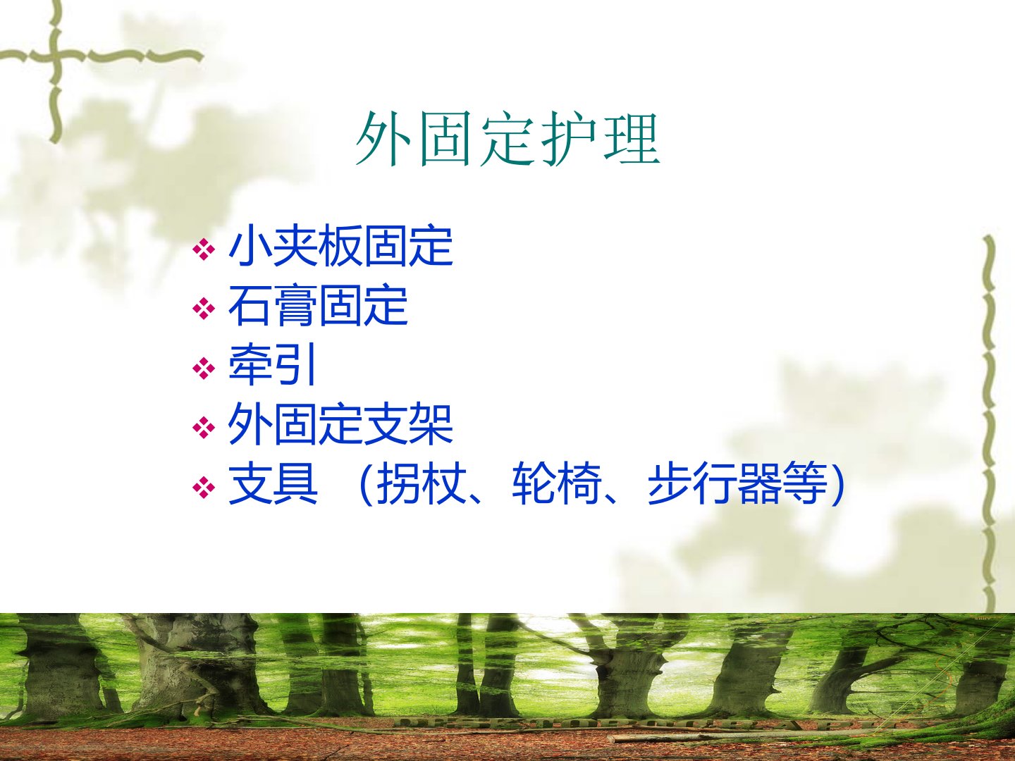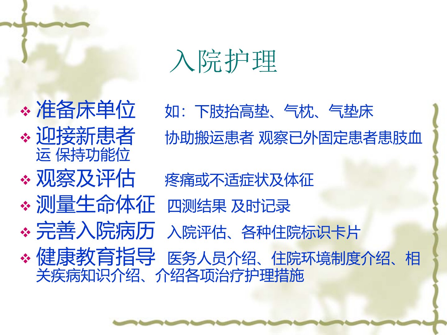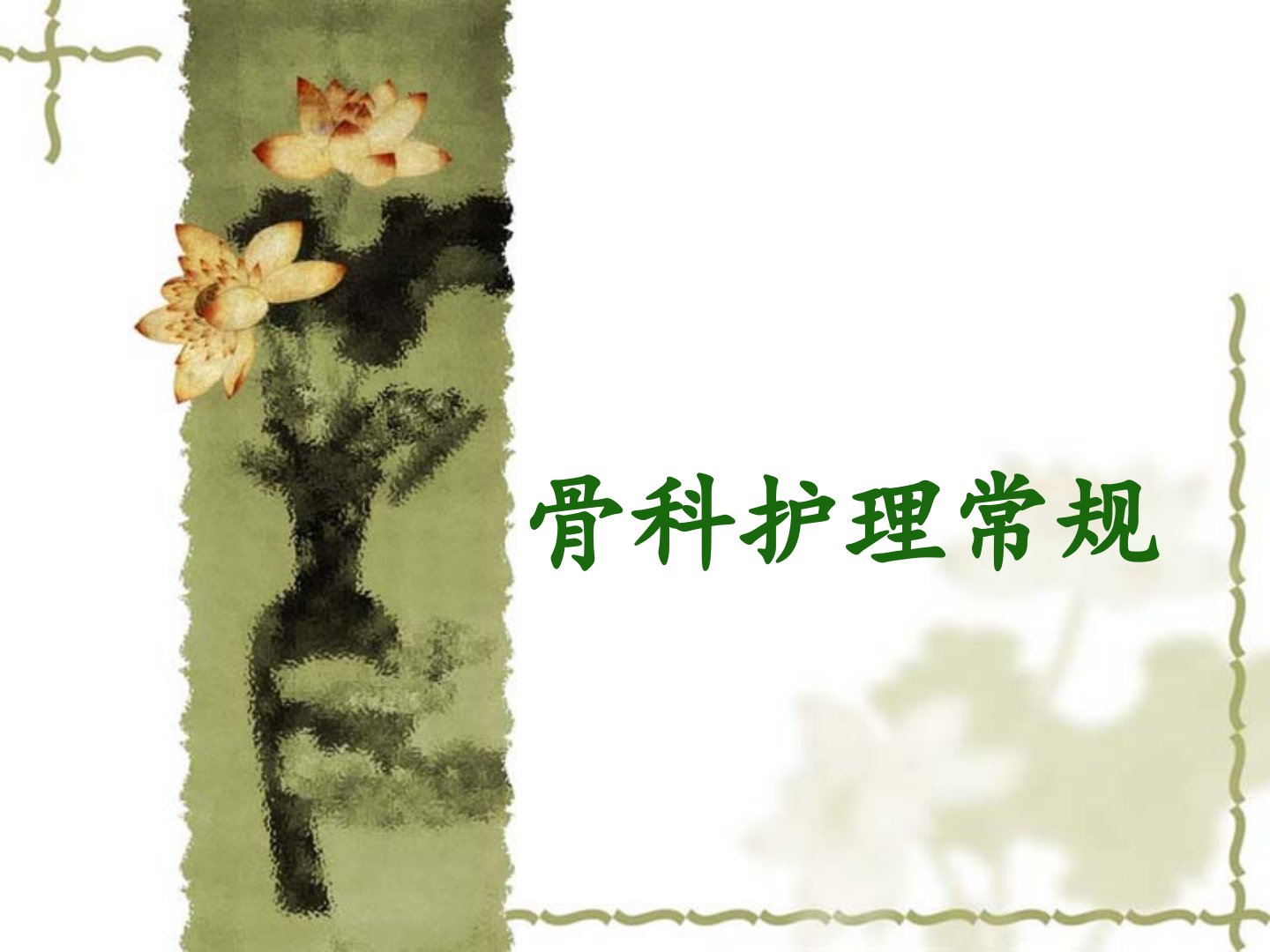 骨科护理常规涵盖多方面内容。入院护理时要准备床单位迎接新患者并协助搬运观察外固定患者患肢血运、保持功能位评估疼痛等体征及时记录四测结果完善病历与评估开展健康教育。外固定护理中小夹板固定多用于肱骨等部位骨折关节内等骨折不适合;石膏外固定目的为维持固定等有普通石膏和高分子夹板等分类护理需做好固定前准备、保持有效固定、预防并发症;牵引分为手法、皮肤、骨骼、兜带牵引等一般护理要保持有效牵引注意牵引重量、方向等做好皮肤完整性护理预防并发症。围手术期护理术前要进行心理、身体、呼吸道、胃肠道等方面准备;术后要妥善安置患者注意固定装置与管道保护观察生命体征、手术切口做好引流管护理、不适护理指导患者进行功能锻炼。