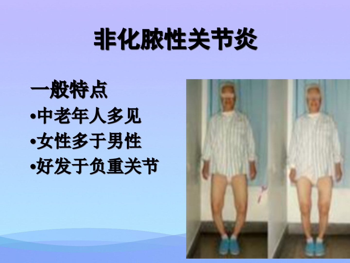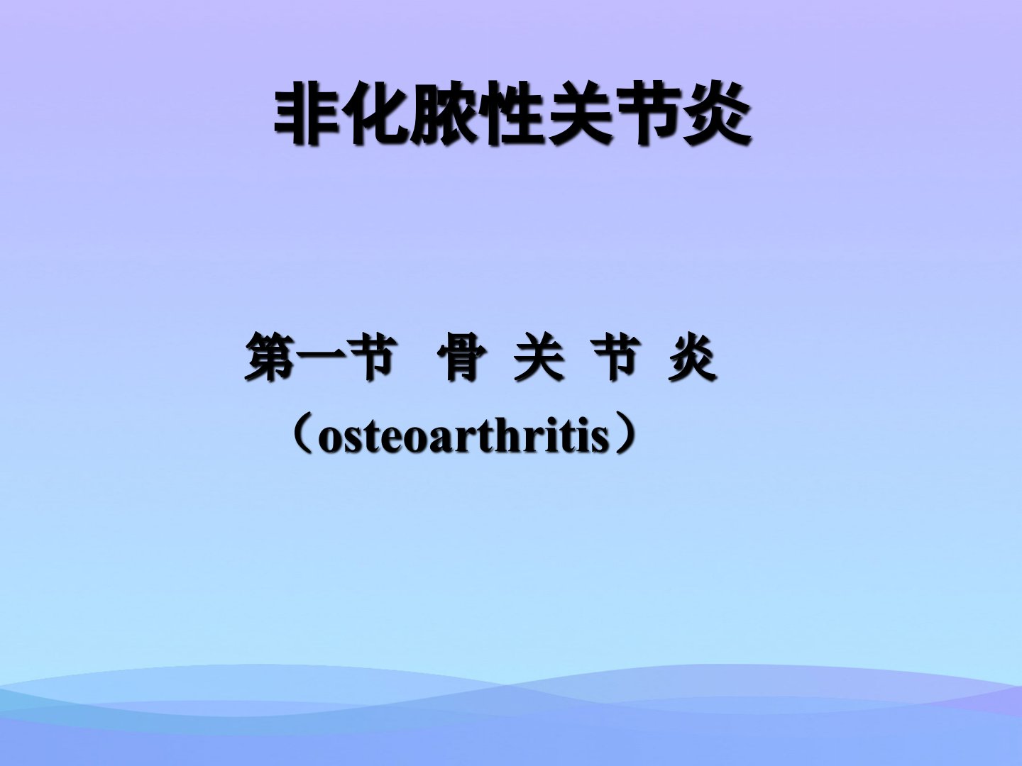 骨科非化脓性关节炎非化脓性关节炎第一节骨关节炎(osteoarthritis)非化脓性关节炎一般特点•中老年人多见•女性多于男性•好发于负重关节非化脓性关节炎分类原发性:发病原因不明,多见于50岁以上的肥胖者。继发性:由于先天性畸形,创伤,关节不稳等引起。非化脓性关节炎病理•关节软骨•软骨下骨•滑膜增殖型、纤维型•关节囊与周围肌肉非化脓性关节炎临床表现•疼痛•关节僵硬•关节肿胀•浮髌试验阳性•肌肉萎缩•关节畸形非化脓性关节炎X线•关节间隙狭窄•骨赘形成•畸形•软骨下骨硬化非化脓性关节炎治疗•一般治疗•药物治疗•关节腔注射透明质酸钠•手术治疗非化脓性关节炎非化脓性关节炎非化脓性关节炎第二节强直性...