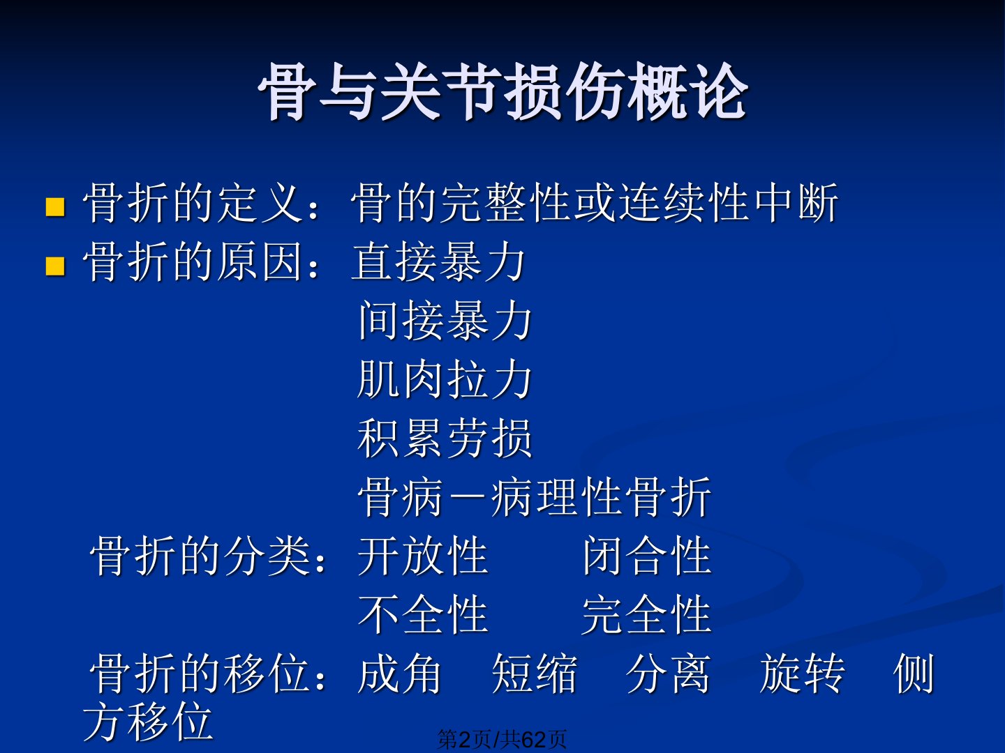 本文是骨科常见疾病概览主要涵盖骨折、关节脱位、脊柱脊髓损伤及骨盆骨折等关键疾病。骨折定义为骨的完整性或连续性中断原因包括直接暴力、间接暴力、肌肉拉力、积累劳损及骨病。骨折分为开放性与闭合性、不全性与完全性移位形式包括成角、短缩等。临床表现含局部畸形、反常活动等专有体征及疼痛、肿胀等全身症状。并发症分早期与晚期局部合并症有大出血、脊髓神经损伤等晚期则包括骨折延迟愈合、关节功能障碍等。治疗原则为复位、固定与功能锻炼复位包括手法与切开复位两种。关节脱位指关节面失去正常对合关系治疗以手法复位为主时间越早越好。脊柱脊髓损伤需根据损伤机制、暴力方向及部位分类治疗原则为矫正畸形、解除压迫及稳定脊柱。骨盆骨折多由暴力引起常合并全身多发损伤治疗需根据骨折类型选择。此外还介绍了化脓性骨髓炎其致病菌多为金葡菌等治疗强调早诊断、早治疗。