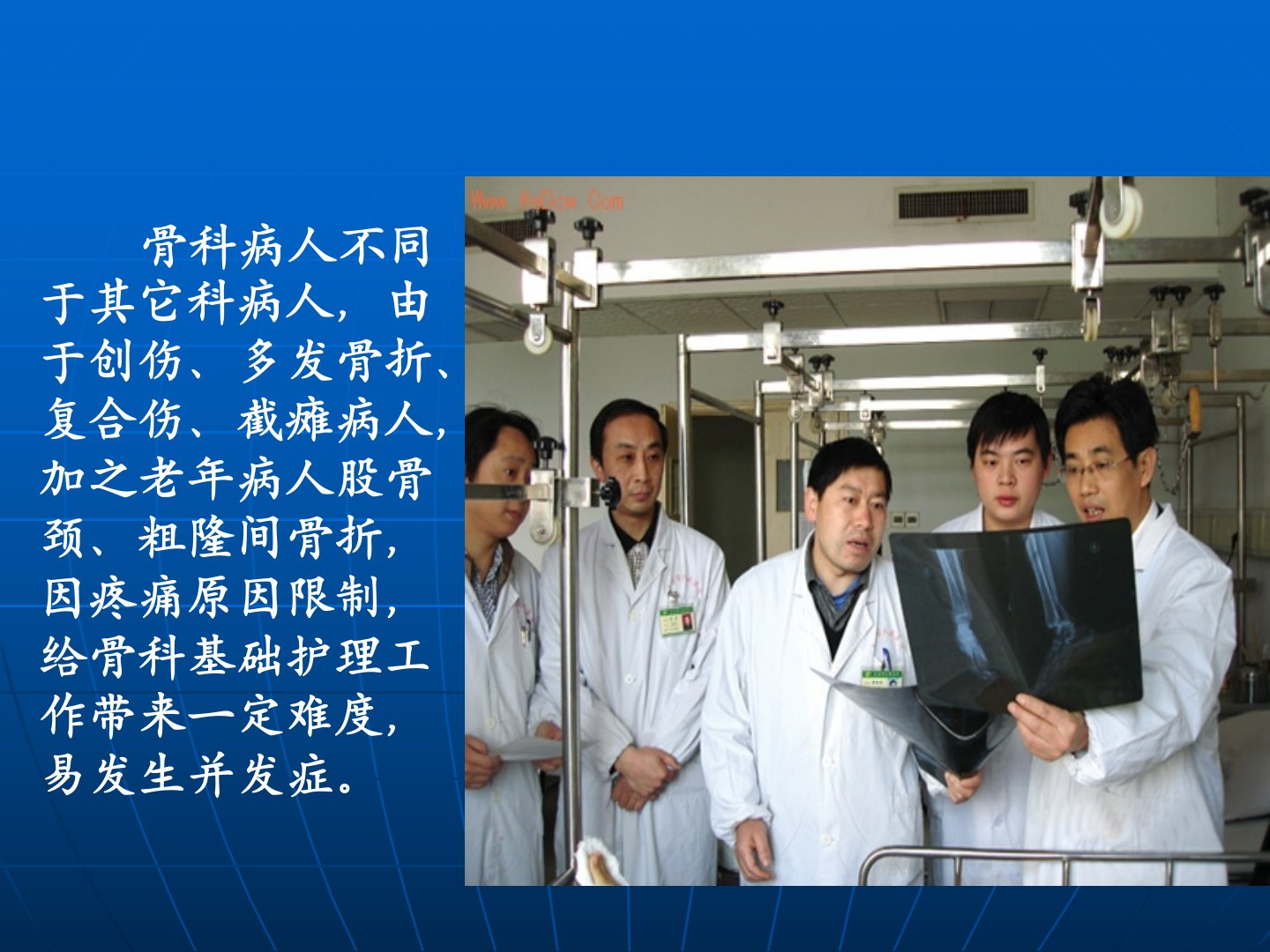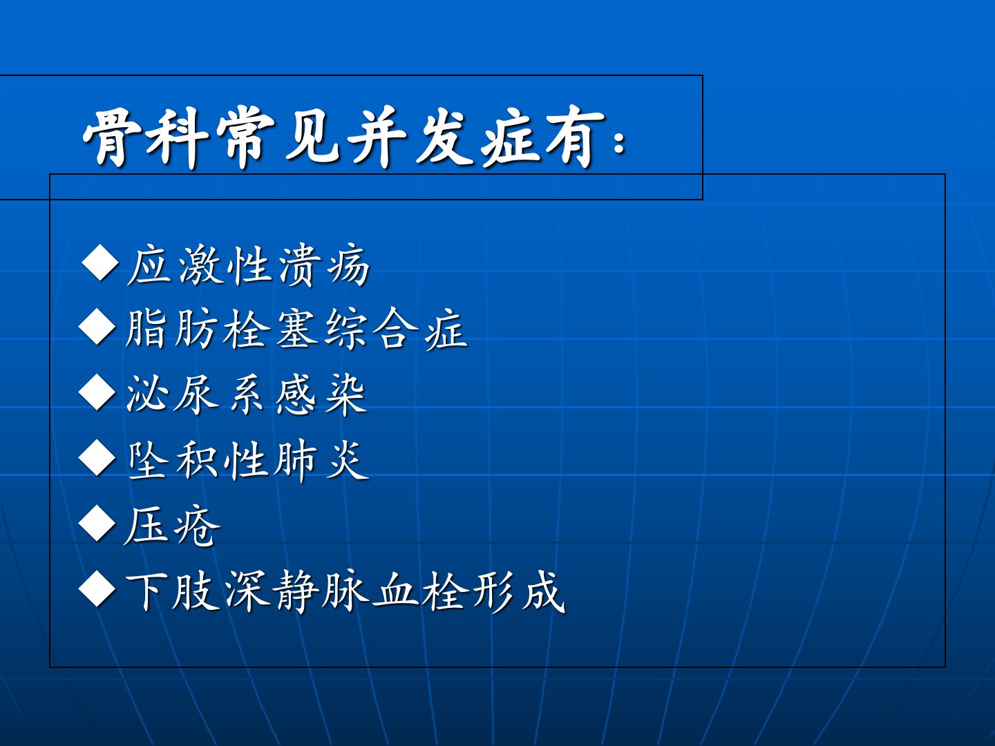 骨科病人因创伤、多发骨折等因素基础护理难度大易发生并发症常见并发症及防治要点如下:1应激性溃疡:骨折术后早期常见轻者呕血、黑便重者危及生命。病因包括创伤后机体状态改变、精神刺激及药物食物影响、疼痛刺激胃酸分泌等。预防需详细询问病史、保护胃粘膜严密观察病情及时止痛做好心理护理合理膳食。2脂肪栓塞综合症:骨盆或长骨骨折后2448h出现呼吸困难等症状发病突然进展迅速。治疗以对症和支持疗法为主包括纠正休克、呼吸支持、减轻脑损害、抗脂栓药物治疗。护理要点包括及时抗休克、就地固定患肢、密切观察病情、加强呼吸及皮肤护理、做好心理护理。3泌尿系感染:由细菌引起致病菌多为大肠杆菌等。预防需大量饮水、注意个人卫生、去除慢性感染因素。护理留置导尿管病人要防止逆感染、鼓励多饮水、训练膀胱反射功能、观察尿液情况。4坠积性肺炎:多因长期卧床等引发。护理对策包括体位引流、翻身拍背、吸痰、心理护理等。