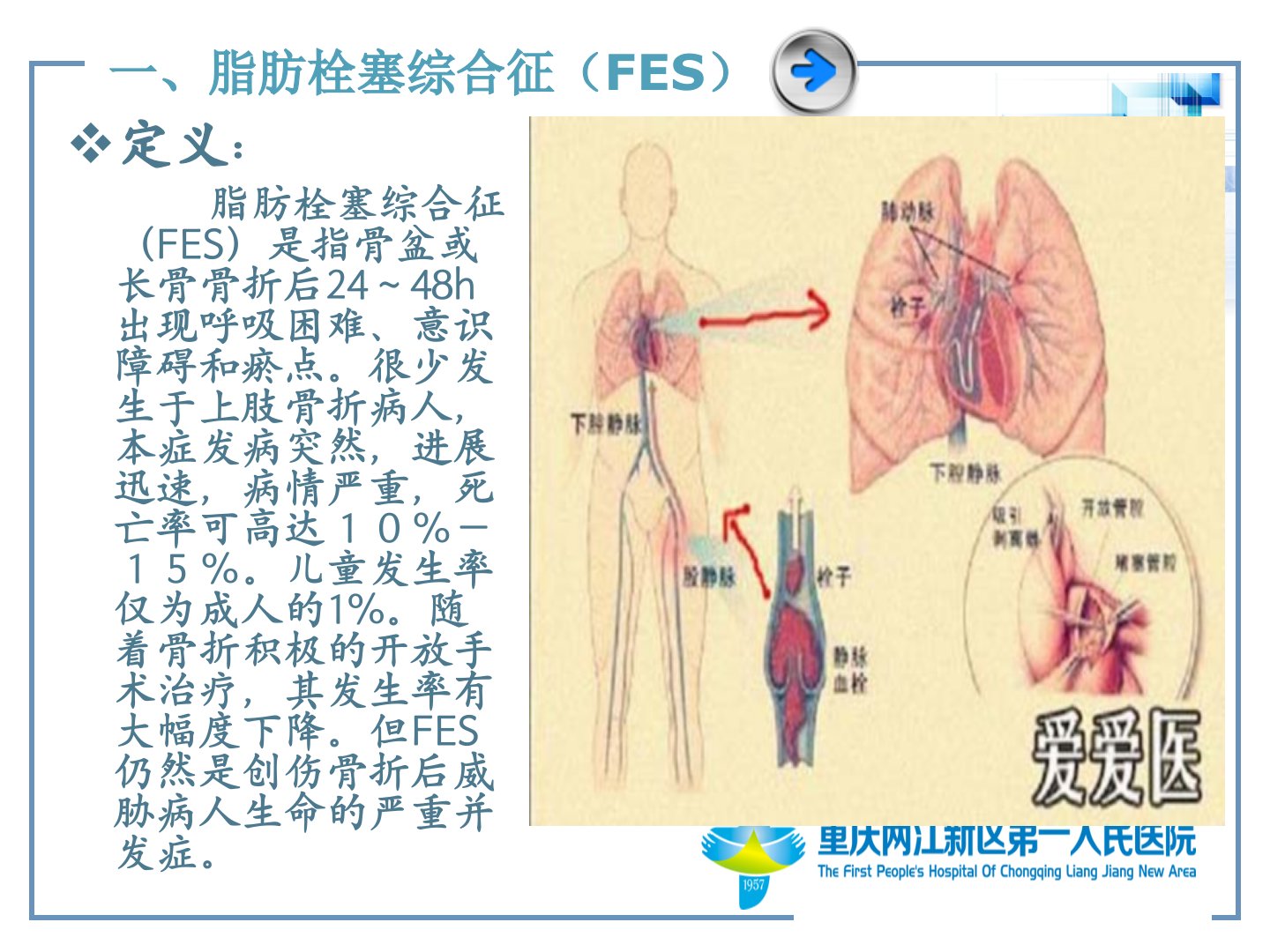 骨科常见并发症摘要一、脂肪栓塞综合征(FES)FES指骨盆或长骨骨折后2448h出现呼吸困难、意识障碍和瘀点发病突然且进展迅速病情严重死亡率较高。其发病机制包括机械性学说和化学性学说。临床表现差异大分为暴发型、完全型和不完全型。诊断主要依据皮下出血、呼吸系统症状和脑症状。治疗主要采取对症处理和支持疗法包括纠正休克、呼吸支持、减轻脑损害和抗脂栓的药物治疗。护理要点包括及时抗休克治疗、就地固定患肢、病情观察和症状护理。二、深静脉血栓形成(DVT)DVT是髋关节、膝关节置换术后最常见的并发症病因包括静脉血流滞缓、静脉内皮损伤和血液高凝状态。临床表现包括疼痛、肿胀、浅静脉曲张等严重时可继发肺栓塞。检查包括血液检查、超声多普勒等。治疗包括急性期治疗和慢性期治疗。健康教育包括戒烟、饮食调整、适当运动等。三、骨筋膜室综合征骨筋膜室综合征指骨筋膜室内的肌肉和神经因急性缺血、缺氧而产生的一系列早期症候群。病因包括骨筋膜室容积骤减和内容物体积迅速增大。临床表现以局部为主包括疼痛、指或趾屈曲状态等。治疗应立即切开筋膜减压术后需保持肢体功能位并进行功能锻炼。四、应激性溃疡应激性溃疡是骨折患者术后早期较为常见的