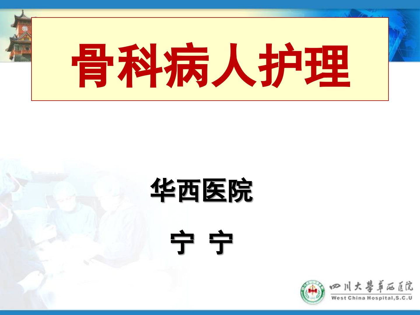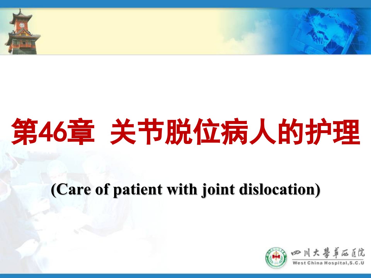 骨科病人护理华西医院宁宁上节回顾常见下肢骨折(股骨颈、股骨干、胫腓骨干骨折)骨盆骨折脊椎骨折脊髓损伤主要内容临床表现、处理原则及护理第46章关节脱位病人的护理(Careofpatientwithjointdislocation)学习目标(Objective)了解关节脱位的病因与分类熟悉关节脱位的临床表现与处理原则掌握关节脱位病人的护理主要内容一、关节脱位的定义、病因二、关节脱位的诊断、治疗、急救原则三、关节脱位的并发症、护理问题一、关节脱位的概况(一)定义:骨的关节面失去正常的对合关系创伤性病理性先天性习惯性按原因分(二)关节脱位的分类分类按时间分新鲜(<3周)陈旧(>3周)(三)关节脱位病理...