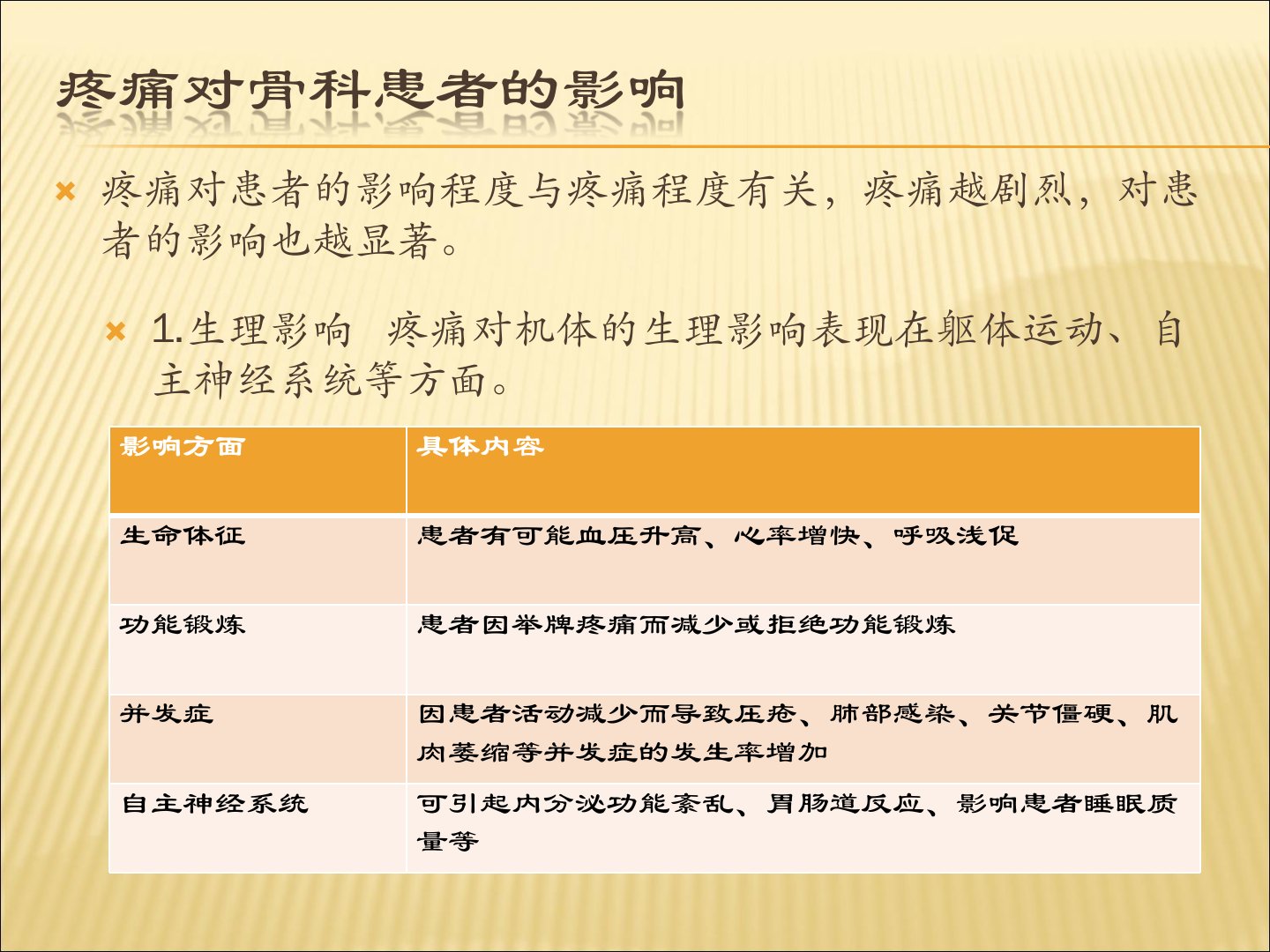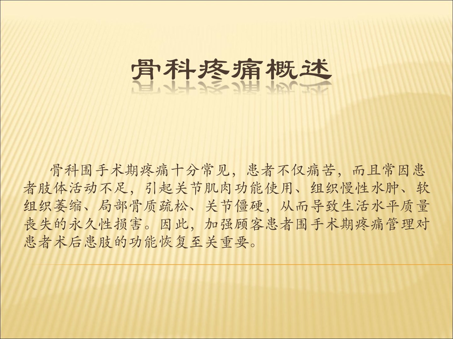 骨科围手术期疼痛常见不仅给患者带来痛苦还会因患者活动不足引发关节肌肉功能受限、组织水肿、骨质疏松等永久性损害严重影响术后功能恢复及生活质量。疼痛对骨科患者的影响是多方面的生理上影响躯体运动和自主神经系统心理上引发恐惧、焦虑社会经济上则延长住院时间、增加费用并影响正常生活。骨科患者疼痛的原因多样包括创伤手术(急性疼痛损伤部位明显活动时加重)、炎症(不同病菌引起疼痛程度不同)、急性缺血(如骨筋膜室综合症疼痛急且重)、恶性肿瘤(早期无疼晚期剧痛且难治)、神经性疼痛(放射性进行性加重)及截肢后疼痛(与精神心理因素相关)。此外疾病创伤、个体因素(年龄、性别、心理状态等)及医务人员因素(技术与知识水平、重视程度)也会影响患者疼痛体验和处理。