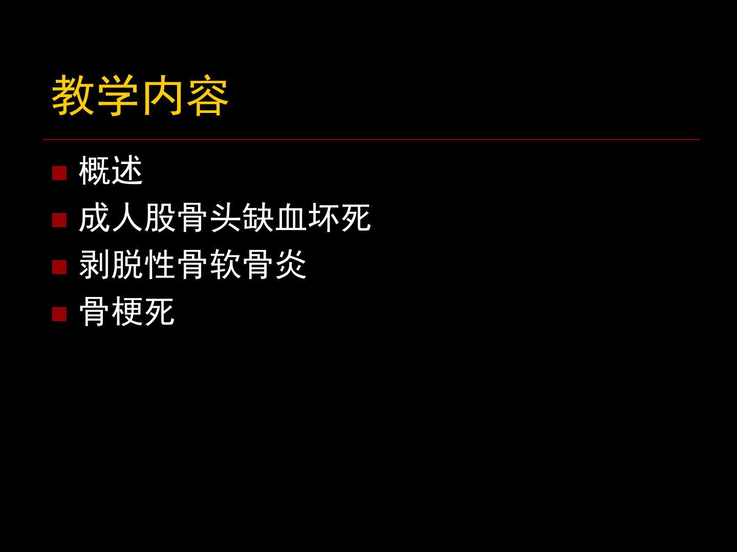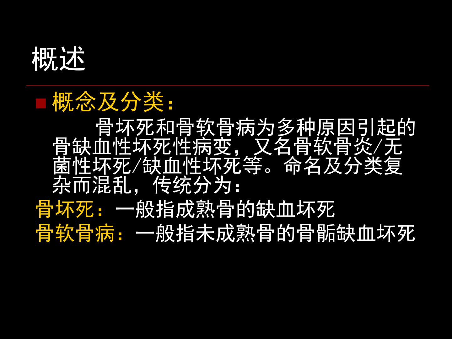 骨坏死和骨软骨病是多种原因引发的骨缺血性坏死性病变传统分为成熟骨缺血坏死(骨坏死)和未成熟骨骨骺缺血坏死(骨软骨病)可依原因分为血管闭塞或断裂、慢性反复创伤、原因不明三类。骨坏死原因包括外伤、先天缺陷、血管发育不良、激素、酗酒、血液病等病理上分为坏死期、成骨性肉芽组织增生期和继发改变。成人股骨头缺血坏死多见于3060岁男性以外伤、激素、酗酒为三大发病因素临床表现为疼痛、功能障碍、肢体短缩等X线、CT、MRI各有特征性表现。剥脱性骨软骨炎与创伤有关青少年多见好发于膝关节、肘关节X线、CT、MRI可显示死骨片、关节面骨缺损等。骨梗死好发于长骨干骺端或骨端急性期突发剧痛慢性期局部酸痛MRI呈地图样改变。股骨头骨骺缺血性坏死好发于314岁儿童X线表现分四期治疗不当可致股骨头扁、股骨颈短宽等继发改变。