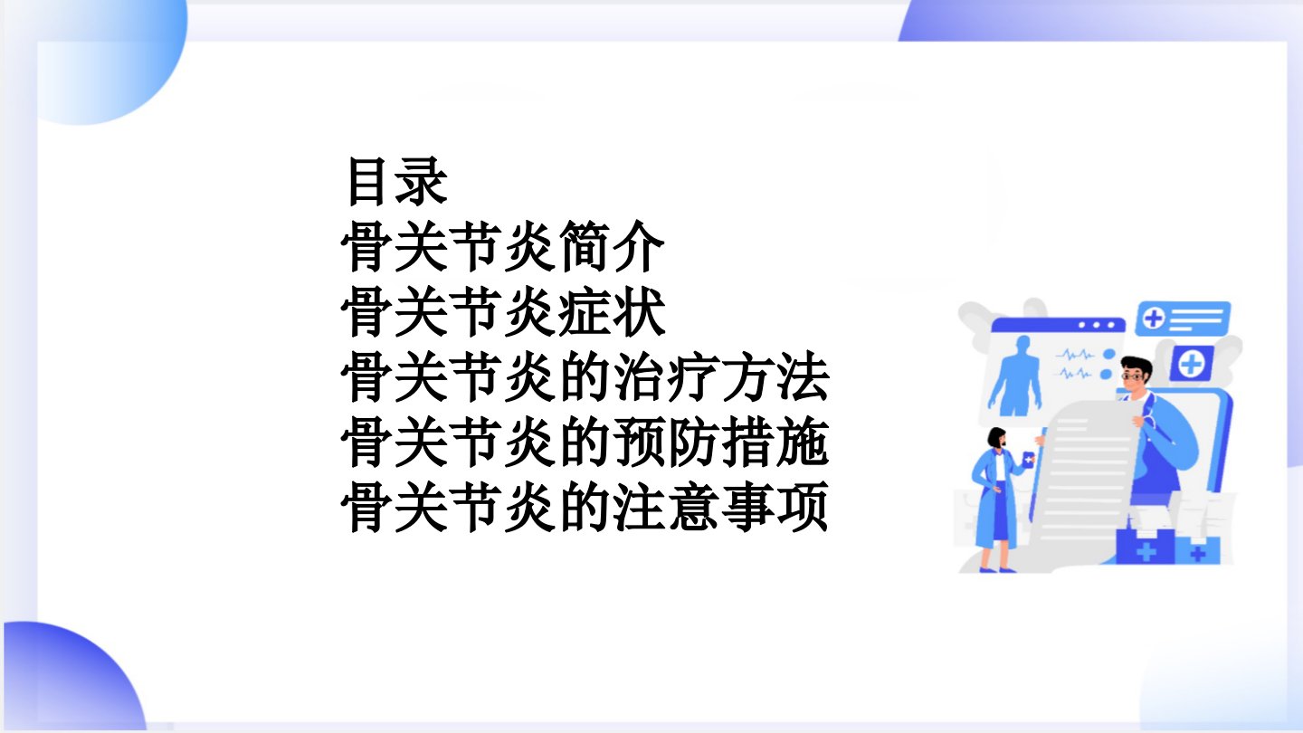 《骨关节炎科普讲座》摘要本次讲座围绕骨关节炎展开多方面科普。骨关节炎是影响关节软骨和骨质的慢性疾病多因关节过度使用、衰老、损伤等因素引发。其症状多样长时间关节疼痛是主要症状之一晨起或久坐后关节僵硬不灵活关节周围还可能出现轻度肿胀与红肿。治疗方法上药物治疗可用止痛药、非甾体类抗炎药缓解疼痛炎症;物理治疗包含理疗、运动疗法能增强关节稳定性与灵活性;严重病例需手术治疗如关节置换或关节镜手术。预防措施有:适度运动选适合方式并保持合理运动量;维持健康体重减轻关节压力;调整饮食多吃富含维生素和矿物质的食物。注意事项包括:避免长时间保持同一姿势;日常注意关节保护防止过度使用与受伤;定期复诊及时了解病情并调整治疗方案。