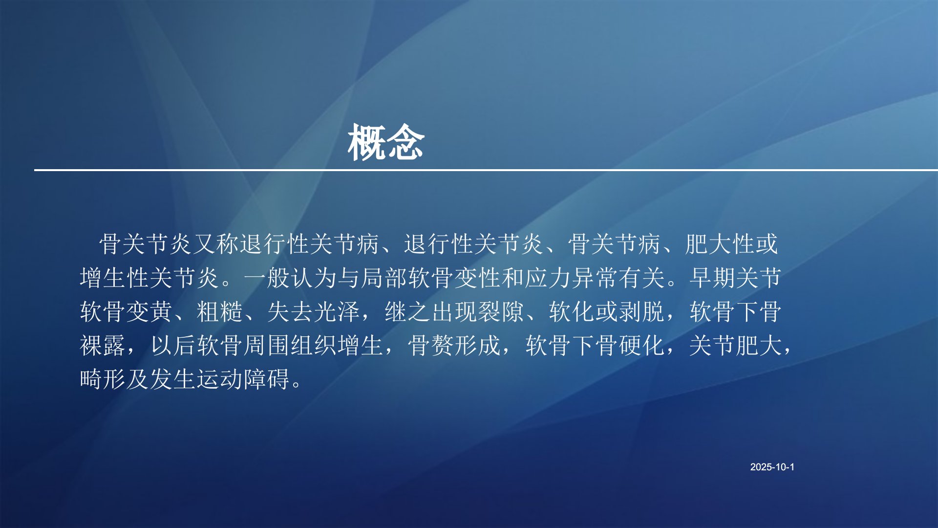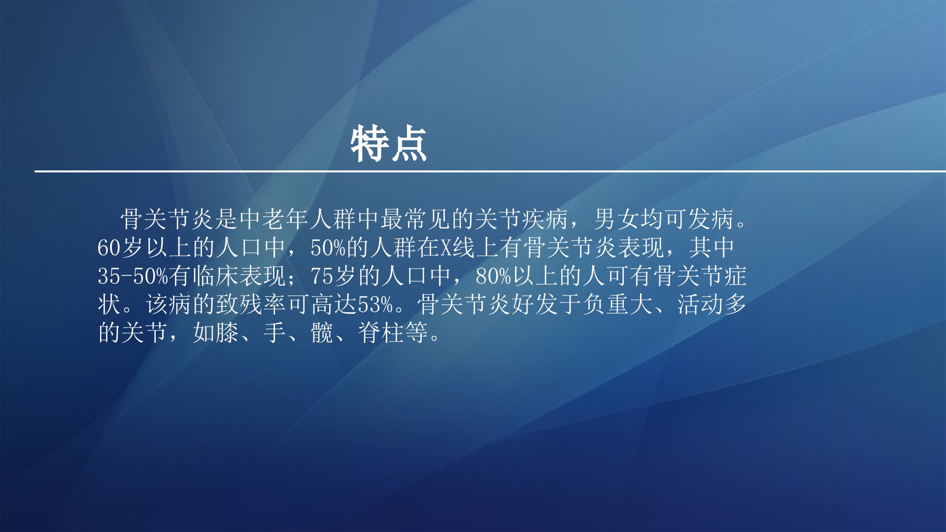 骨关节炎又称退行性关节病与软骨变性和应力异常有关常见于中老年人群致残率高达53好发于膝、手、髋、脊柱等关节可分为原发性和继发性两种。膝关节骨关节炎女性多见症状包括疼痛、肿胀、晨僵等X线可见关节间隙变窄等;髋关节骨关节炎则表现为跛行、下肢畸形等X线可见股骨头或髋臼软骨下骨硬化等。治疗旨在减轻疼痛、矫正畸形、恢复关节功能及改善生活质量包括:非药物治疗如病人教育、物理治疗、关节保护、活动支持及使用矫形鞋垫或支具;药物治疗轻中度患者可选对乙酰氨基酚中重度患者可考虑选择性COX2抑制剂等也可进行局部治疗和关节腔注射粘弹性补充剂;外科治疗对于症状严重且非手术治疗无效的患者可采取关节镜下手术、截骨术或关节置换术其中人工关节置换术被认为是治疗终末期或严重的关节炎最有效手段。