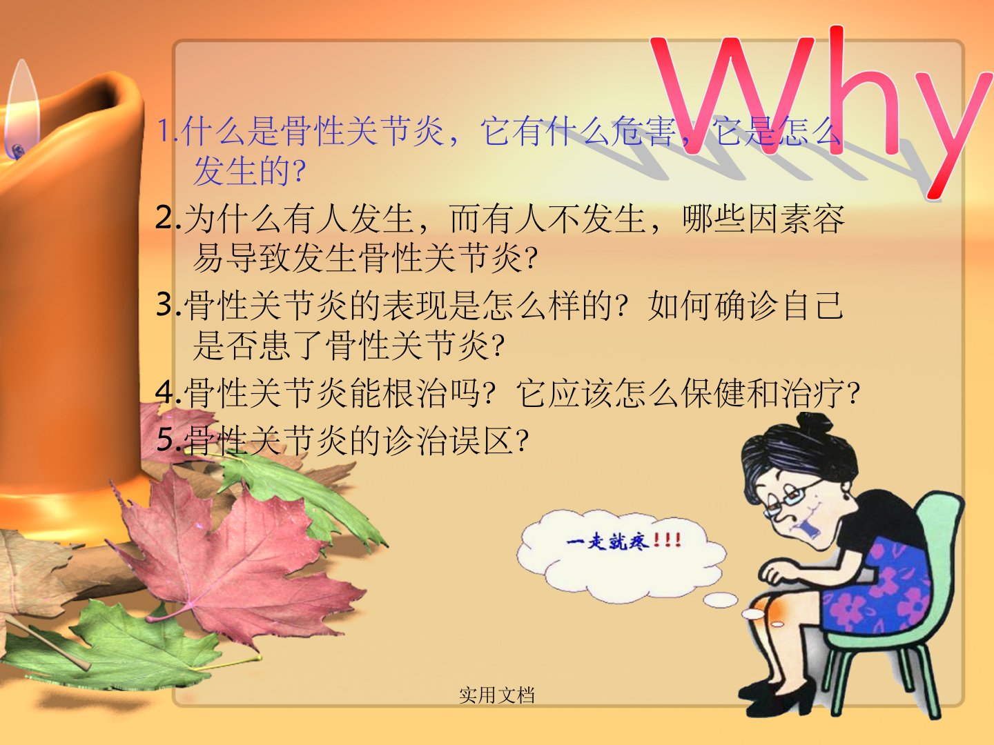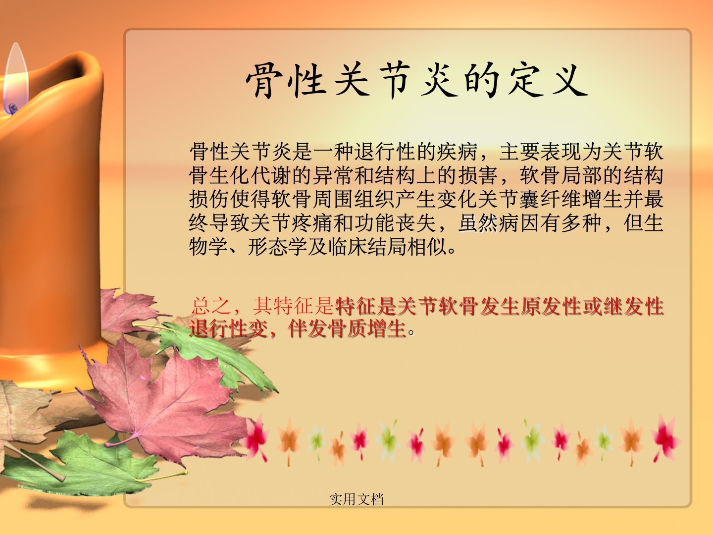 《骨性关节炎的诊治与保健》摘要本文围绕骨性关节炎展开阐述多方面内容。骨性关节炎是退行性疾病特征为关节软骨退行性变伴骨质增生根本在于关节软骨退行变致关节提前老化。它是老年人致残首要原因影响劳动力、生活质量、身心健康甚至缩短寿命。其发生受多种因素影响4065岁为高峰年龄50岁后女性患病比例超男性肥胖加重关节负担西方人髋、东方人膝骨性关节炎发病率高职业、关节手术史等因素也易致发病。临床表现有疼痛、晨僵、关节肿胀等可通过X线片、MRI等检查诊断。治疗无法根治目标是减轻疼痛、改善功能等采取非药物与药物治疗结合、必要时手术的个体化模式。非药物治疗包括患者教育、物理治疗等;药物治疗有消炎止痛药、软骨保护剂等。外科治疗目的在于进一步诊断、减轻疼痛等。同时文章指出诸多诊治误区如少动可保护关节、锻炼能磨掉骨刺等并给出日常生活小窍门。