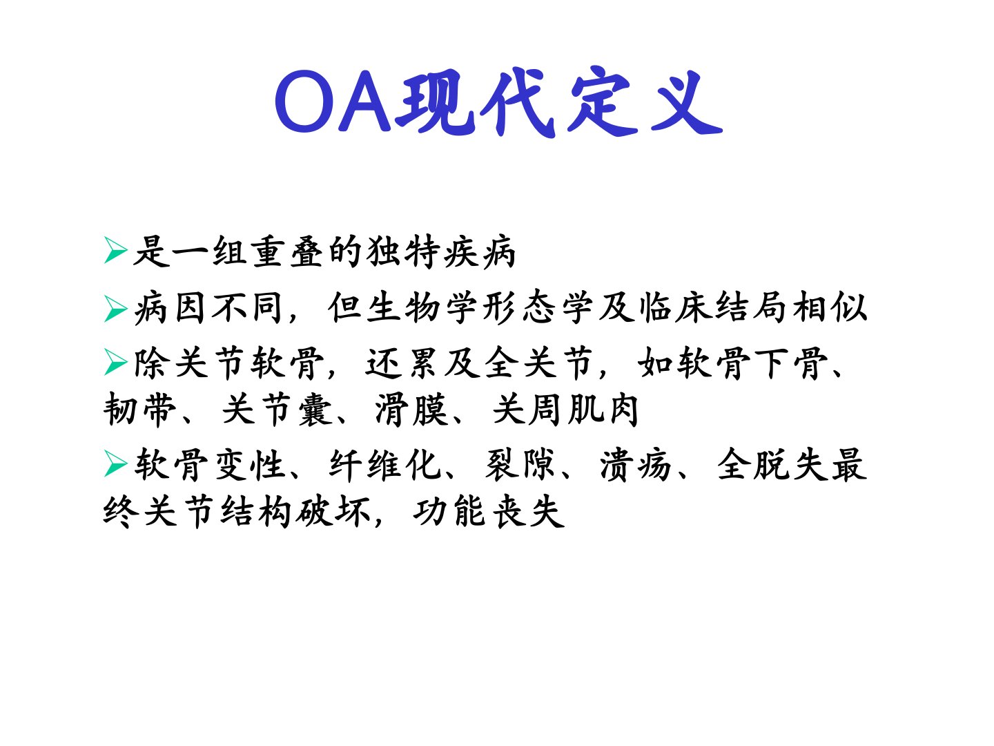 解放军总医院施桂英介绍了骨关节炎(OA)的药物治疗。OA是一组病因不同但生物学、形态学及临床结局相似的疾病累及全关节最终致关节结构破坏、功能丧失。其病理过程包括软骨纤维性变、糜烂、关节间隙变窄等诱因有年龄、关节超负荷、肥胖、遗传、外伤等。OA临床表现包括疼痛、触痛、变形等分类有局限性和全身性OA。OA不同阶段医学处理不同治疗目的为缓解疼痛、减轻炎症、延缓进展、改善功能、纠正畸形。药物治疗中一线药物包括对乙酰氨基酚等新的OA药物治疗分为改善症状和改变病情两类。双醋瑞因可抗炎止痛、促进软骨修复;硫酸氨基葡萄糖是关节软骨天然成份可抑制破坏关节软骨的酶阻断OA病理过程;硫酸软骨素安全性好可长期用。透明质酸是关节软骨基质和滑膜表层主要成份可维持关节软骨基质结构和功能。关节腔糖皮质激素可减轻膝OA疼痛和触痛、控制积液、改善功能。