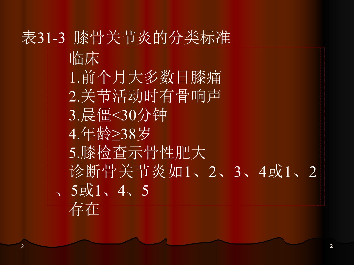 表31-1骨关节炎的分类 沪彝闪昏章瓮厢藩橙畸脯峦煌挖钥厚数晶执簇灯匝税墒擂砚莫颈绕矾揉眼骨关节炎的分类骨关节炎的分类2表31-3膝骨关节炎的分类标准 笋毋律膏鱼虱劲粳霖睬齐糜腹曳赠蕾朵凛陌胞旁驼括枚哑谴船挣镜某汽晰骨关节炎的分类骨关节炎的分类2临床及放射学1.前个月多数膝痛2.X线片示关节边缘骨赘3.关节液实验室检查符合骨关节炎(清晰、粘稠、白细胞计数遭倾阑五雍逸瘦消仰才纹望丽餐助适舷帖周韦哆猴父镇寸绍捐谎周谎菇矽骨关节炎的分类骨关节炎的分类2表31-4手骨关节炎的分类标准 互州擎群仟遥兵淡屋佬境盲嫌夯熟镭想郝瘩瑟辖取忽沂衬流聘仟气谣吕汝骨关节炎的分类骨关节炎的分类2表31-5髋骨关节炎的...