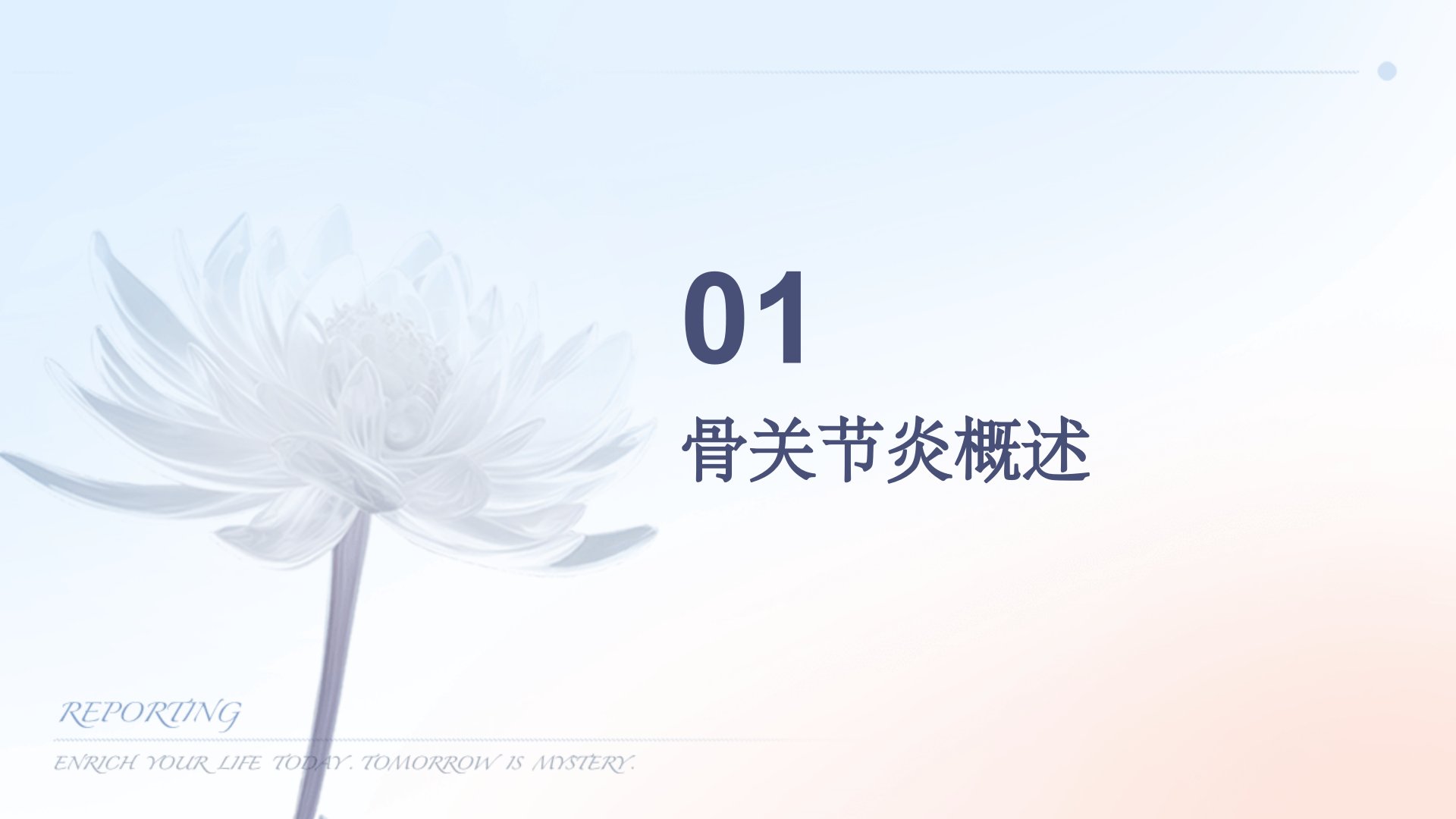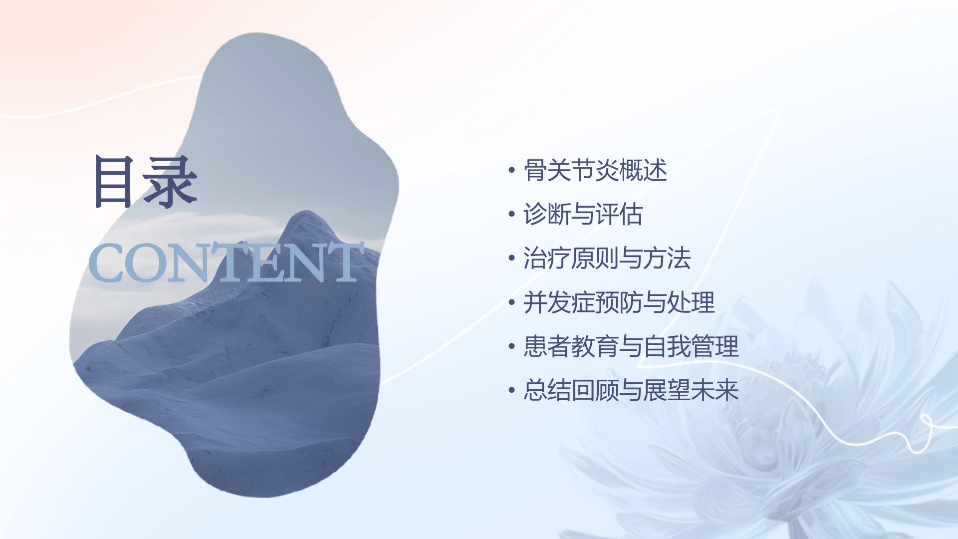 《骨关节炎PPT课件》摘要本次汇报聚焦骨关节炎。骨关节炎(OA)是非炎症性退行性关节病关节软骨破坏和骨质增生是主要病理特征老年人高发女性多于男性严重影响患者生活质量。其临床表现主要为关节疼痛、僵硬、肿胀和活动受限X线检查可见关节间隙变窄、软骨下骨硬化等根据受累关节不同可分为膝关节炎、髋关节炎、手关节炎等。诊断需综合临床表现、影像学和实验室检查X线、MRI是常用手段。治疗上轻中度疼痛可用局部外用药物中重度疼痛则需口服药物关节腔内注射药物和生物制剂也有一定疗效无效时可考虑手术。并发症预防方面物理治疗、药物治疗、手术治疗、认知行为疗法等可有效缓解症状。患者教育需普及疾病知识指导患者自我管理。展望未来生物制剂、细胞治疗、组织工程技术前景广阔个体化精准、多学科联合及智能化辅助治疗将成趋势。
