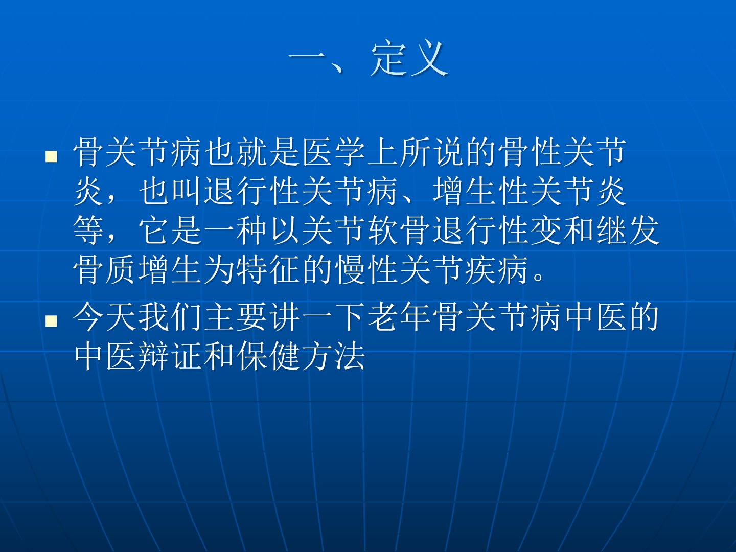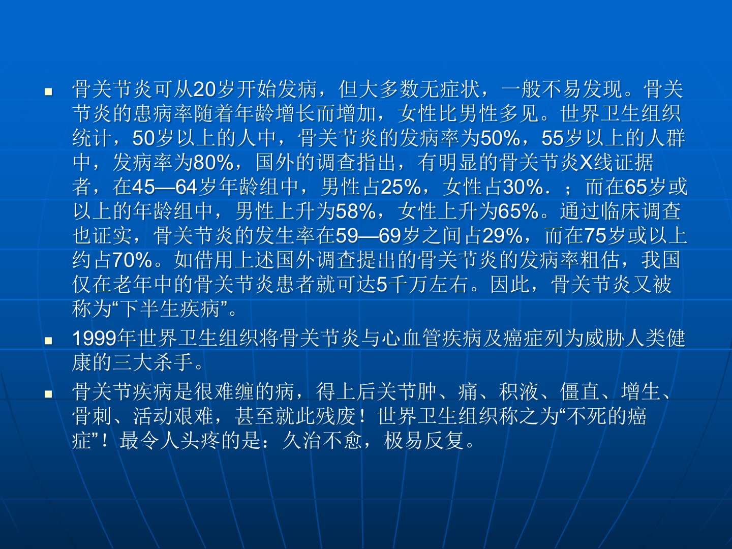 老年骨关节病的中医药治疗与保健摘要骨关节炎可从20岁开始发病多数无症状。其患病率随年龄增长而增加女性多于男性。50岁以上人群发病率为5055岁以上为8075岁以上约占70我国老年骨关节炎患者可达5千万左右被称为“下半生疾病”与心血管疾病及癌症并列为威胁人类健康的三大杀手之一。骨关节病是慢性关节疾病以关节软骨退行性变和继发骨质增生为特征。其病因分内因和外因内因是肝肾亏虚外因是风、寒、湿邪侵袭。症状主要是关节疼痛早期为钝性后期加重伴有晨僵、肿胀、活动受限等。疼痛原因是风寒湿侵袭或肝肾亏虚导致气血不通或不荣。X线检查可见关节边缘骨赘形成、间隙变窄等。中医分型与治疗分肝肾亏虚和风寒湿痹阻两类肝肾亏虚又分肾阳虚和肝肾阴虚分别用肾气丸、左归丸加减治疗;风寒湿痹阻分行痹、痛痹、着痹分别用防风汤、乌头汤、薏苡仁汤加减治疗。此外还有中药熏洗、隔姜灸结合手法治疗、经验方外敷等外治法。预防调理包括饮食调理、合理运动、适当晒太阳、避免外伤、健康减肥并推荐了食疗方。自我功能锻炼要贯穿治疗、康复、预防复发全过程。