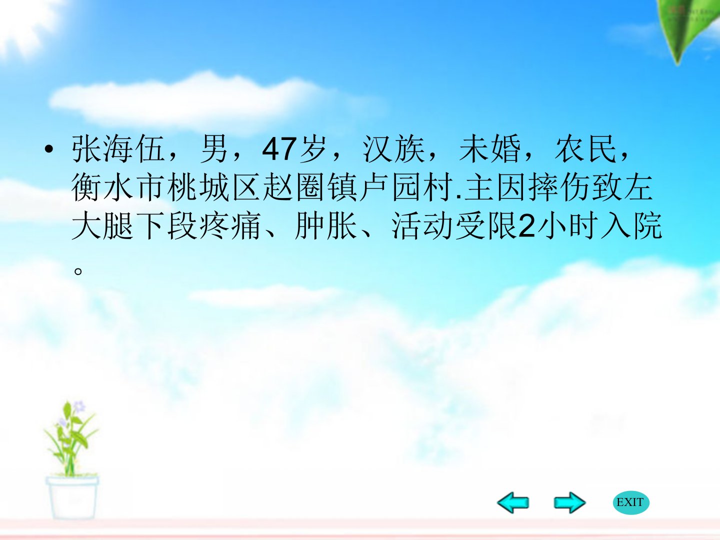 患者张海伍47岁男性农民因摔伤致左大腿下段疼痛、肿胀、活动受限2小时入院诊断为左股骨远端骨折。患者精神、饮食可无其他异常症状生命体征平稳骨科检查显示左大腿下段肿胀有压痛、骨擦音左膝关节活动受限。诊断依据包括明确外伤病史和骨科检查X线示左股骨下段粉碎性骨折。二级护理给予局部冰敷、牵引及消肿、止疼治疗待消肿后手术。股骨远端骨折指股骨下端9cm内骨折包括髁上和髁间骨折外侧髁比内侧髁宽大在股骨两髁间有一深凹为髁间窝膝交叉韧带经过其中。其分型包括AO分型和Muller分型。治疗上大多数建议手术治疗非手术很少应用。手术需注意病史、疼痛等情况影像学评估后选择手术体位和入路术中透视检查复位情况选择内固定物。术后次日开始肌肉等长收缩练习逐渐过渡到膝关节活动度练习。并发症包括创伤性关节炎等需采取相应预防措施。
