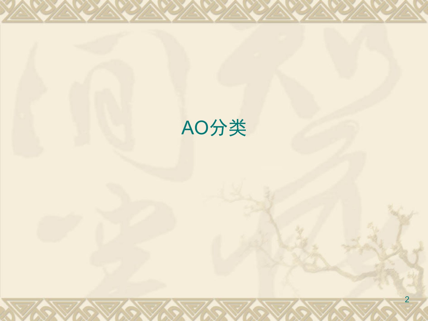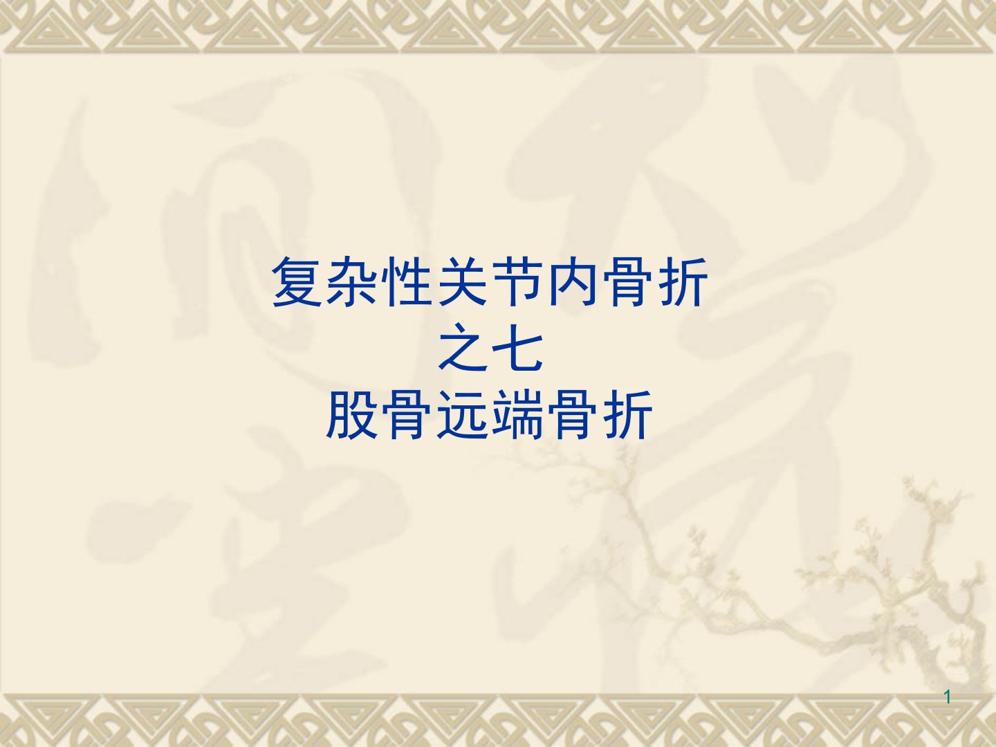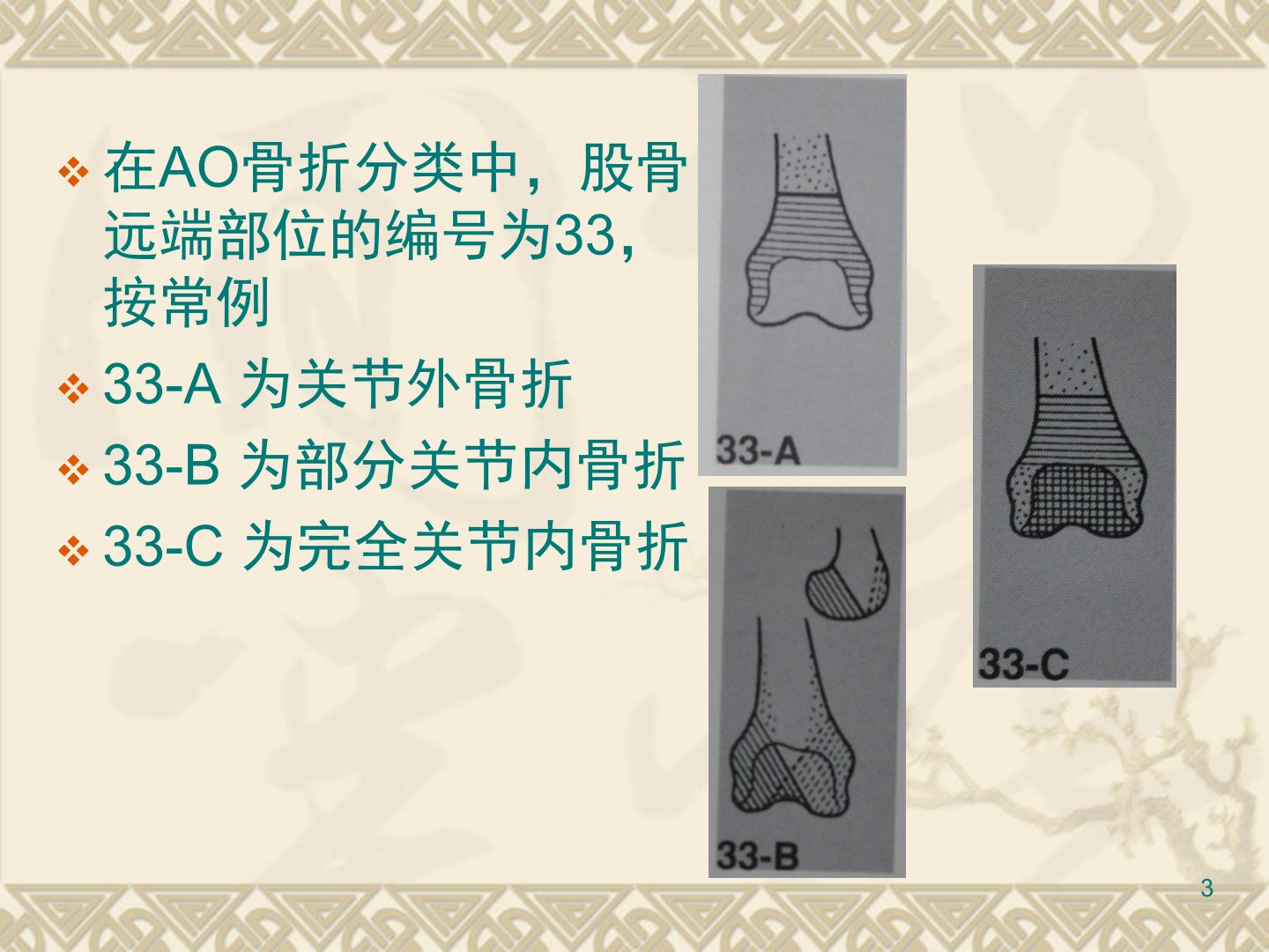 在AO骨折分类中股骨远端编号为33其中33A为关节外骨折33B为部分关节内骨折33C为完全关节内骨折且各有细分类型。股骨单髁骨折发生率低双髁更低且常合并其他损伤常规正侧位片有时无法真实反映损伤需做CT检查移位2mm以上需手术治疗。股骨内髁、外髁等骨折年轻人一般用2枚松质骨螺钉固定骨质疏松者需加用钢板。股骨内髁后部骨折剪力大易移位是关节承重部分不可切除必须对合平整。所有髁骨折内固定后都不会太坚强术后需石膏外固定46周8周部分负重1214周完全负重并进行康复治疗。股骨髁上及髁间骨折治疗方式不断演变60年代多用骨牵引和管型石膏80年代后内固定物改良效果提升内固定物包括髁部角钢板、动力髁骨螺钉、解剖型髁钢板、股骨远端外侧锁定钢板、交锁髓内钉等各有特点此外弹性钉适用于老年病人外固定支架适用于严重开放性骨折。