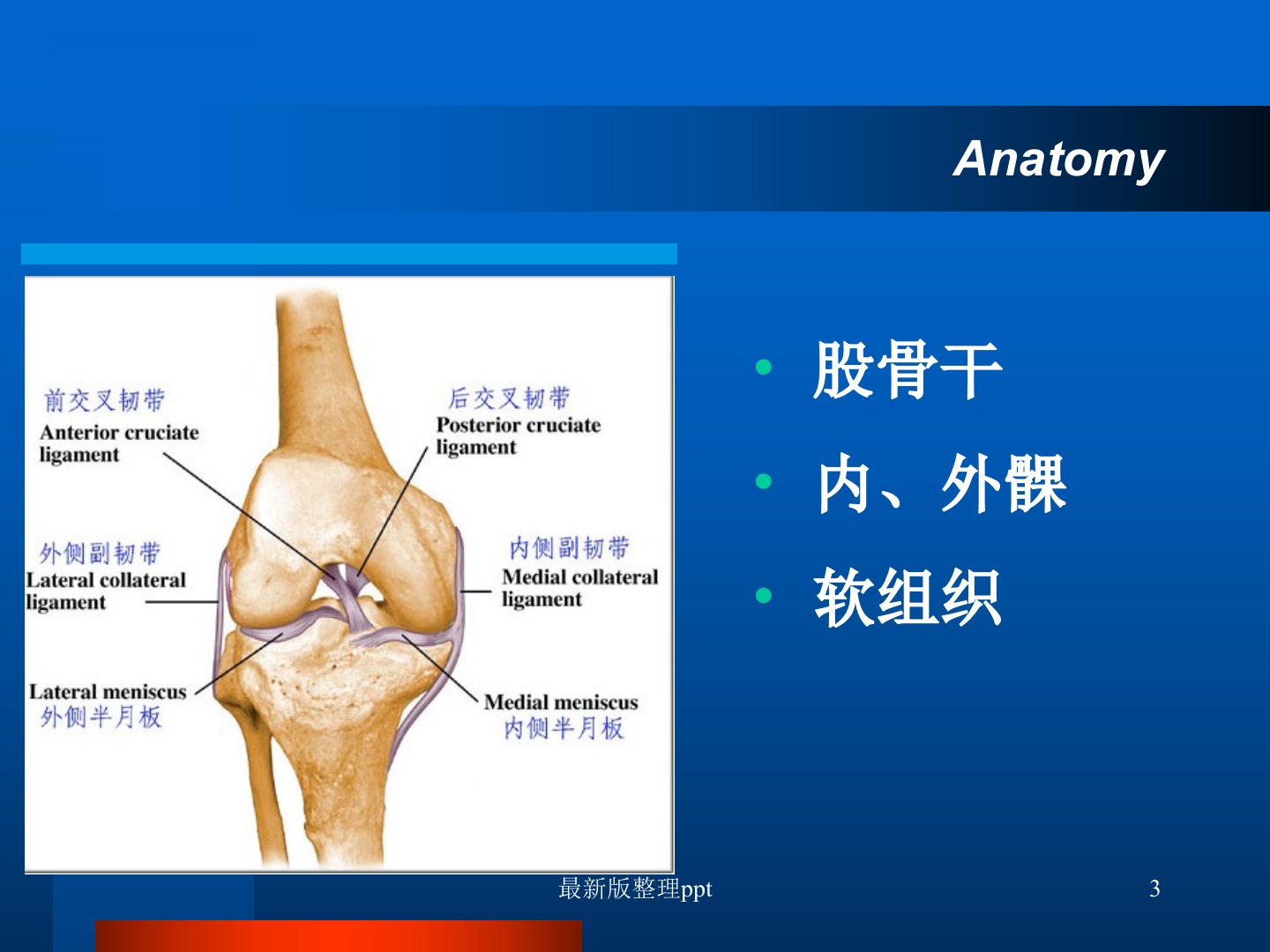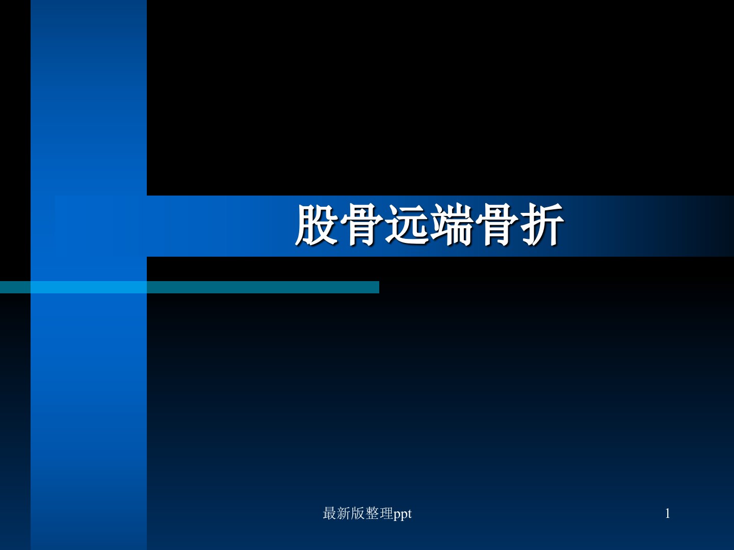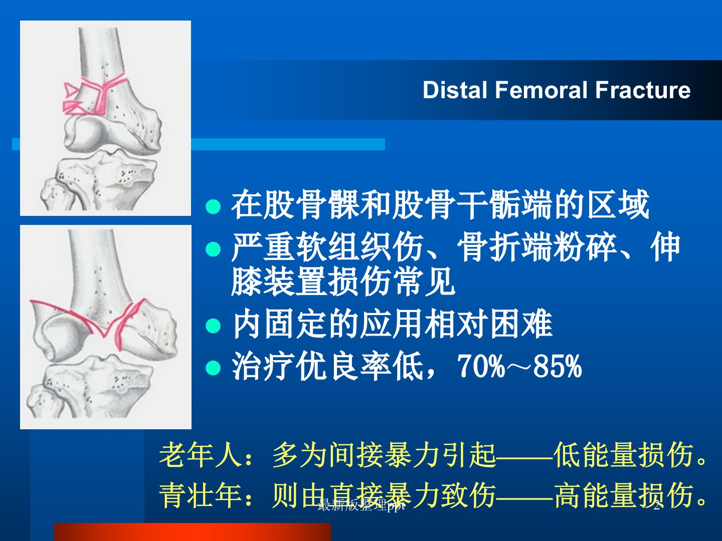 股骨远端骨折最新版摘要股骨远端骨折发生在股骨髁和股骨干骺端区域此处易伴严重软组织伤、骨折端粉碎及伸膝装置损伤内固定应用困难治疗优良率低于7085。损伤机制上老年人多为低能量间接暴力致伤青壮年则由高能量直接暴力引起。解剖上骨折移位多因大腿肌肉牵拉导致短缩、内翻畸形远端向后成角移位前移位和成角少见。分类包括Neer、Seinsheimer及AO分型用于描述骨折类型及移位情况。临床表现包括外伤史、畸形、疼痛、肿胀及功能障碍影像学检查常用X片、CT、MRI。治疗分非手术(闭合复位、骨牵引、石膏)和手术(内固定如95角钢板、DCS、股骨髁支持钢板、LISS系统、逆行髓内钉固定、外固定架)术后需抗生素、引流、CPM训练多数12周后可完全负重内固定物1824个月取出。并发症包括感染、延迟愈合、畸形愈合等。